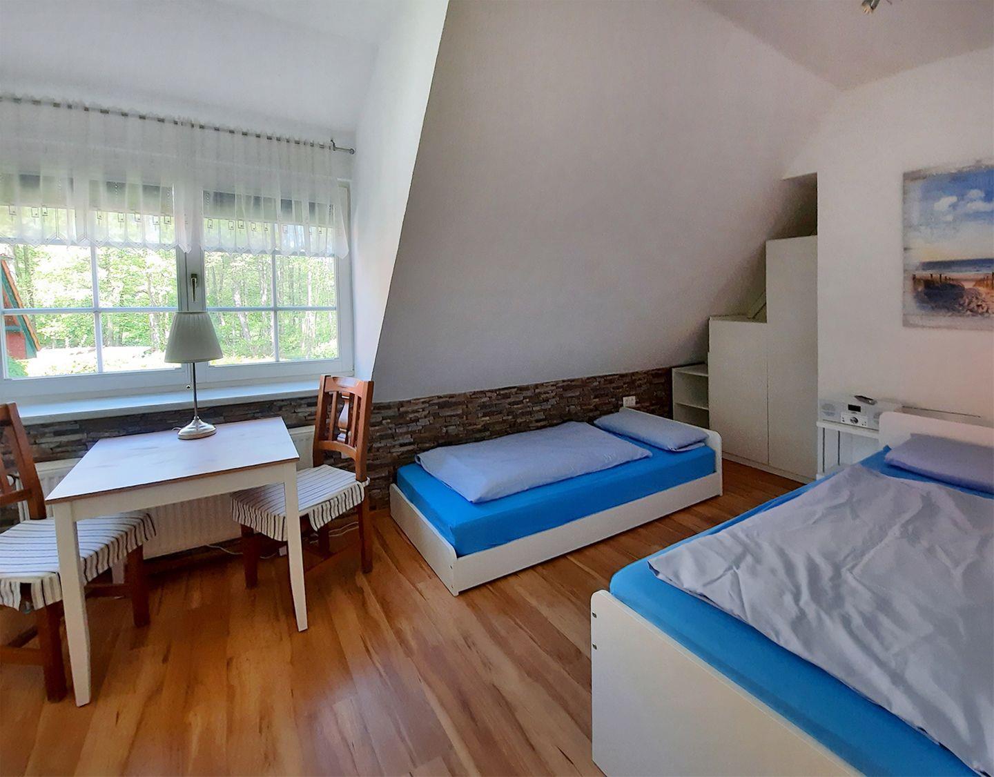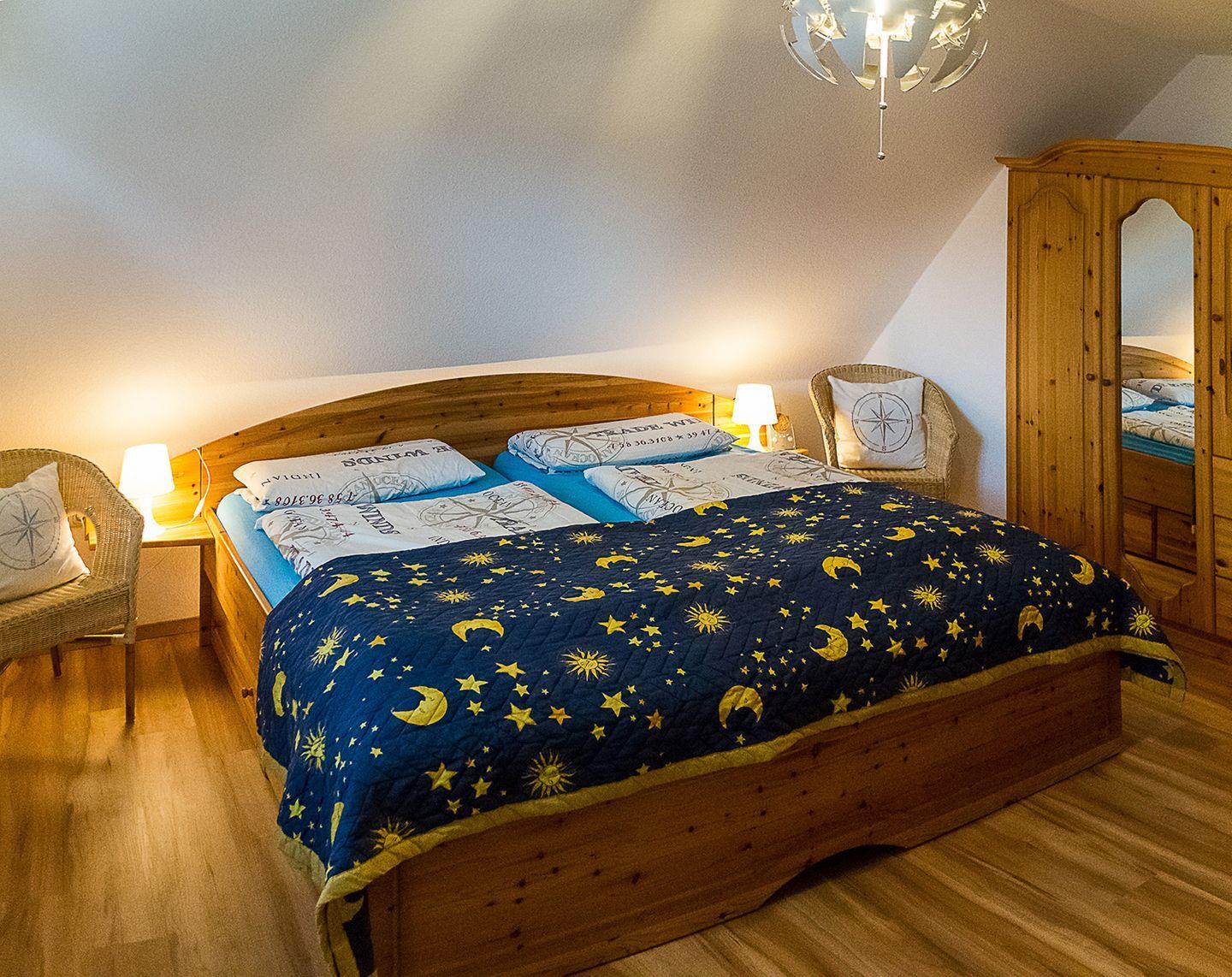 Im Obergeschoss befinden sich zwei Schlafzimmer: Das erste Schlafzimmer bietet ein großes Doppelbett (200 x 200 cm), während das zweite Schlafzimmer mit zwei Einzelbetten (90 x 200 cm), einem Rollbett (90 x 200 cm), einem Tisch und zwei Stühlen eingerichtet ist. Für zusätzlichen Komfort gibt es im Obergeschoss ein WC en Suite, das sich im ersten Schlafzimmer befindet.