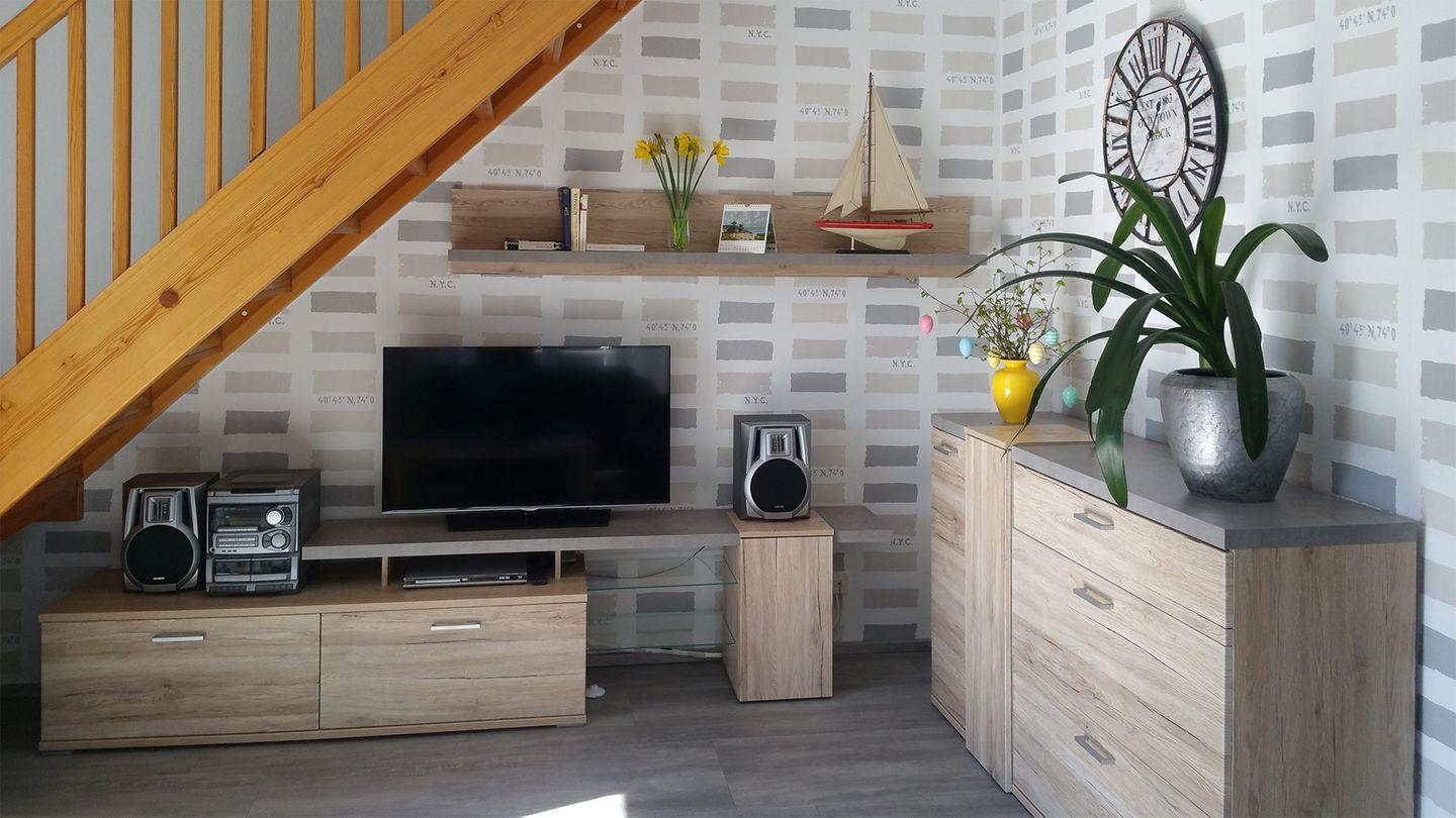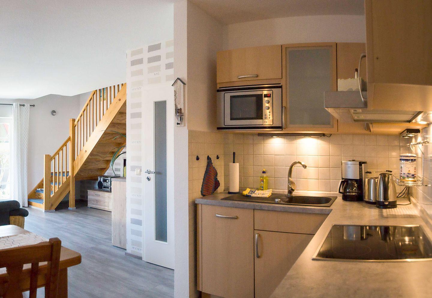 Diese moderne Ferienhaushälfte bietet auf ca. 73 m² Wohnfläche Platz für bis zu 5 Personen und befindet sich in einer ruhigen Lage, ideal für Familien oder kleine Gruppen. Im Erdgeschoss erwartet Sie ein lichtdurchfluteter Wohn-/Essbereich mit einer bequemen Sitzgruppe, einem Esstisch sowie einem Radio mit CD-Player und SAT-TV. Die offene Küchenzeile ist gut ausgestattet mit einem Backofen, Geschirrspüler, Herd mit Cerankochfeld, Kaffeemaschine, Kühlschrank mit Gefrierfach, Mikrowelle, Mixer, Toaster und Wasserkocher.
