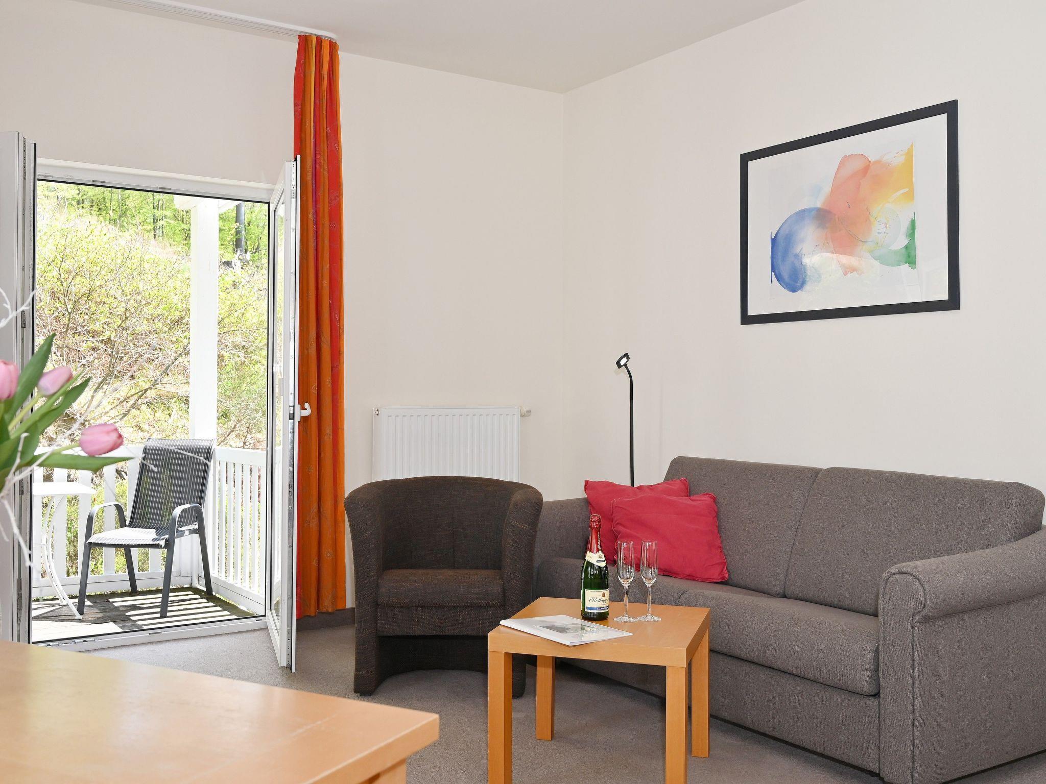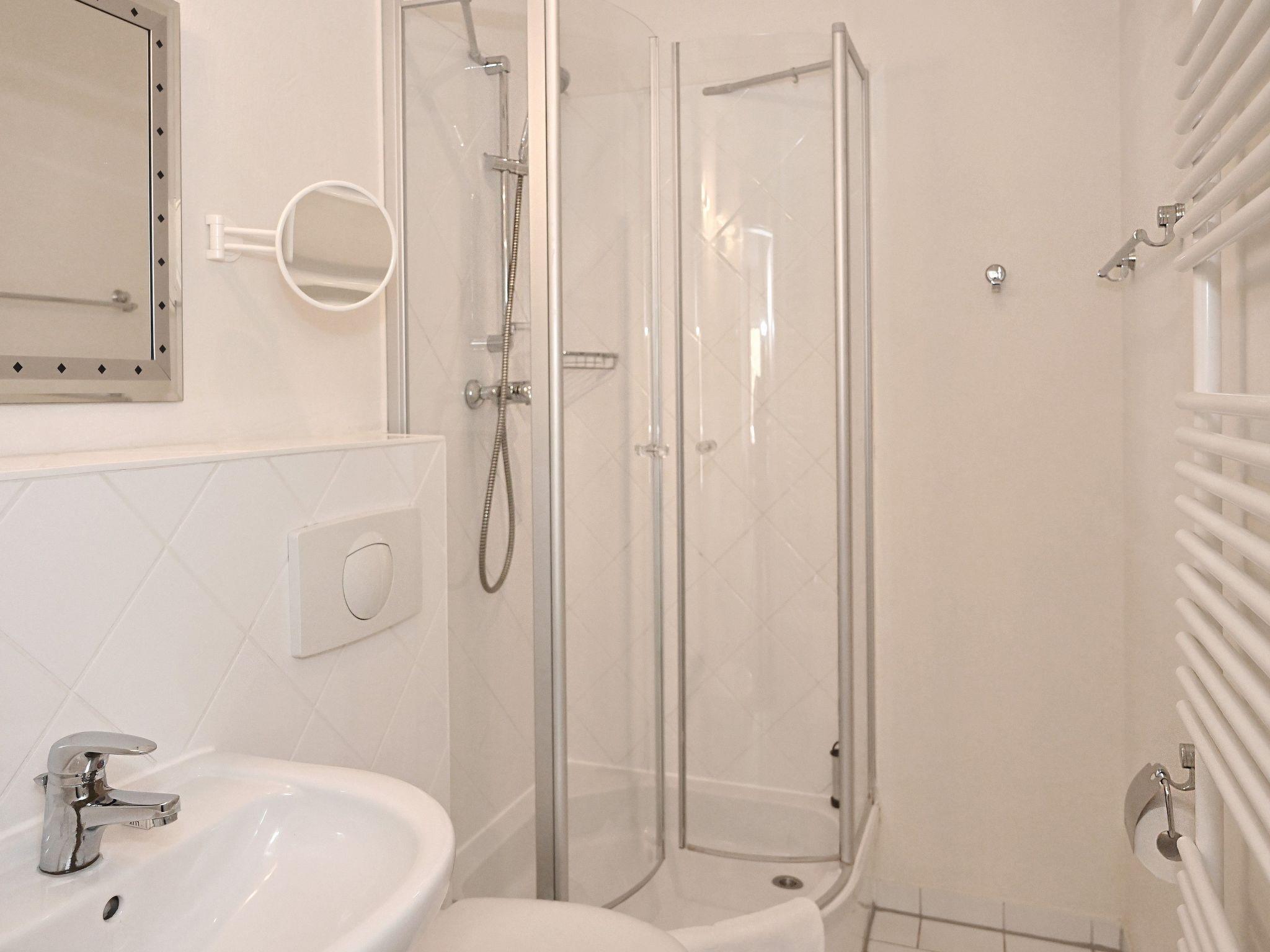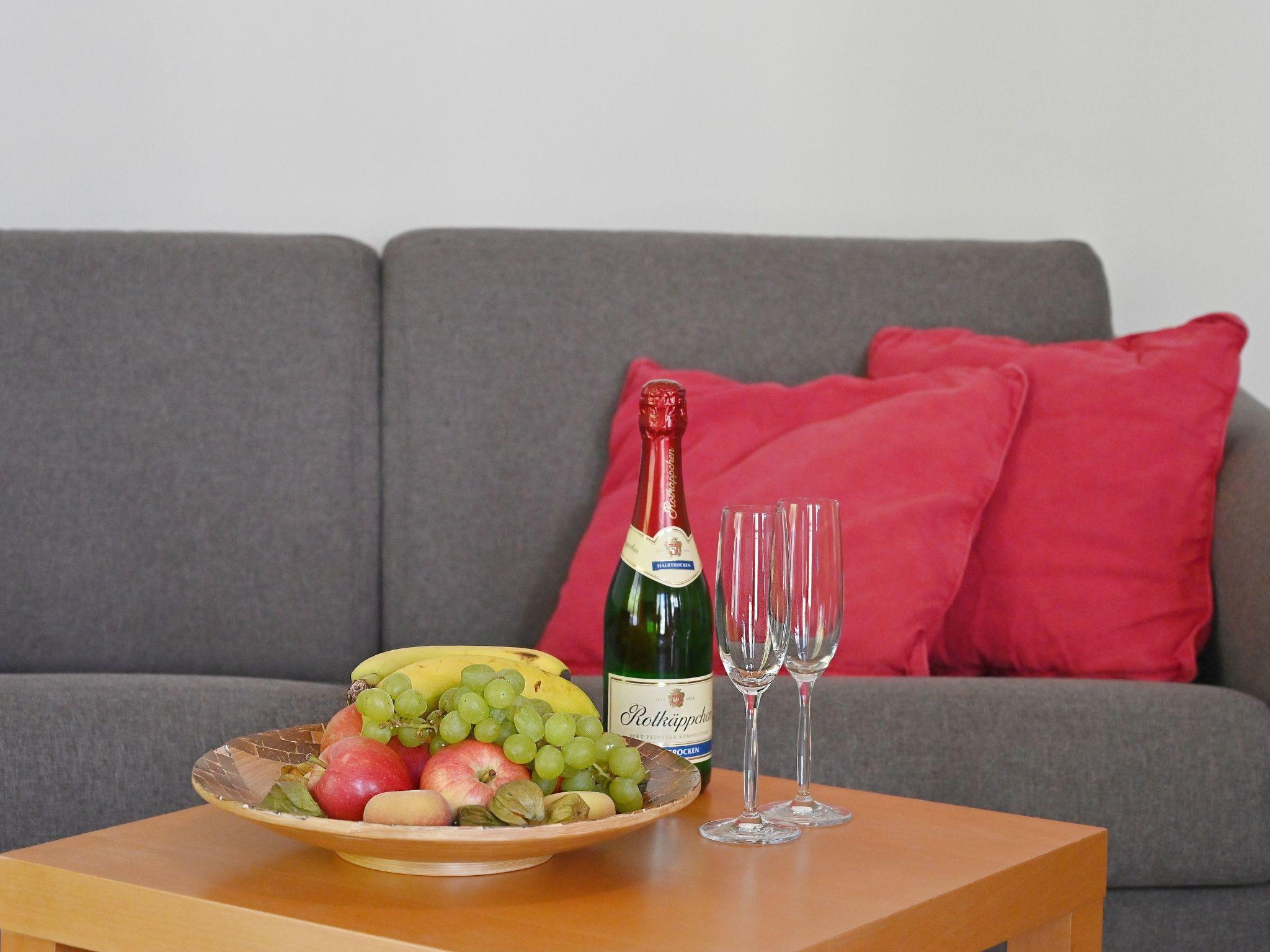 The two-room holiday flat no. 7 with a size of 48 m² for two to four persons is located on the first floor (on the side of the Granitzwald, not facing Wilhelmstraße). There is a double bed (1.80m x 2.00m), a double sofa bed, a kitchenette with microwave, oven and freezer compartment and a bathroom (shower, WC). A cot and high chair can be added free of charge on request. Free WLAN is of course also available.