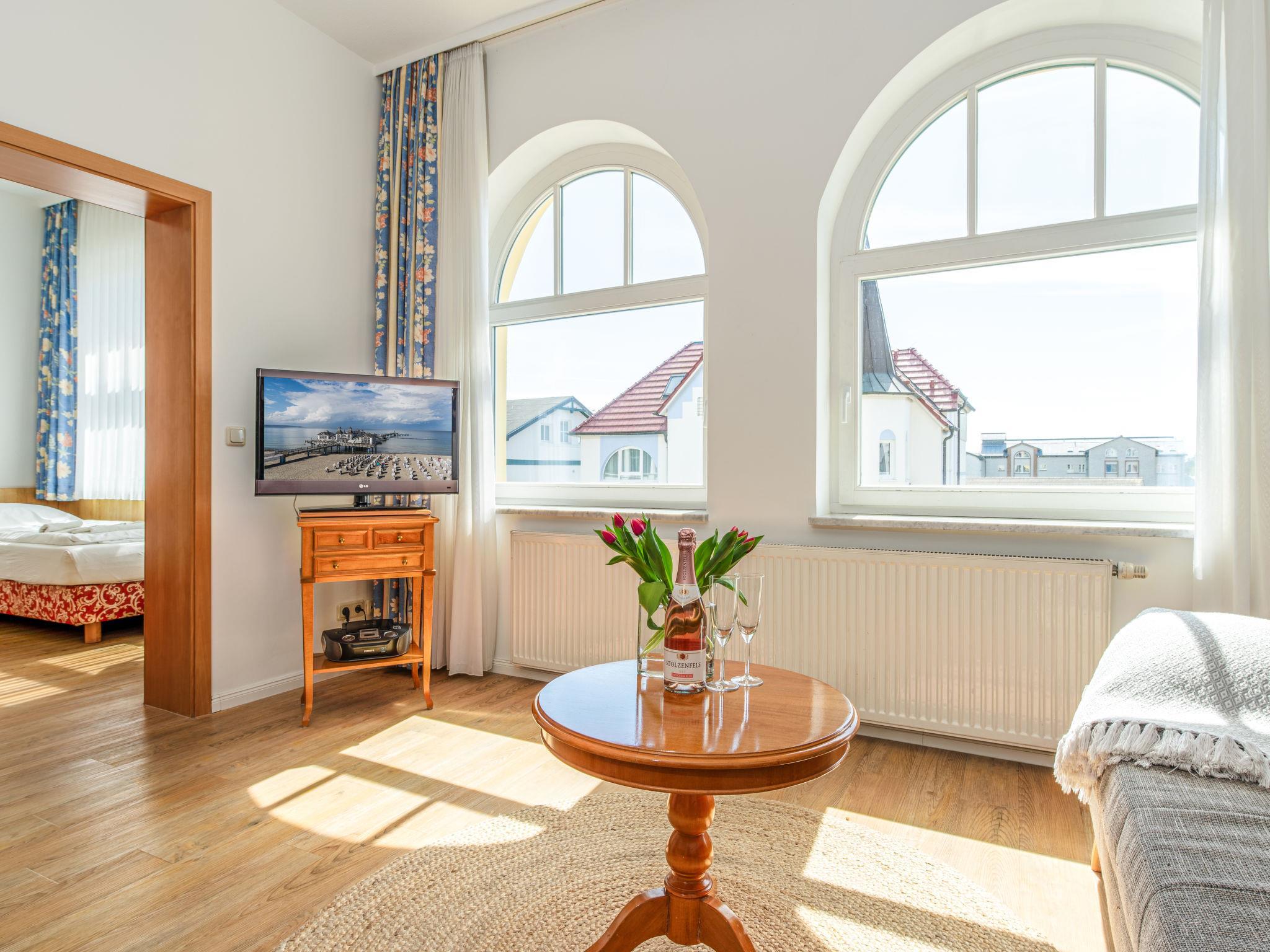 Beautiful, historical villa "Stolzenfels", 3 storeys, renovated in 2024. 12 apartments in the residence. In the centre 300 m from the centre of Sellin, 6 km from the centre of Göhren, 12 km from the centre of Binz, residential area (villas), 500 m from the sea. For shared use: property 800 m2. Terrace (12 m2), garden furniture, barbecue. In the house: lift. Breakfast possible (extra). Parking (extra) on the premises. Parking space or garage only for small to medium-sized cars. Supermarket 500 m, bakery, café 600 m, 5 minute walk to the centre, bus stop 100 m, sandy beach 500 m, indoor swimming pool 600 m. Nearby attractions: Seebrücke 900 m. Water park 'RÜGEN AHOI!' with pirate ship as super fun for the kids, outdoor pool, sauna area, sunbathing lawn and beach volleyball court approx. 600 m. Covered bicycle parking available.