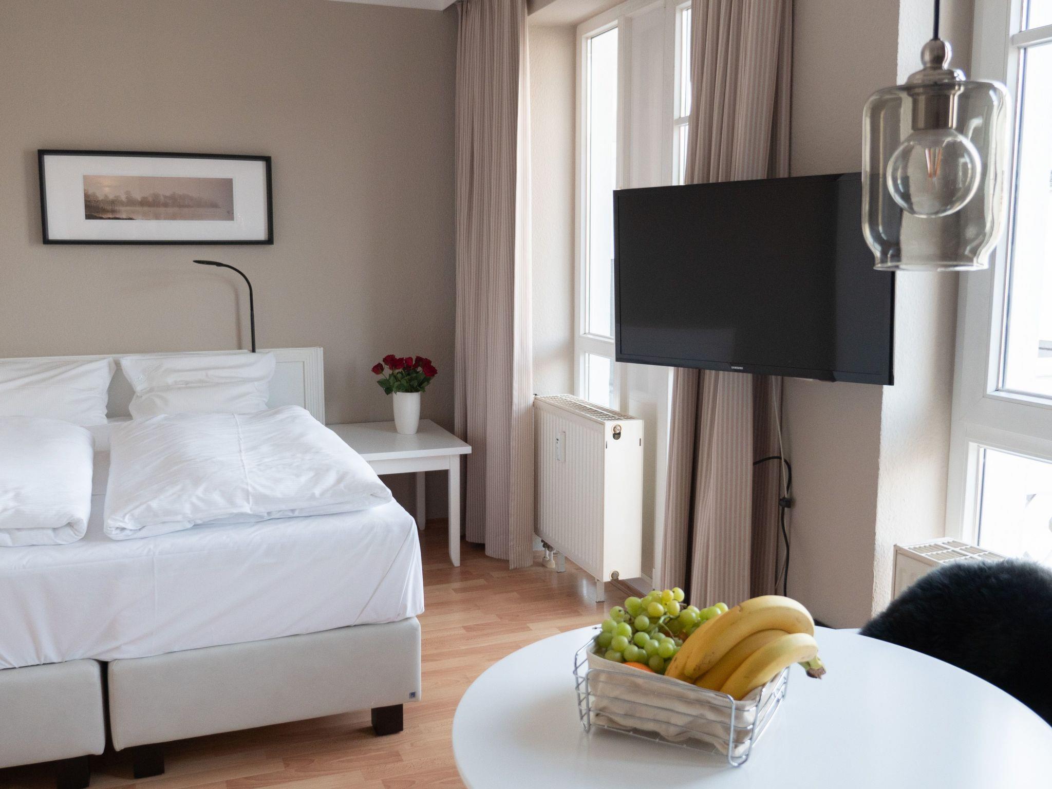 Inside the flat, a high-quality box-spring bed awaits you, surrounded by organic cotton bedding to make your nights especially comfortable. For your entertainment, you will find a TV, free WiFi and internet TV as well as a free Netflix account for unlimited streaming. The furnishings also include a modern kitchen with a 2-ring hob and a filter coffee machine. For your comfort, the bathroom is equipped with a shower and a fixed hairdryer.