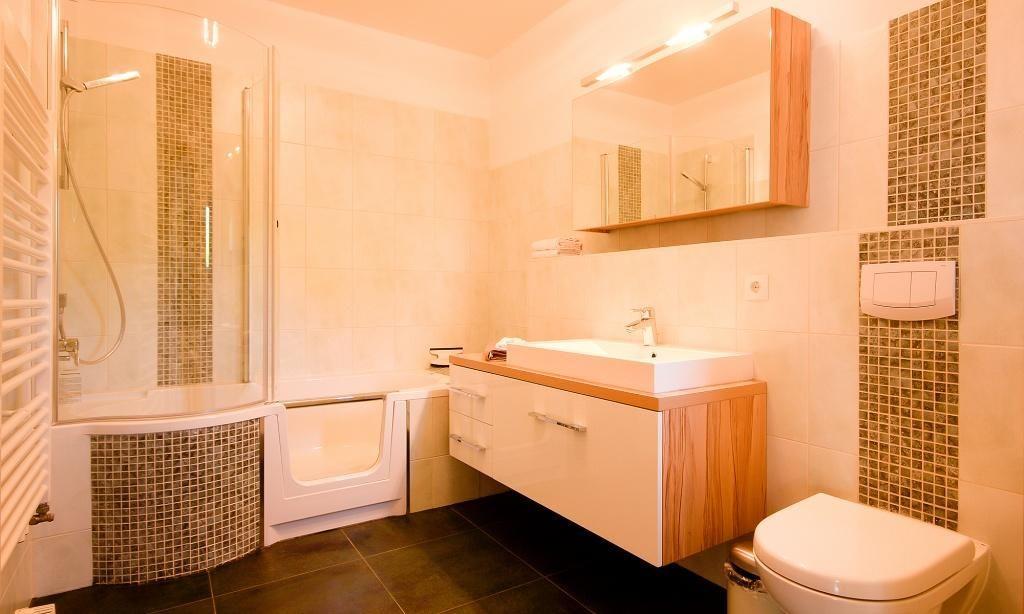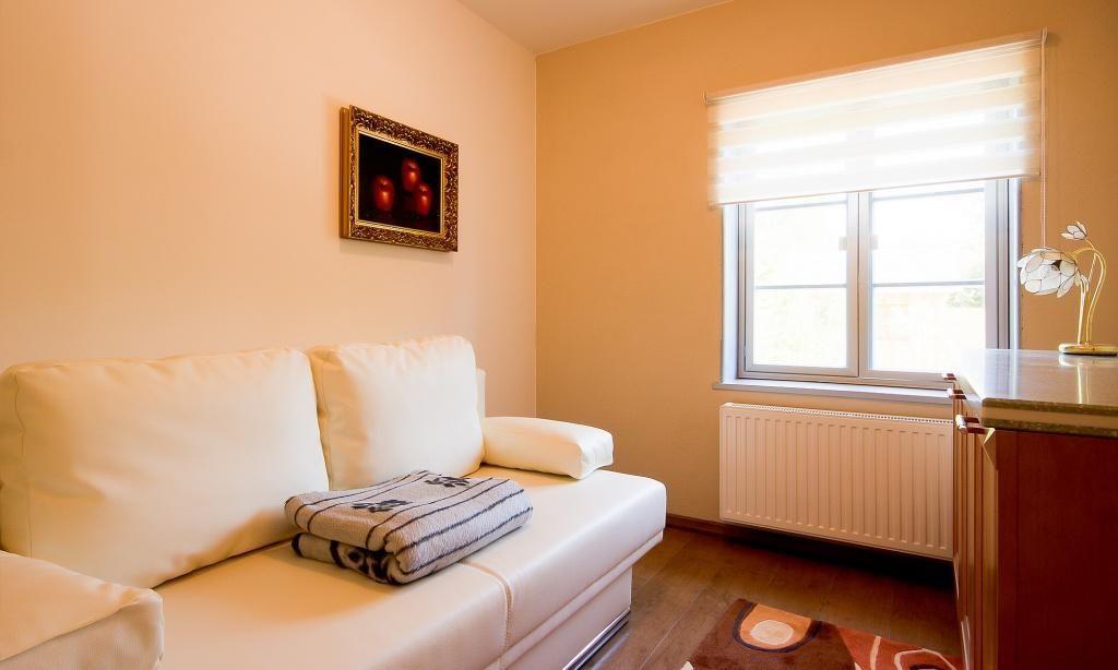 Die Erdgeschosswohnung empfängt dich mit einem hellen Wohnraum, der über eine gemütliche Sitzecke verfügt. Die komfortable Küchenzeile mit Essbereich am Fenster ist unmittelbar in den Wohnraum integriert. Das Schlafzimmer ist mit einem Doppelbett und einem großen Kleiderschrank ausgestattet. Ein separater Raum mit einer Schlafcouch bietet eine zusätzliche Aufbettungsmöglichkeit für zwei Personen. Zur Wohnung gehört ein exklusives Bad mit Dusche und WC.