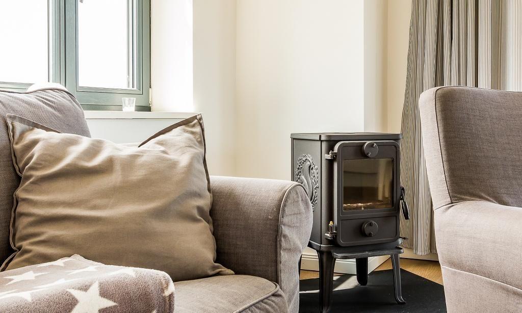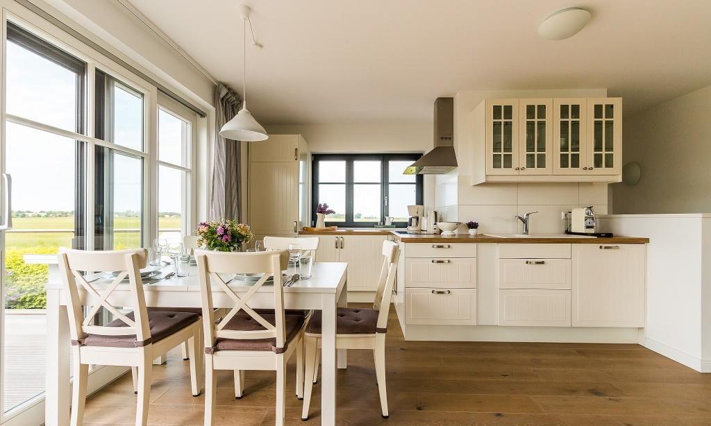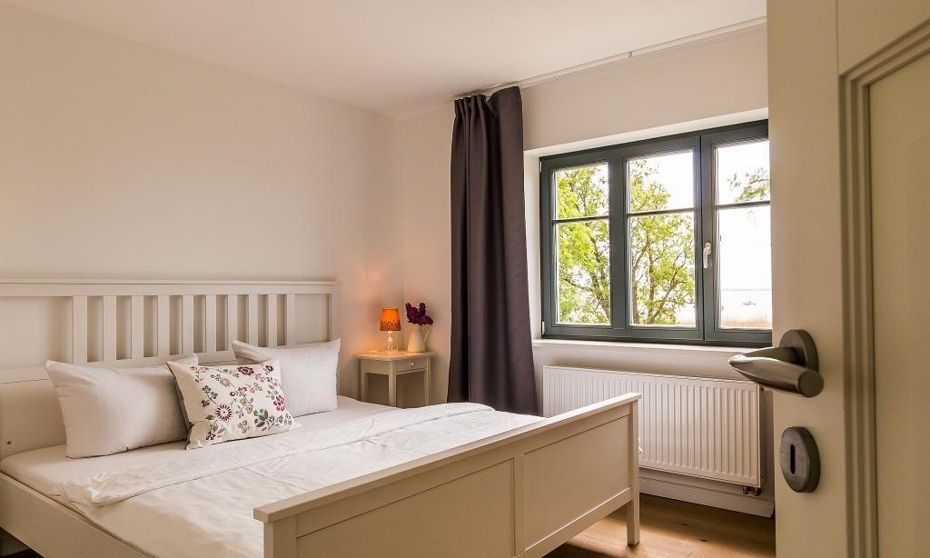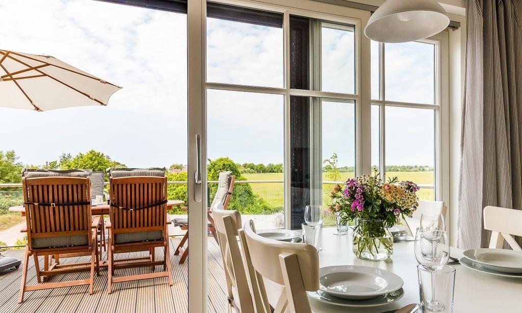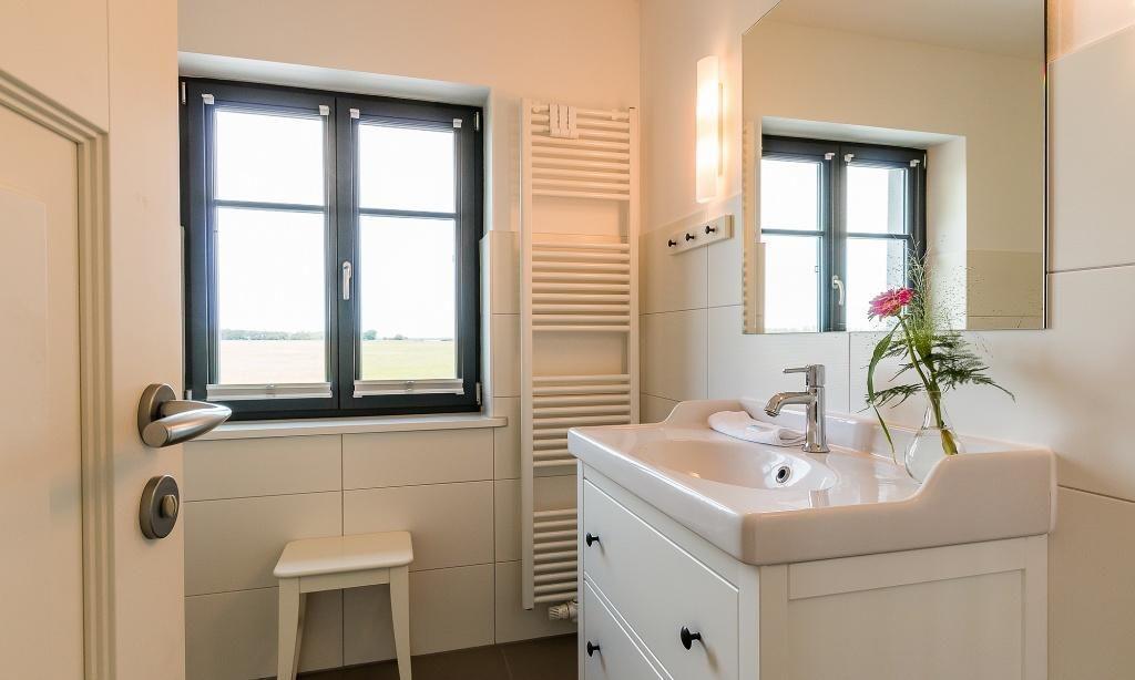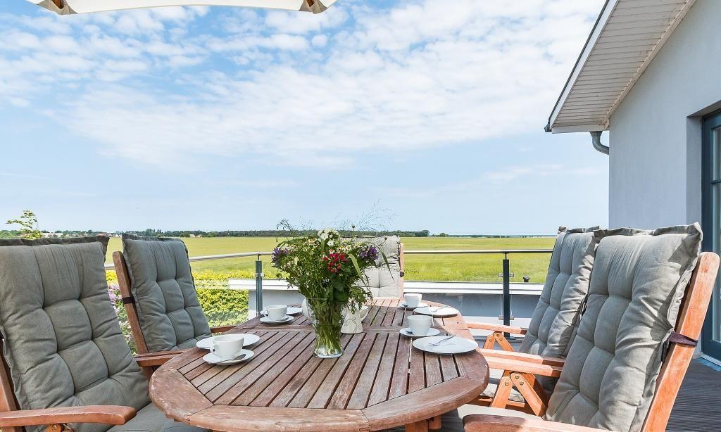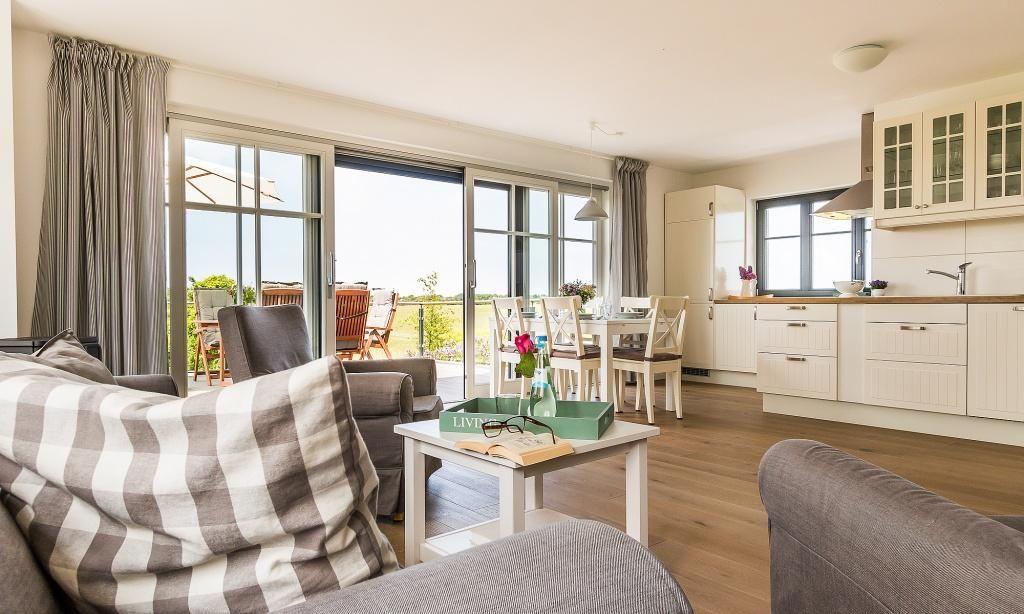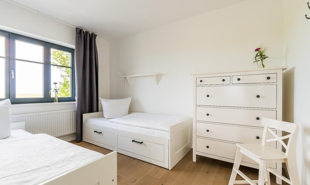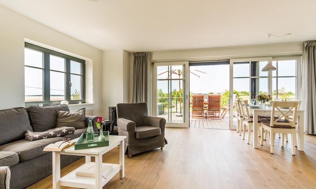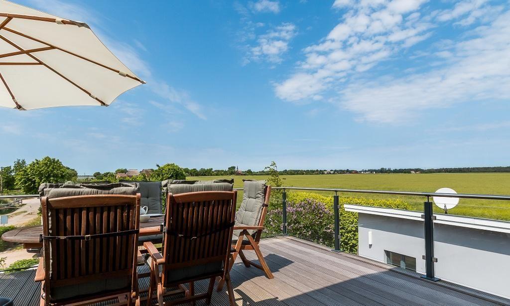 Im Obergeschoss mit separatem Eingang erwartet dich der moderne Wohnbereich mit einer gemütlichen Sitzecke am Kaminofen. Die offene Küche und der Essbereich am Panoramafenster fügen sich harmonisch ein. Ein Schlafzimmer mit einem Doppelbett und zusätzlichem Einzelbett sowie ein zweites Schlafzimmer mit zwei Einzelbetten laden zum Ausruhen ein. Das Bad mit Dusche/WC rundet die Wohnung ab. Auf der großen Dachterrasse genießt du einen traumhaften Blick zum Bodden und über die Felder. Hier fängt dein Urlaub an. Es handelt sich um eine Nichtraucher-Wohnung, Haustiere sind nicht gestattet.