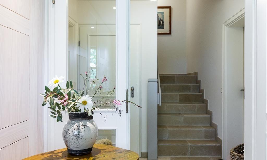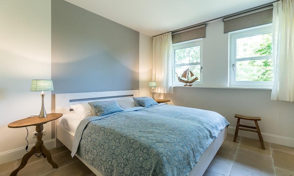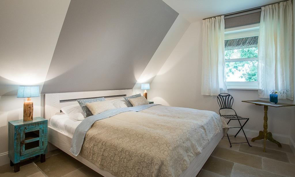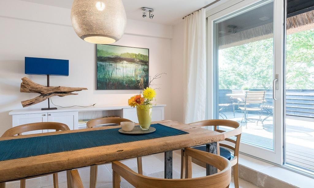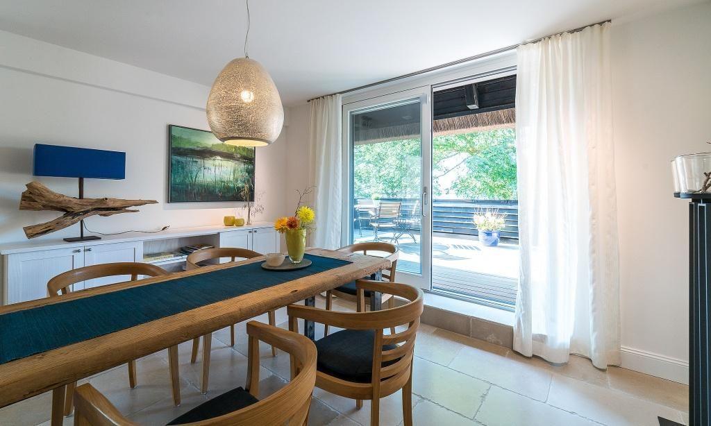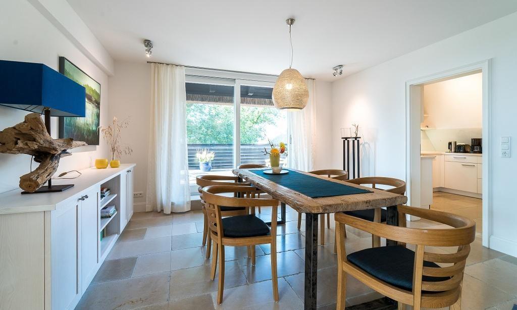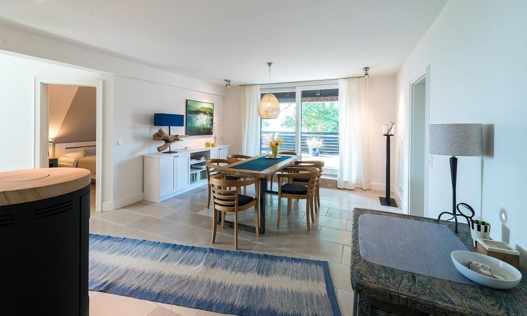Die Ferienwohnung im Obergeschoss begeistert durch ihren liebevollen und zeitgleich sehr hochwertigen Landhausstil. Es erwartet dich ein eleganter Wohnraum mit gemütlichem Sofa, Sesseln und einem traumhaften Essbereich an bodentiefen Fenstern. Zum exklusiven Wohnraum gehören auch ein Kaminofen und ein wundervoller Blick auf den Garten. Die moderne Küche befindet sich separat und ist ebenfalls sehr komfortabel ausgestattet. Sanfte Naturtöne und -materialien führen sich auch in der Einrichtung der beiden Schlafzimmer fort, die mit exquisiten Doppelbetten und ausgesuchten Deko-Elementen ausgestattet sind. Hier findest du den erholsamen Schlaf, den du dir im Urlaub wünschst. Zwei moderne Bäder mit Dusche/WC vervollständigen die komfortable und 90 Quadratmeter große Ferienwohnung.