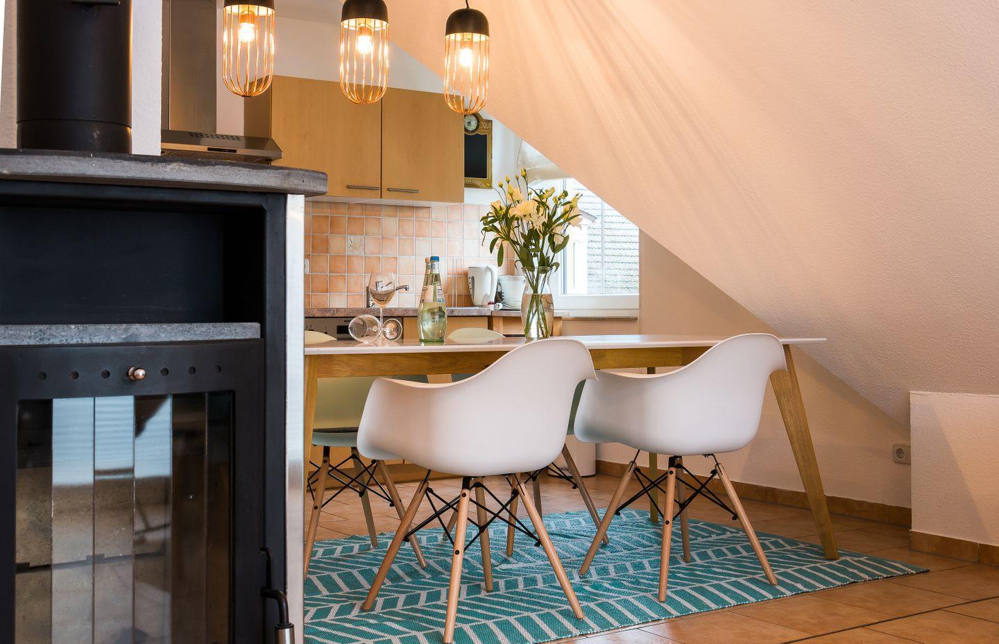 Die Ferienwohnung befindet sich im ersten Obergeschoss von Haus Ostseenixe. Hier erwartet dich ein großzügiger Wohn- und Küchenbereich. Dank der gemütlichen Sofalandschaft an bodentiefen Fenstern kannst du hier herrlich klönen, während das Feuer aus dem Kaminofen knistert. Die Küchenzeile und der Esstisch sind ebenfalls im Wohnraum integriert. Das separate Schlafzimmer ist mit einem Doppelbett ausgestattet und verspricht entspannte Nächte für einen erholsamen Urlaub. Abgerundet wird die Ferienwohnung mit einem Tageslichtbad inklusive Dusche/WC. Das Sofa kann als Aufbettung für ein bis zwei Personen genutzt werden.