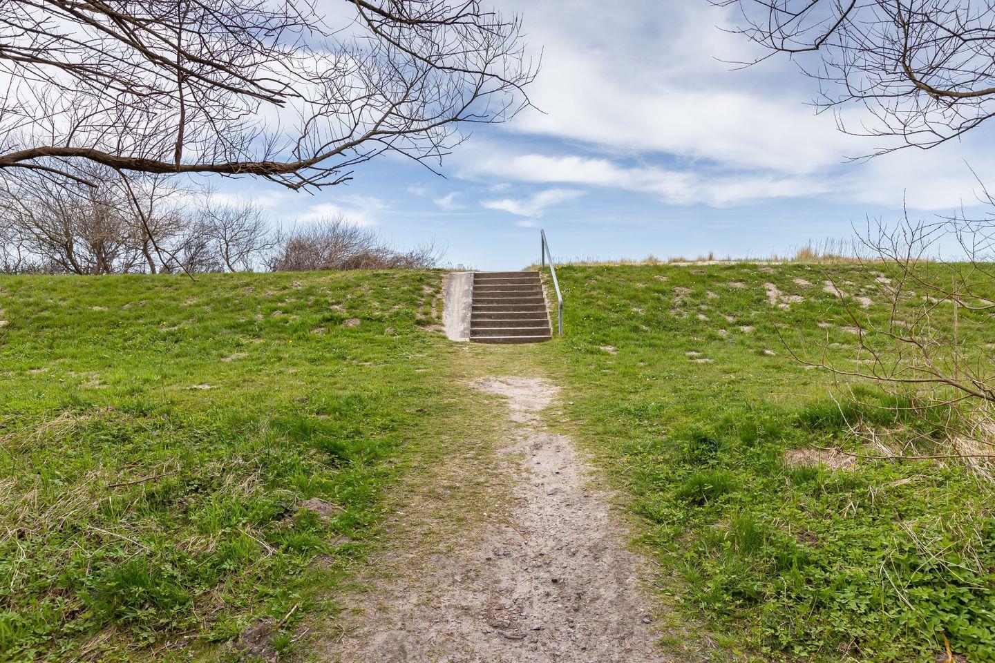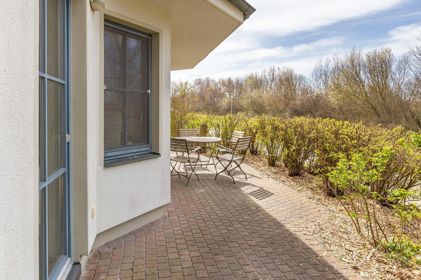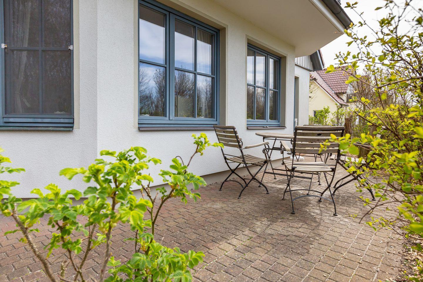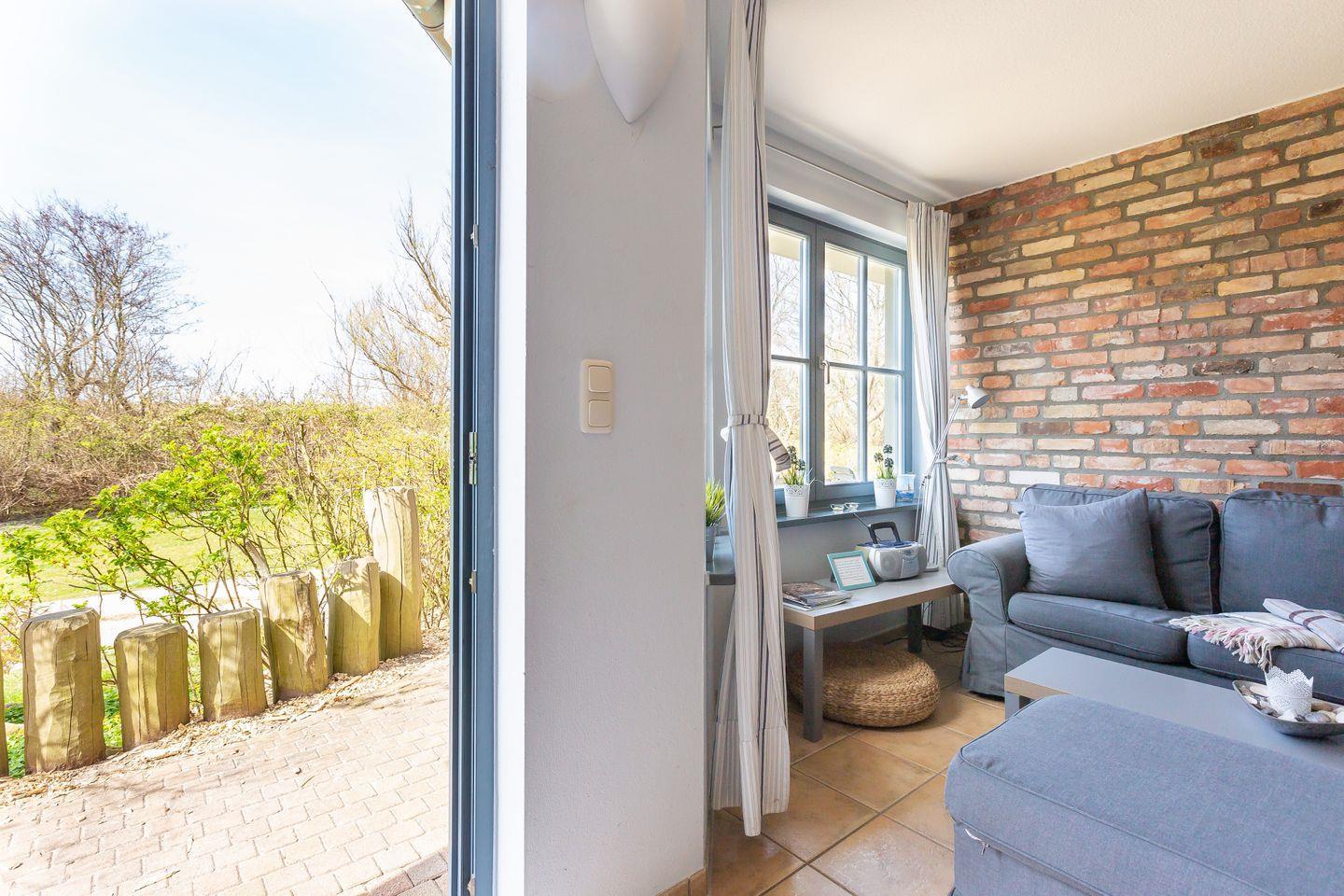 Im Außenbereich befindet sich eine Steinterrasse, die du von Wohnraum und Hauptschlafzimmer betreten kannst. Dank der Holzbohlen und heimischen Bepflanzung genießt du hier private Augenblicke mit einem herrlichen Blick auf den Deich - Meeresrauschen inklusive. Zur Ferienwohnung gehört außerdem ein PKW-Stellplatz.