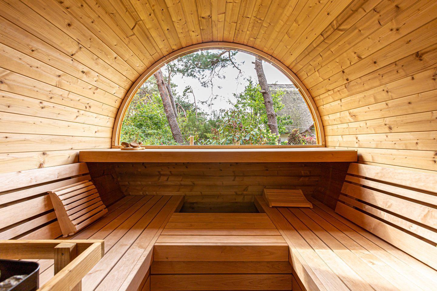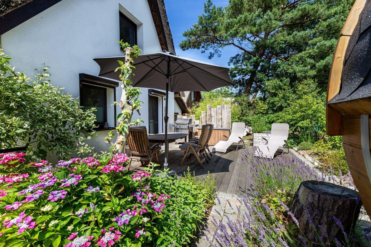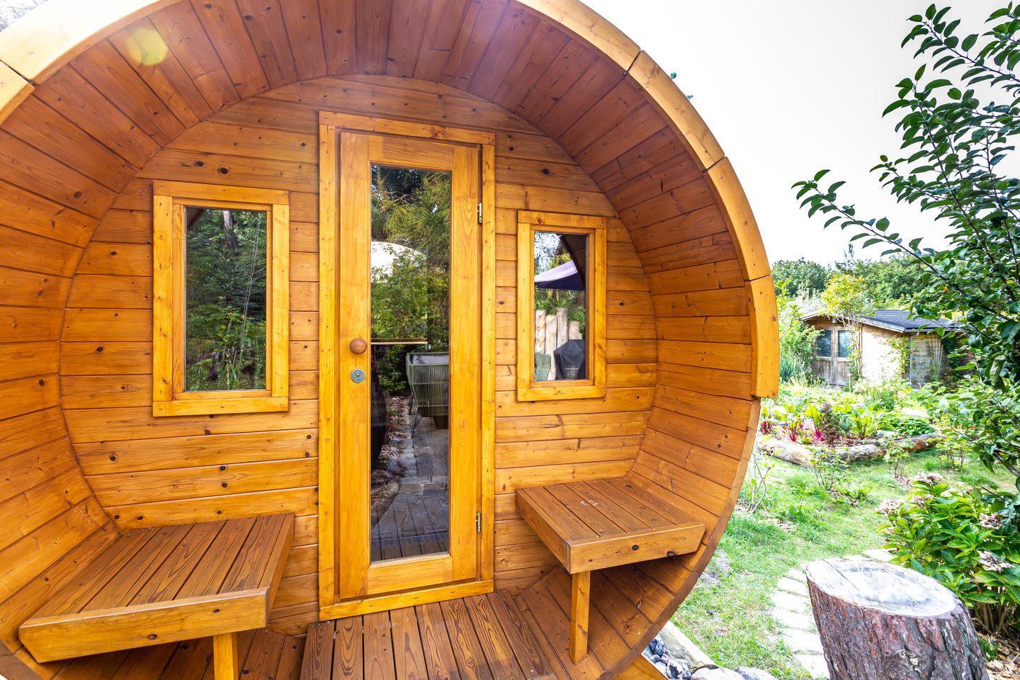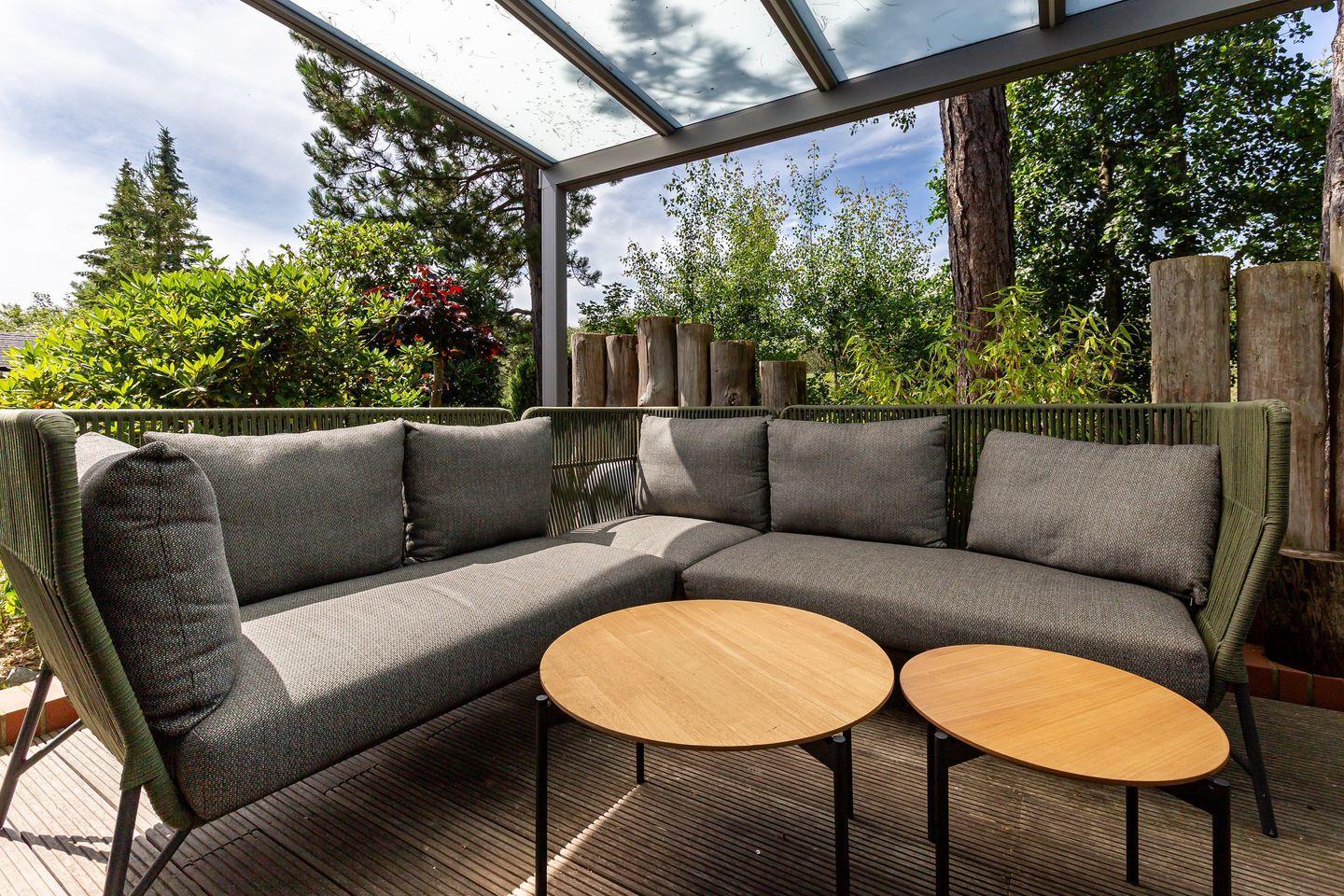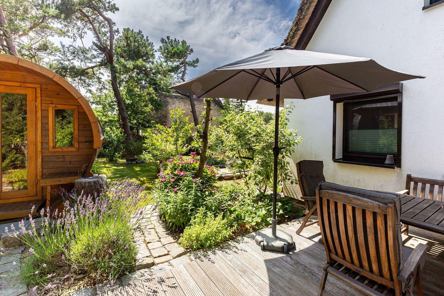 Der Außenbereich ist ebenso schön wie individuell und begeistert mit etlichen Highlights. So zum Beispiel mit der großzügigen Fasssauna. Diese bietet neben ausreichend Platz auch einen herrlichen Blick in den Garten. Je nach Sonne und Gusto kann man es sich auf der Süd- oder Westterrasse mit hochwertiger Bestuhlung und Lounge-Sofa gemütlich machen. Ruhe und ganz viel Privatsphäre runden das Outdoor-Ensemble perfekt ab.