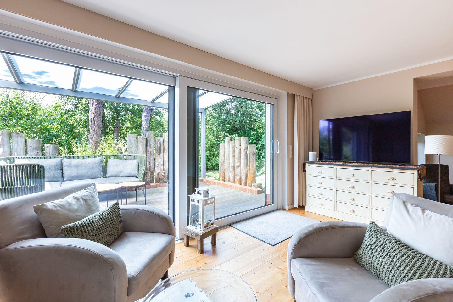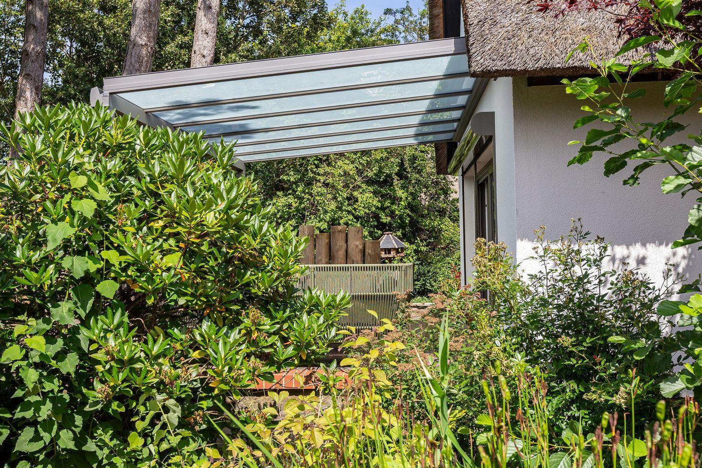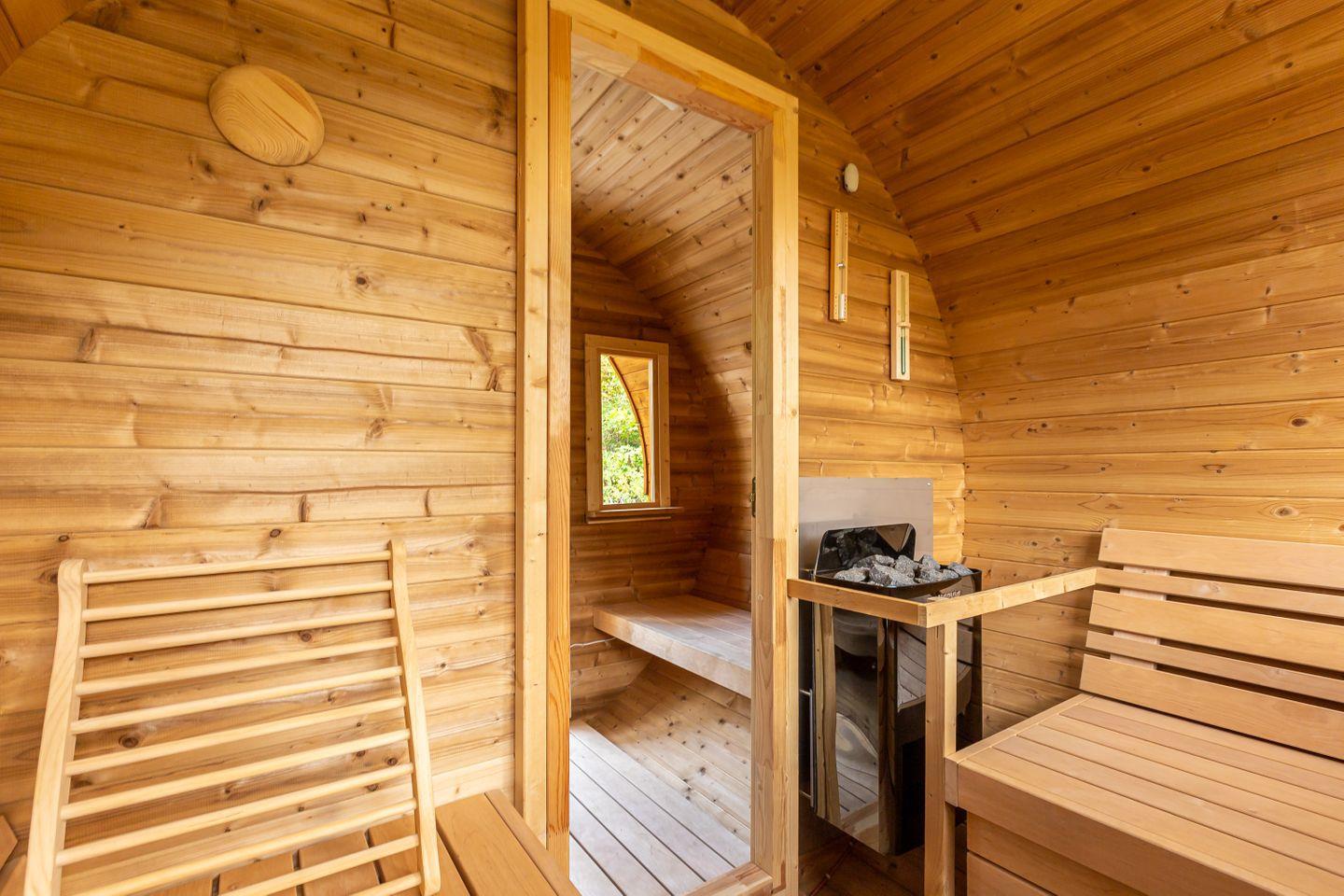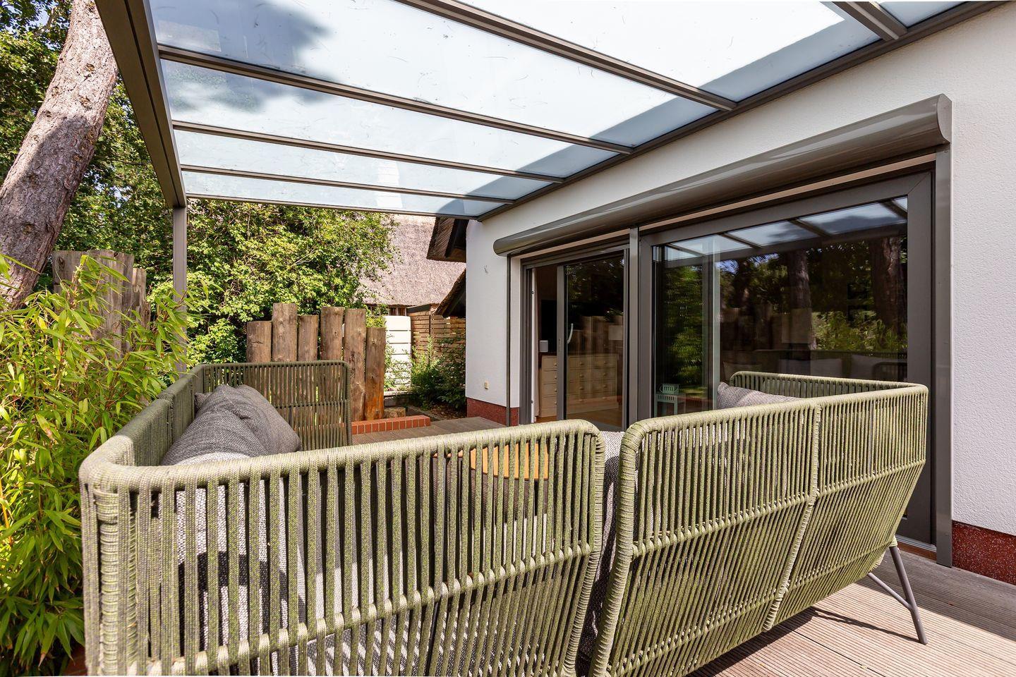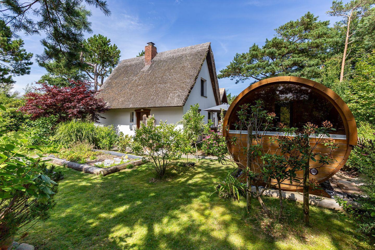 Der Außenbereich ist ebenso schön wie individuell und begeistert mit etlichen Highlights. So zum Beispiel mit der großzügigen Fasssauna. Diese bietet neben ausreichend Platz auch einen herrlichen Blick in den Garten. Je nach Sonne und Gusto kann man es sich auf der Süd- oder Westterrasse mit hochwertiger Bestuhlung und Lounge-Sofa gemütlich machen. Ruhe und ganz viel Privatsphäre runden das Outdoor-Ensemble perfekt ab.