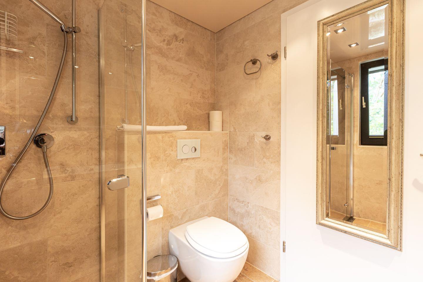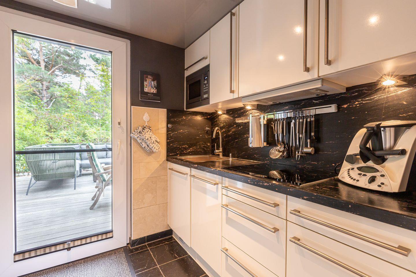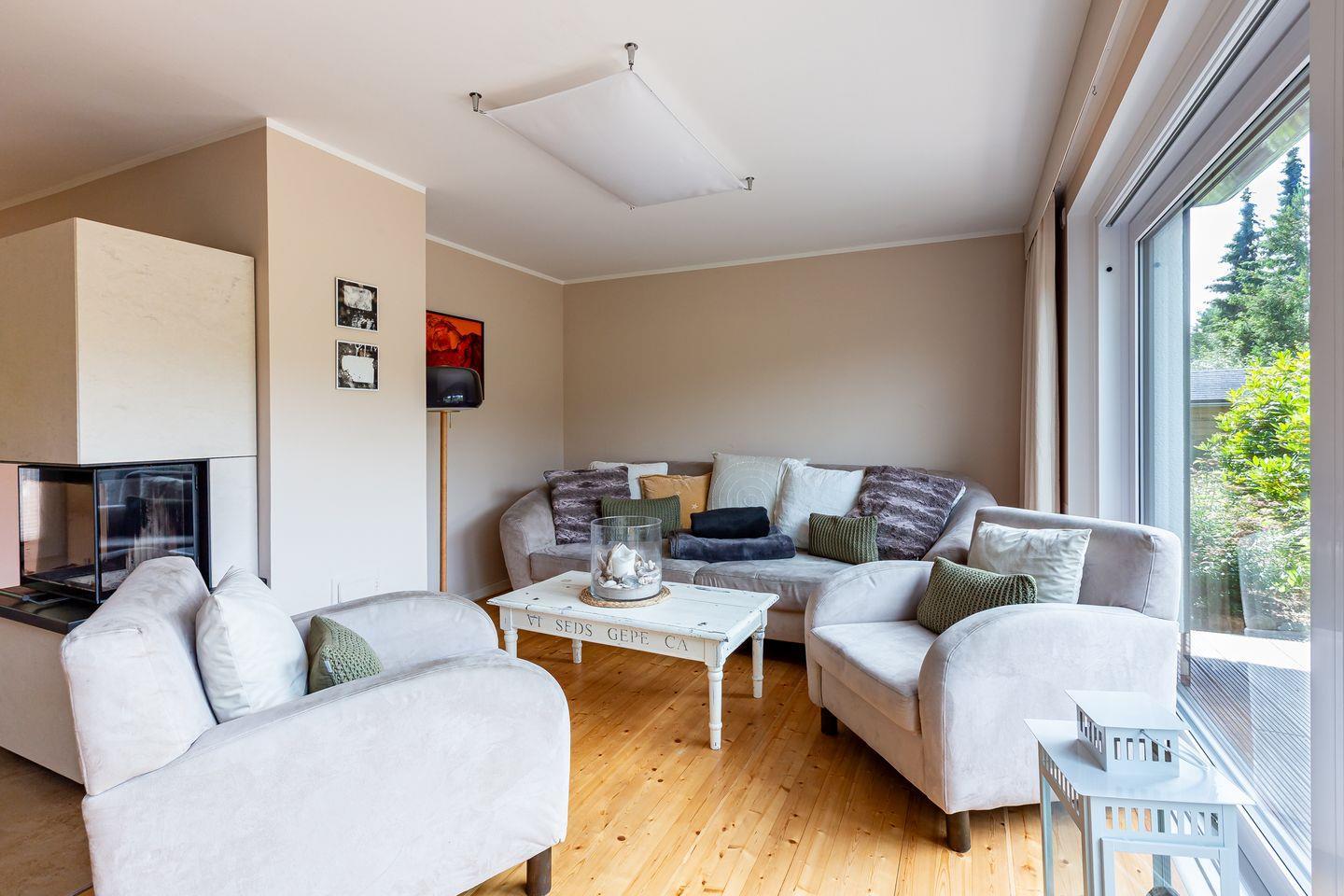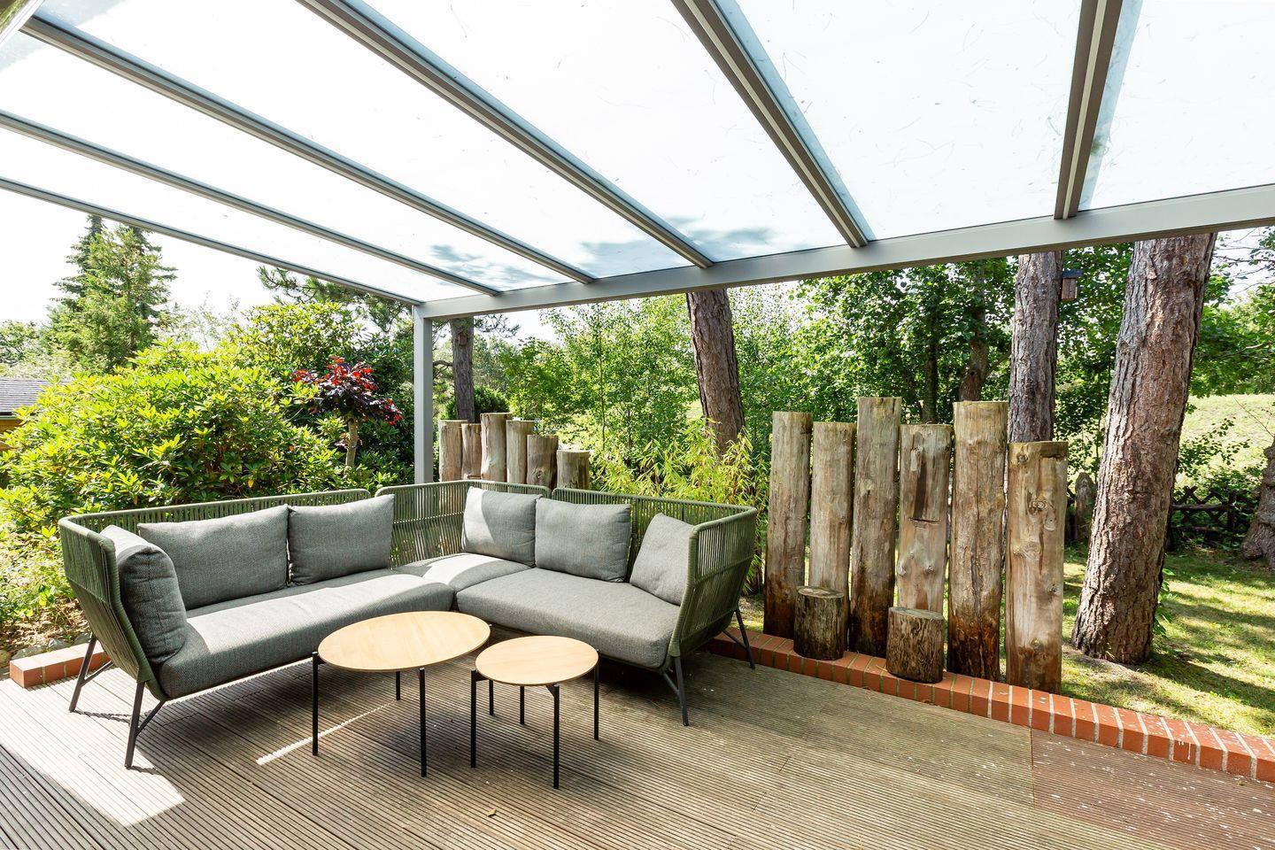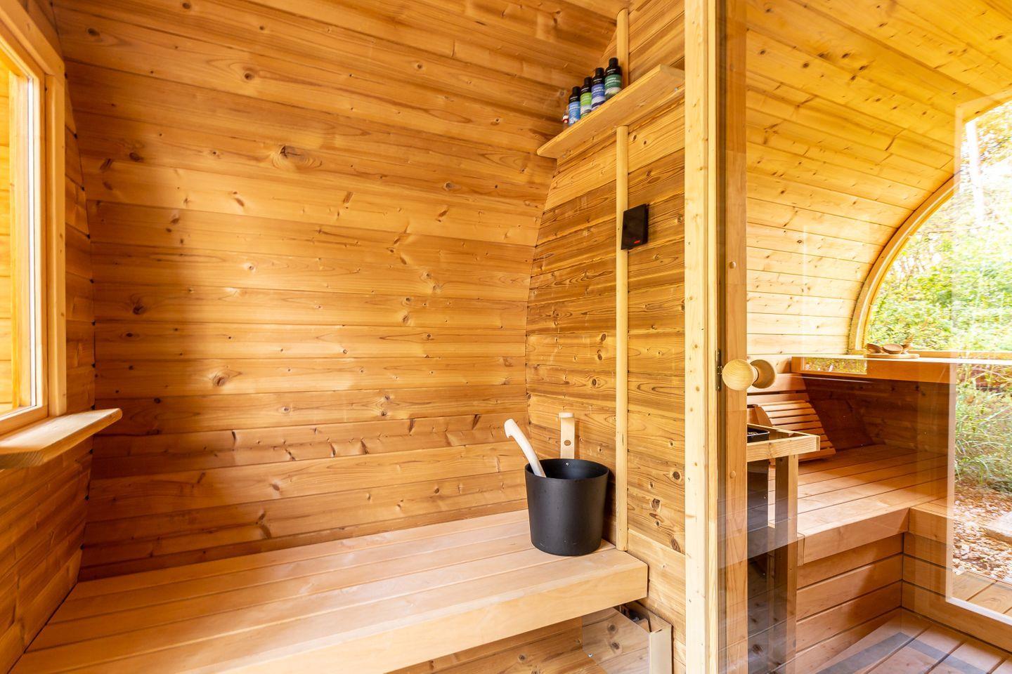 Der Außenbereich ist ebenso schön wie individuell und begeistert mit etlichen Highlights. So zum Beispiel mit der großzügigen Fasssauna. Diese bietet neben ausreichend Platz auch einen herrlichen Blick in den Garten. Je nach Sonne und Gusto kann man es sich auf der Süd- oder Westterrasse mit hochwertiger Bestuhlung und Lounge-Sofa gemütlich machen. Ruhe und ganz viel Privatsphäre runden das Outdoor-Ensemble perfekt ab.