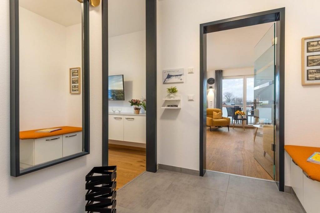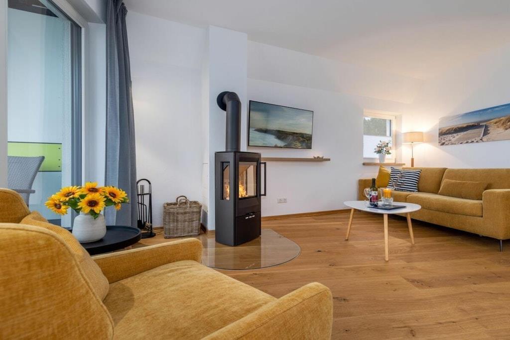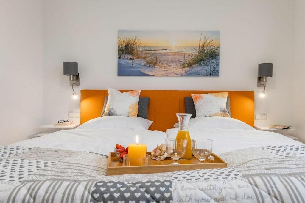 Ny, moderne og smagfuldt møbleret lejlighed på første sal. Store balkondøre fra gulv til loft bringer masser af lys ind i stuen med egetræsparketgulv. En sovesofa med en ekstra seng (160x200 cm) egnet til to personer, et fuldt udstyret køkken, en pejs til kolde dage og havemøbler på balkonen, to LCD-tv'er, et soveværelse med en dobbeltseng og et badeværelse med god opbevaringsplads. Bryggerset indeholder en møntvaskemaskine og tørretumbler. Der er cykelopbevaring.
