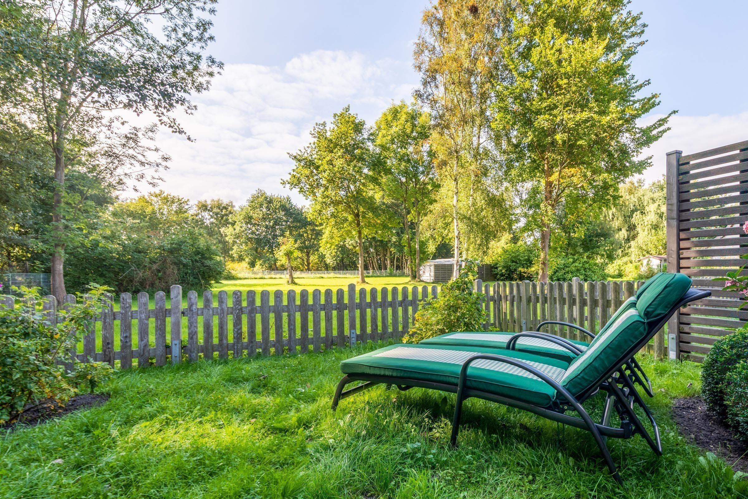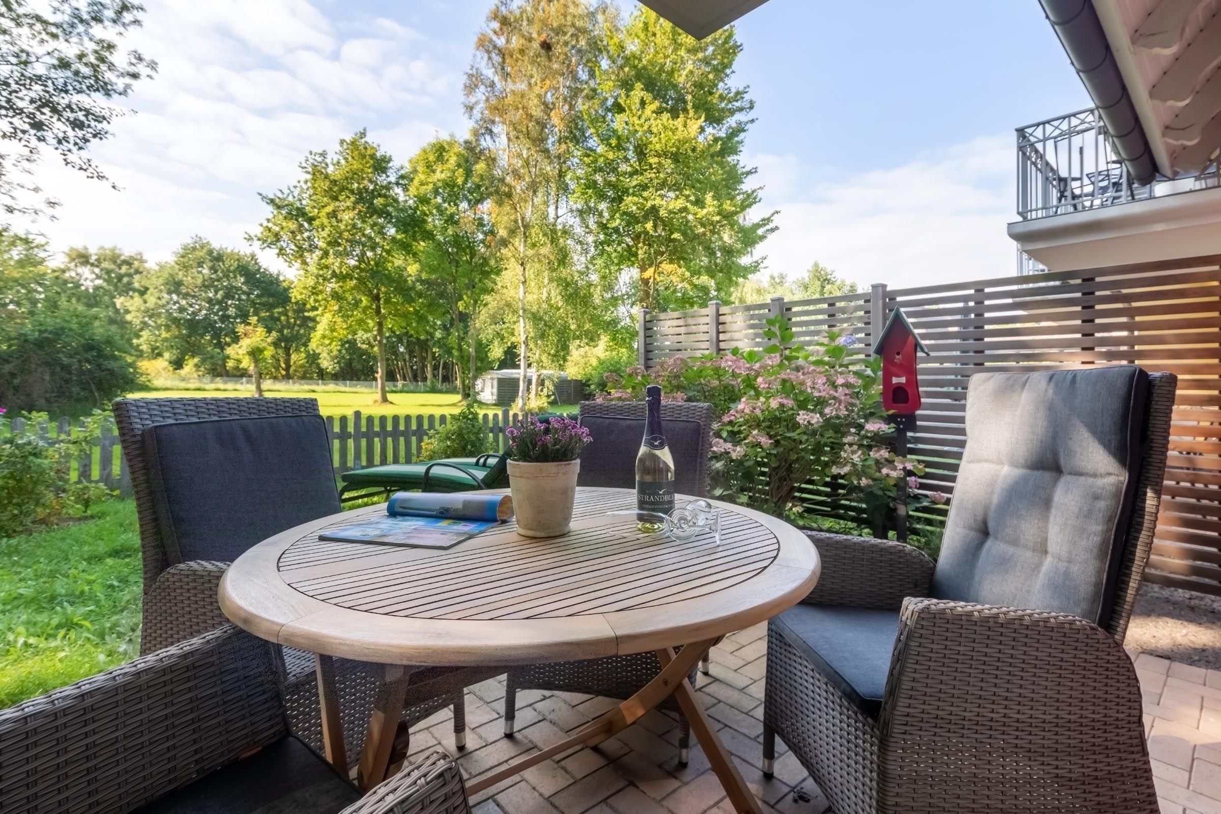 Die Ferienwohnung bietet einen einladenden Außenbereich mit einem privaten Garten, der ideal zum Entspannen ist. Hier stehen bequeme Gartenliegen und Liegestühle bereit, um die Sonne zu genießen. Die großzügige Terrasse ergänzt das Angebot und schafft einen perfekten Ort, um die frische Luft und die natürliche Umgebung zu erleben. Ein Rückzugsort für erholsame Stunden im Freien.