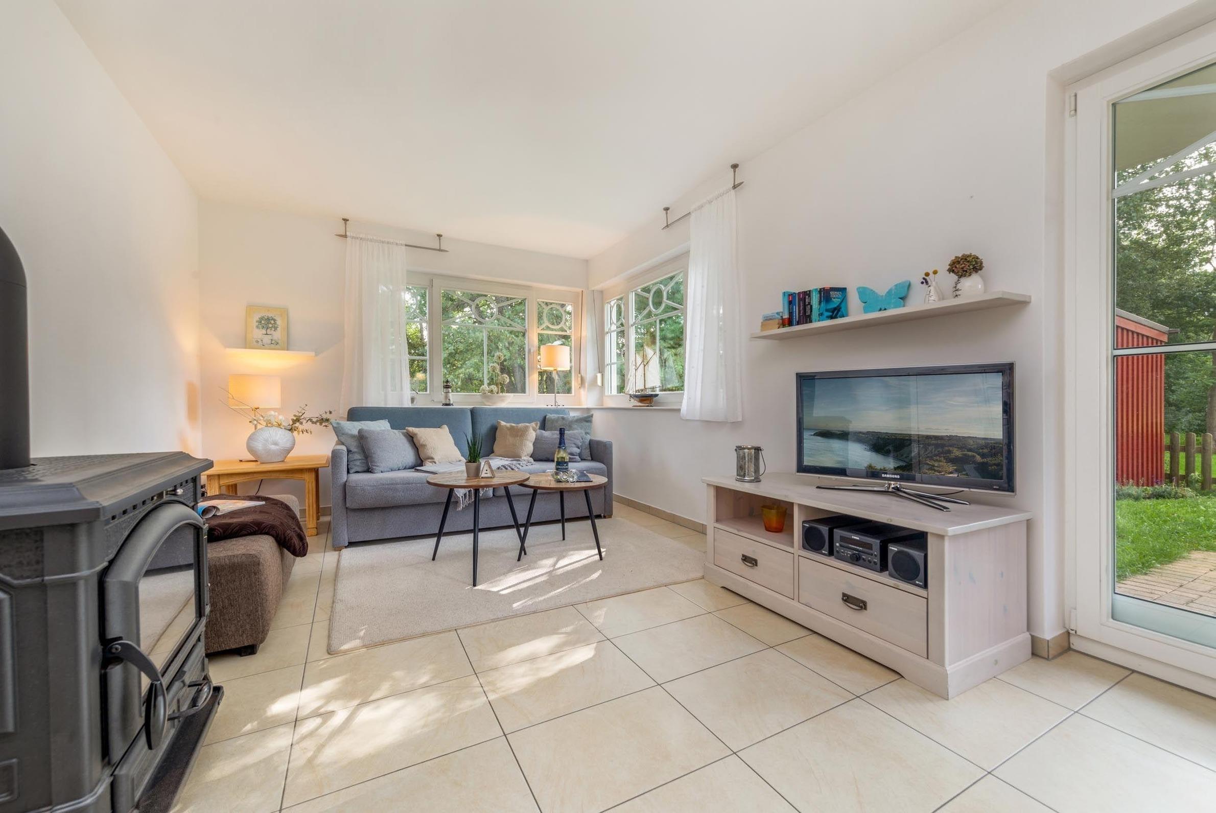 Der gemütliche Wohnbereich mit Kamin/Kachelofen bietet Raum zum Entspannen, unterstützt durch eine HiFi-Anlage und einen TV. WLAN steht im gesamten Gebäude zur Verfügung. Zur Ausstattung gehören auch ein Parkplatz, Fliegengitter, Brettspiele und ein Sonnenschirm. Der Komfort wird durch Heizung, Rauchmelder, Staubsauger und einen Wäscheständer ergänzt. Ideal für einen ruhigen Rückzugsort.