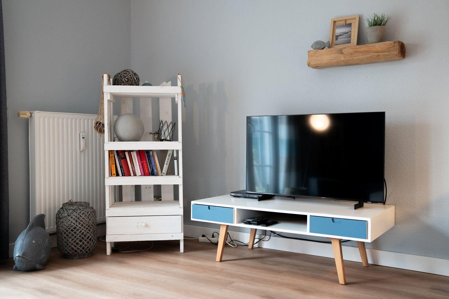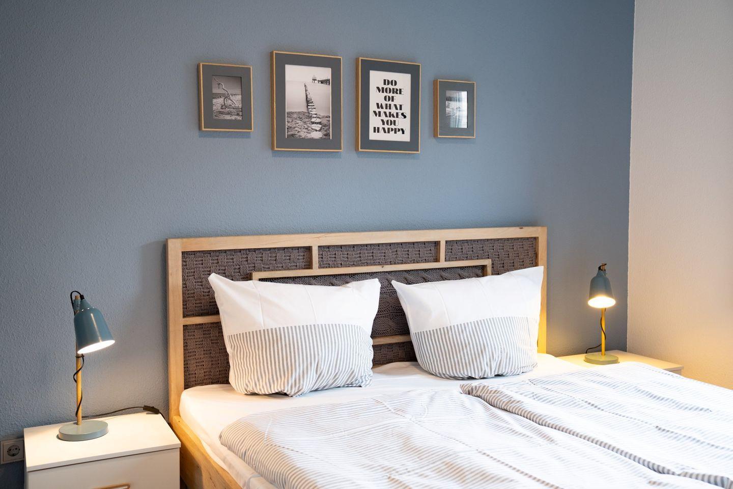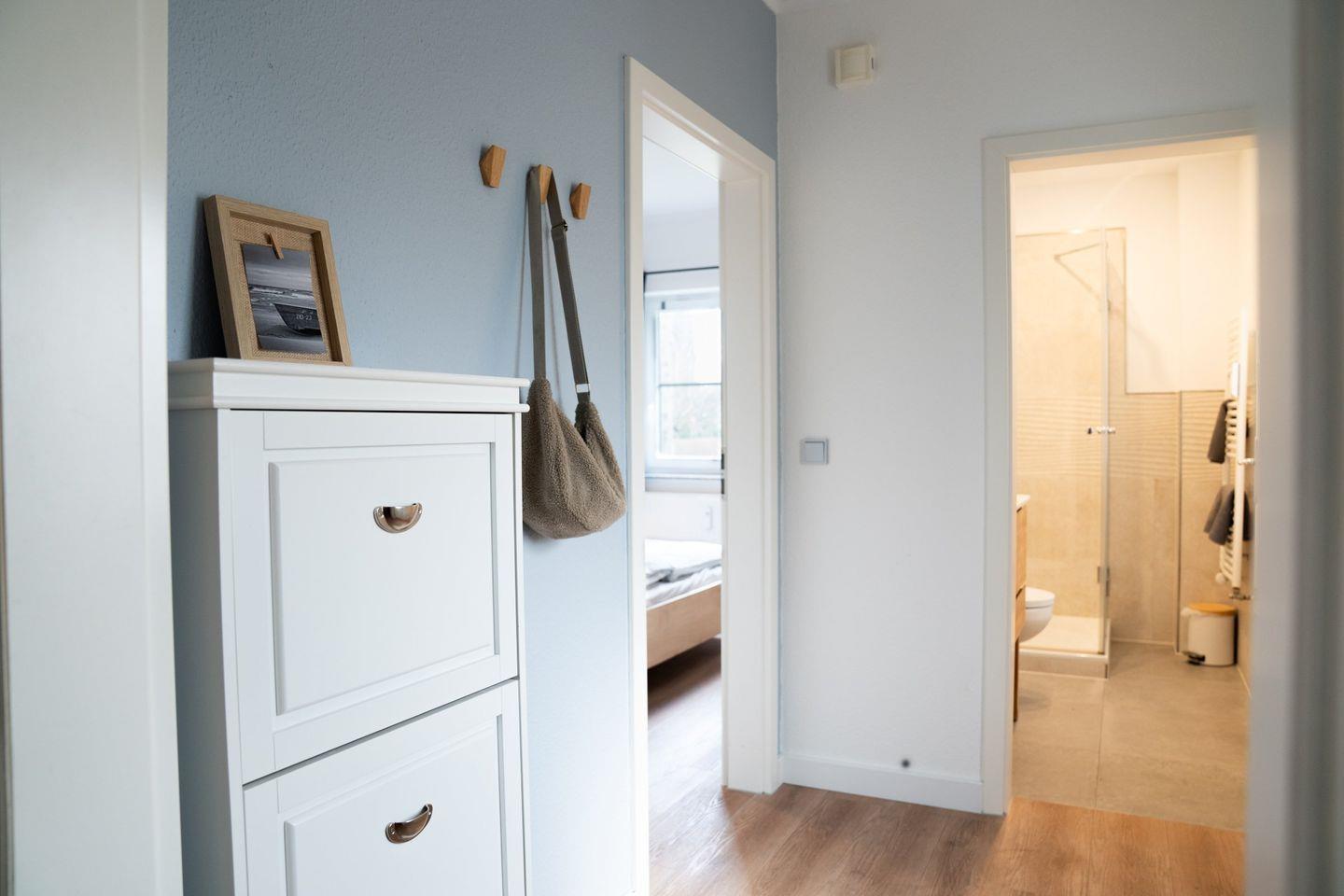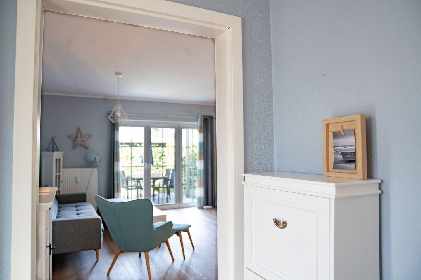 Die 50 m² große Erdgeschosswohnung wird für bis zu 2 Erwachsene mit einem Kind vermietet. Das modern-maritime Wohnzimmer verfügt über ein Schlafsofa (Liegefläche 115x210cm), einen Essbereich mit großzügigem Esstisch und eine integrierte Küche. Die helle Westterrasse erreichen Sie auch vom Wohnzimmer aus. Das Schlafzimmer ist mit einem komfortablen Doppelbett ausgestattet, das Badezimmer mit einer Dusche. Die Wohnung ist haustierfrei und daher auch für Allergiker geeignet. Zur Wohnung gehört ein kostenfrei nutzbarer PKW-Stellplatz direkt vor der Tür sowie ein Schuppen, in dem die Terrassenmöbel oder auch Fahrräder abgestellt werden können. Das hauseigene WLAN kann während des gesamten Aufenthalts kostenfrei genutzt werden. In der Küche steht ein Bluetooth-fähiges Radio zur Vergnügung. Eine Ladesäule für Elektroautos gibt es in diesem Objekt ebenfalls (Wallbox 11kW)