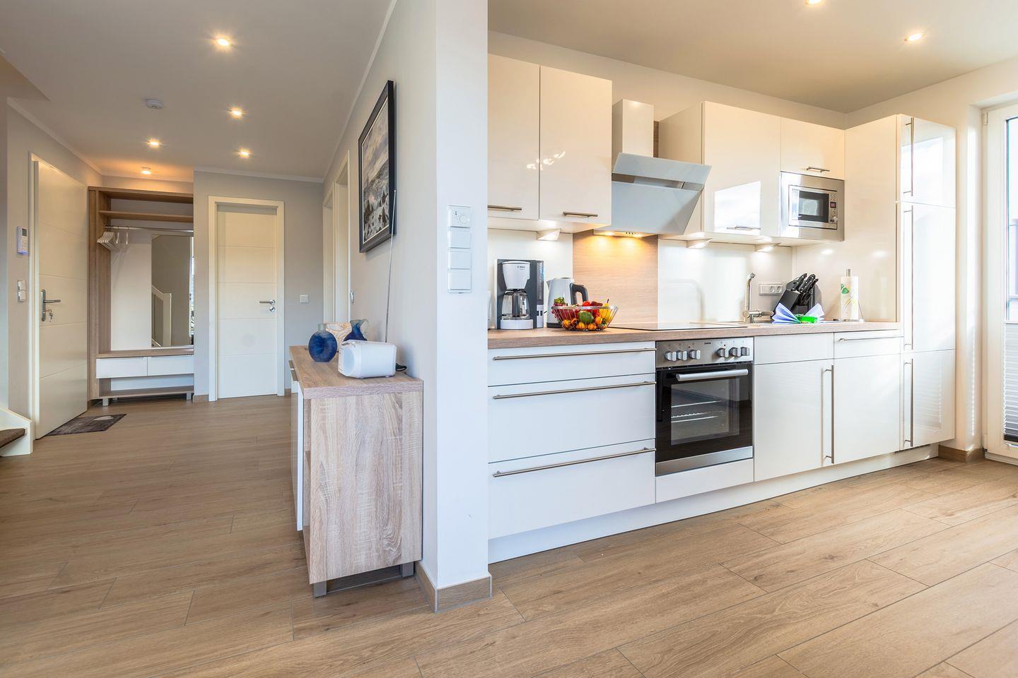 Im Obergeschoss befindet sich das große Wohnzimmer mit der integrierter Küche. Ein helles und gemütliches Schlafzimmer mit Boxspringbetten (180x215) laden zum Entspannen ein. Das Badezimmer, bodengleicher Dusche, befindet sich ebenfalls in dieser Etage. Der große Balkon mit der Ausrichtung nach Südwesten zur untergehenden Sonne geht direkt vom Wohnzimmer ab.