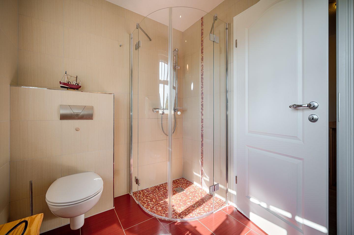 1 Schlafzimmer mit Doppelbett (1,80x2,00m), Federkernmatratzen, verstellbare Lattenroste, eigenem Bad mit Whirlwanne/ebenerdiger Dusche und WC, TV, Zugang zur Dachterrasse