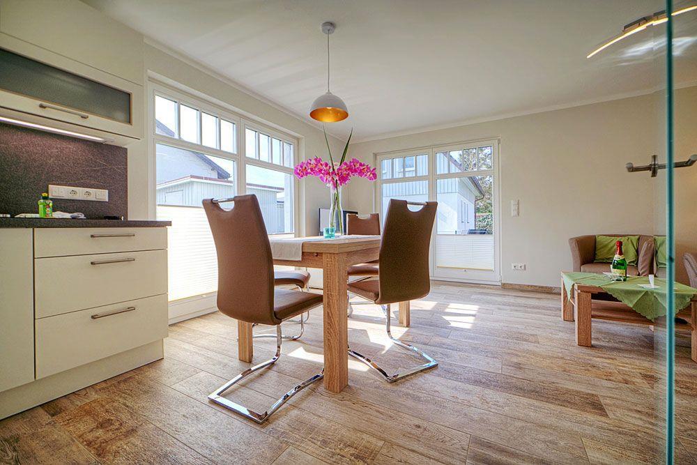 Wohnraum mit Ledercouch, Esstisch für 4 Personen