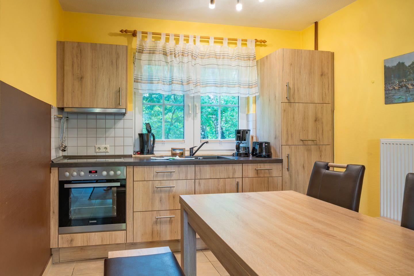 Direkt angrenzend zum Wohnzimmer befindet sich der offene Essbereich mit Esstisch sowie die voll ausgestattete Küche. Hier finden Sie unter anderem einen Ceranherd mit Backofen, eine Spülmaschine, einen Kühlschrank mit Gefrierfach, eine Kaffeemaschine, einen Wasserkocher, einen Toaster und sämtliche wichtigen Küchenutensilien sowie Geschirr und Besteck.