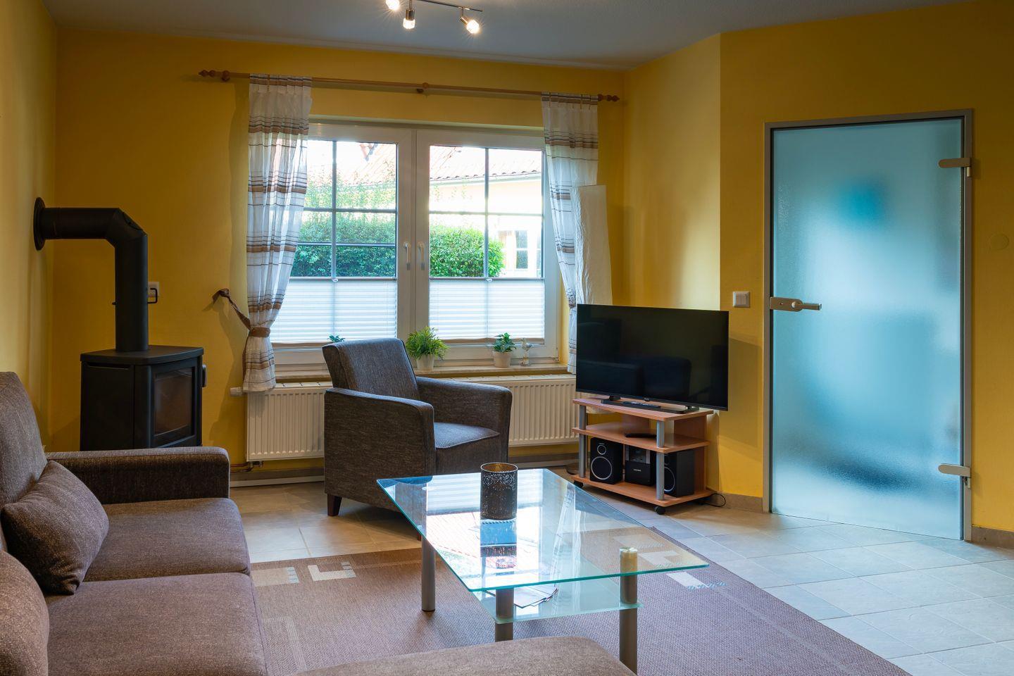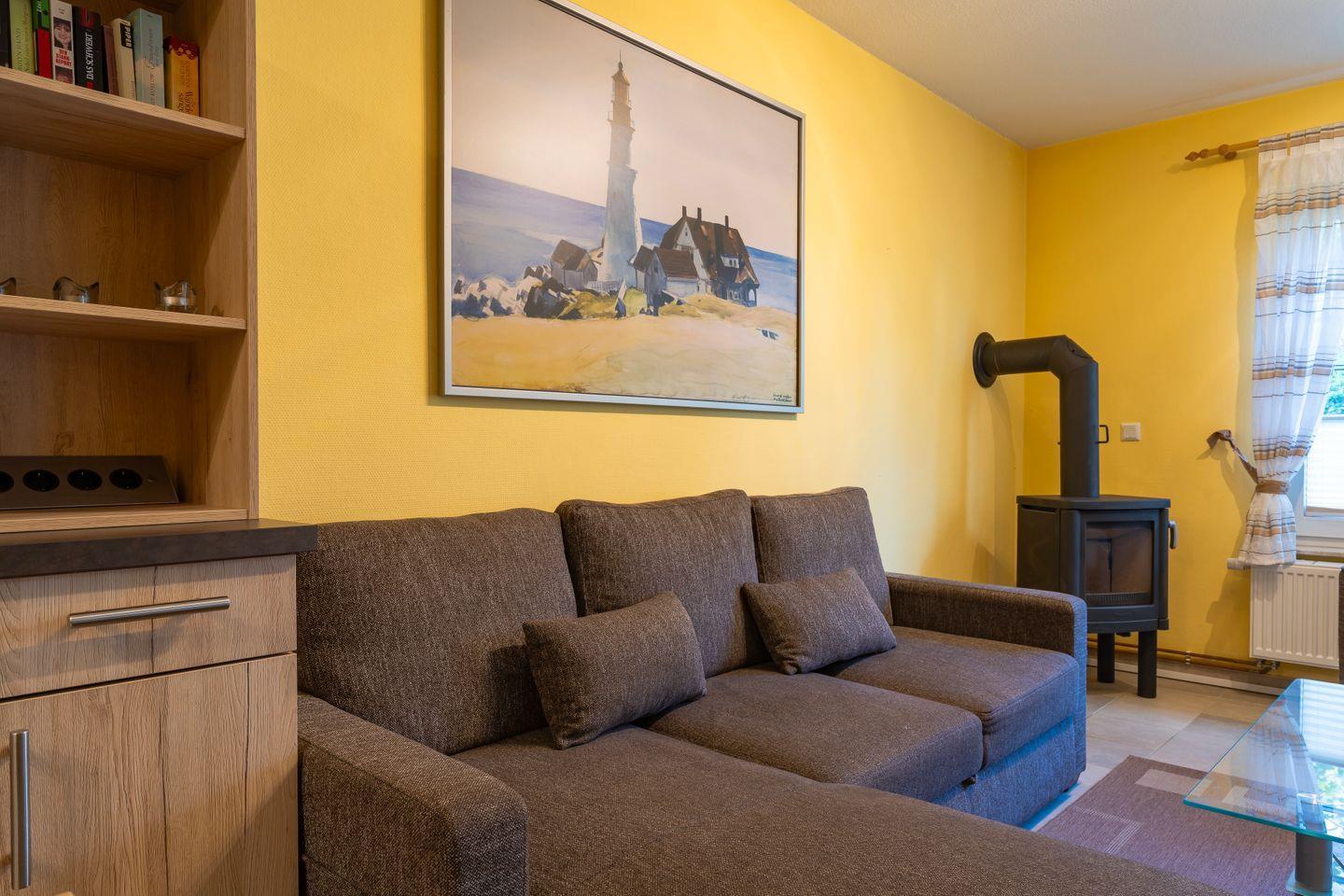 Das zweigeschossige Ferienhaus ist für bis zu vier Personen konzipiert und eignet sich sowohl für Familien als auch für Paare und Erholungssuchende. Im Erdgeschoss befindet sich das offene und helle Wohnzimmer, das durch komfortable Sitzgelegenheiten, einen Kaminofen für wohlige Wärme an kühleren Tagen sowie einen Flachbild-TV zum Verweilen einlädt.