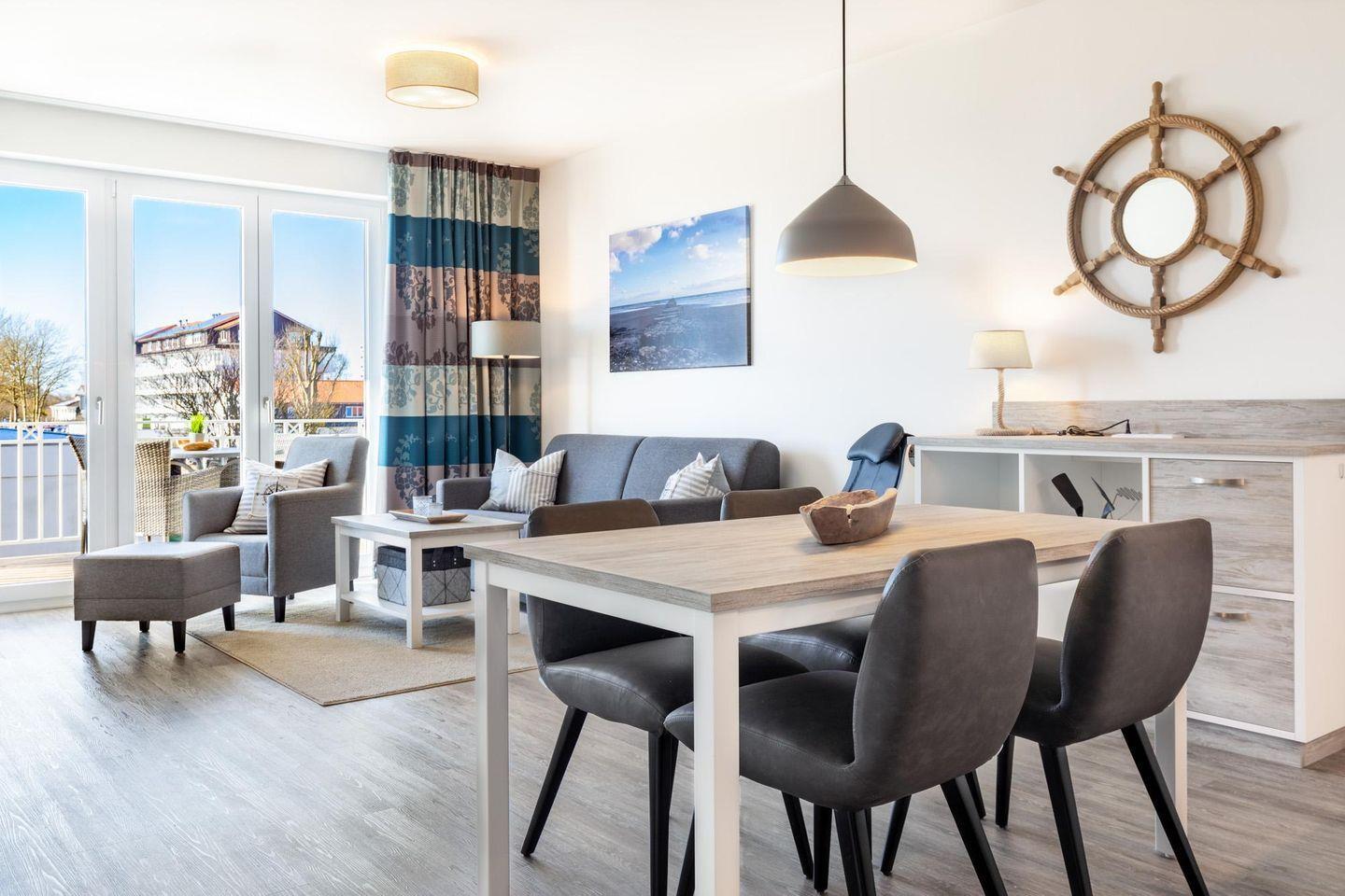 Das lichtdurchflutete und familienfreundliche Nichtraucher-Apartment ist barrierearm und verfügt über Fußbodenheizung, sonnenschutzverglaste und bodentiefe Fensterflächen, kostenfreies WLAN und eine voll ausgestattete offene Küche mit Geschirrspüler, Kühlschrank und Gefrierfach, Kaffeefilter- und Kaffeekapselmaschine (Nespresso), Toaster, Wasserkocher, Herd mit Glaskeramikkochfeld und Backofen mit Schnellaufheizfunktion.