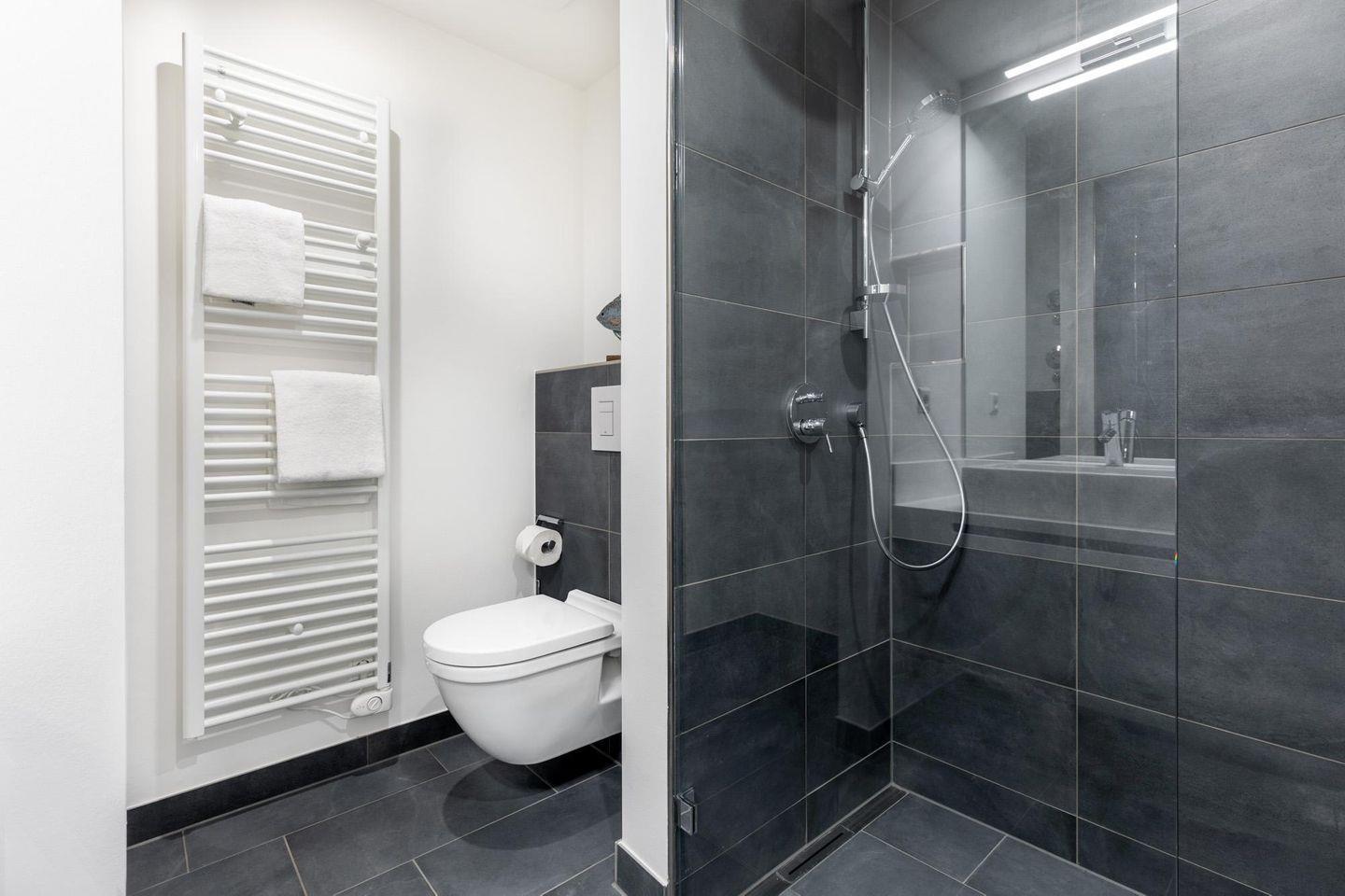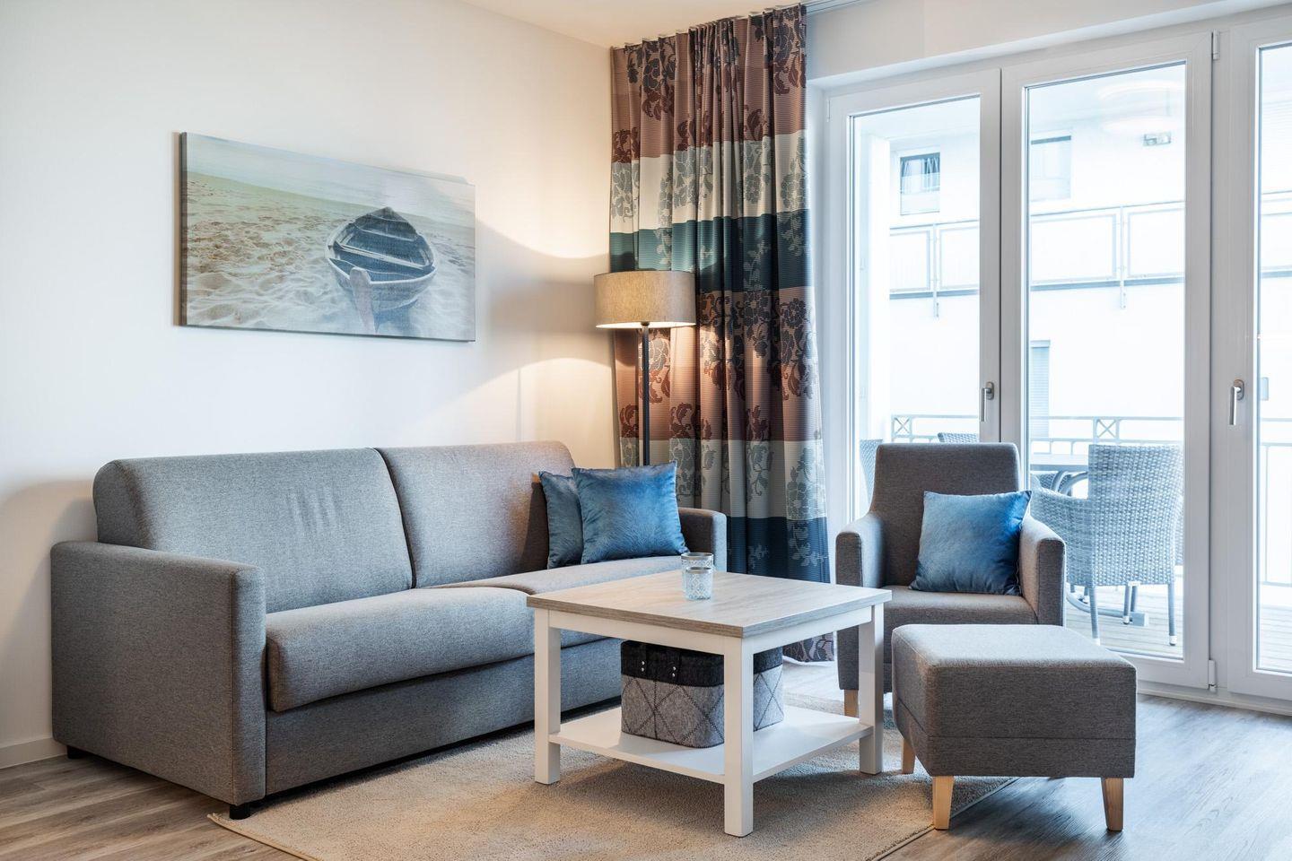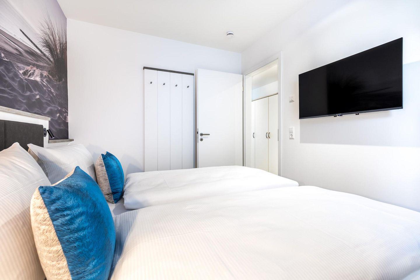 Im modern-behaglichen Wohn-Essbereich befindet sich eine Doppelschlafcouch (1,60 x 1,95 m) und ein großer Flatscreen-TV (43 Zoll). Das separate, nach Nordwesten gelegene Schlafzimmer bietet hohen Schlafkomfort durch zwei moderne Boxspringbetten (0,90 x 2,00 m) und ist mit einem weiteren Flatscreen-TV (40 Zoll) sowie Kleiderschrank und Sitz-/Kofferbank ausgestattet. Das stilvolle Badezimmer verfügt über eine ebenerdige Regendusche, WC, , Kosmetikspiegel, Waschtisch mit Föhn, Handtuchheizkörper und Fußbodenheizung.