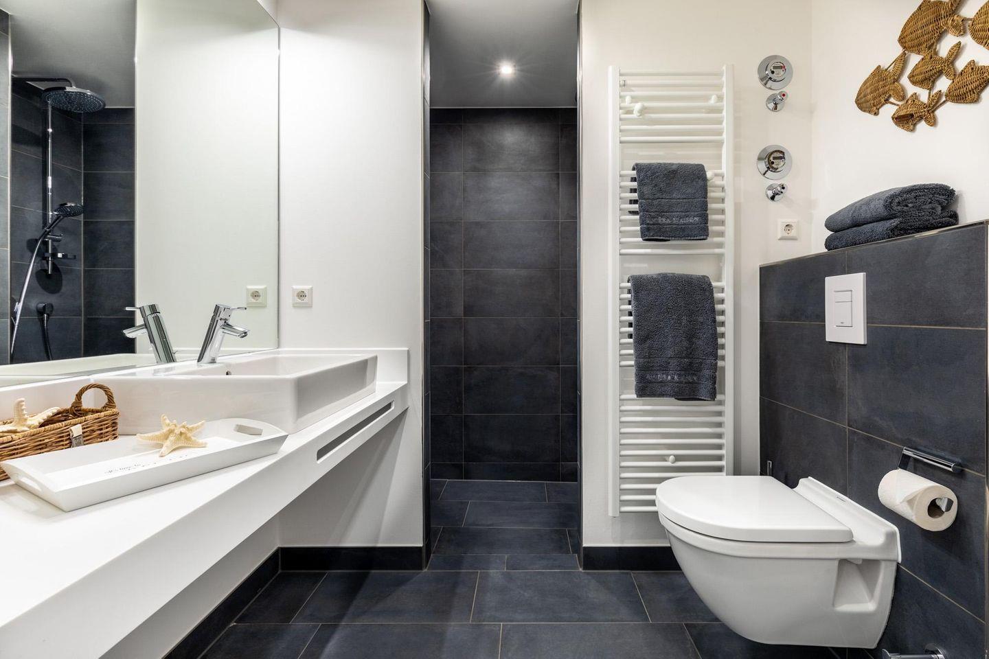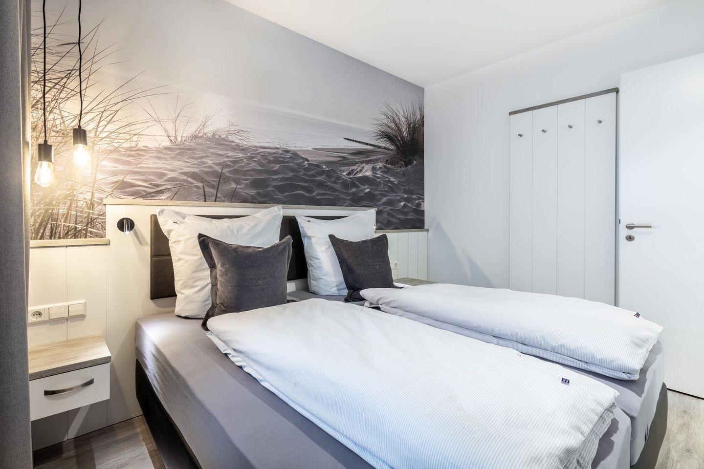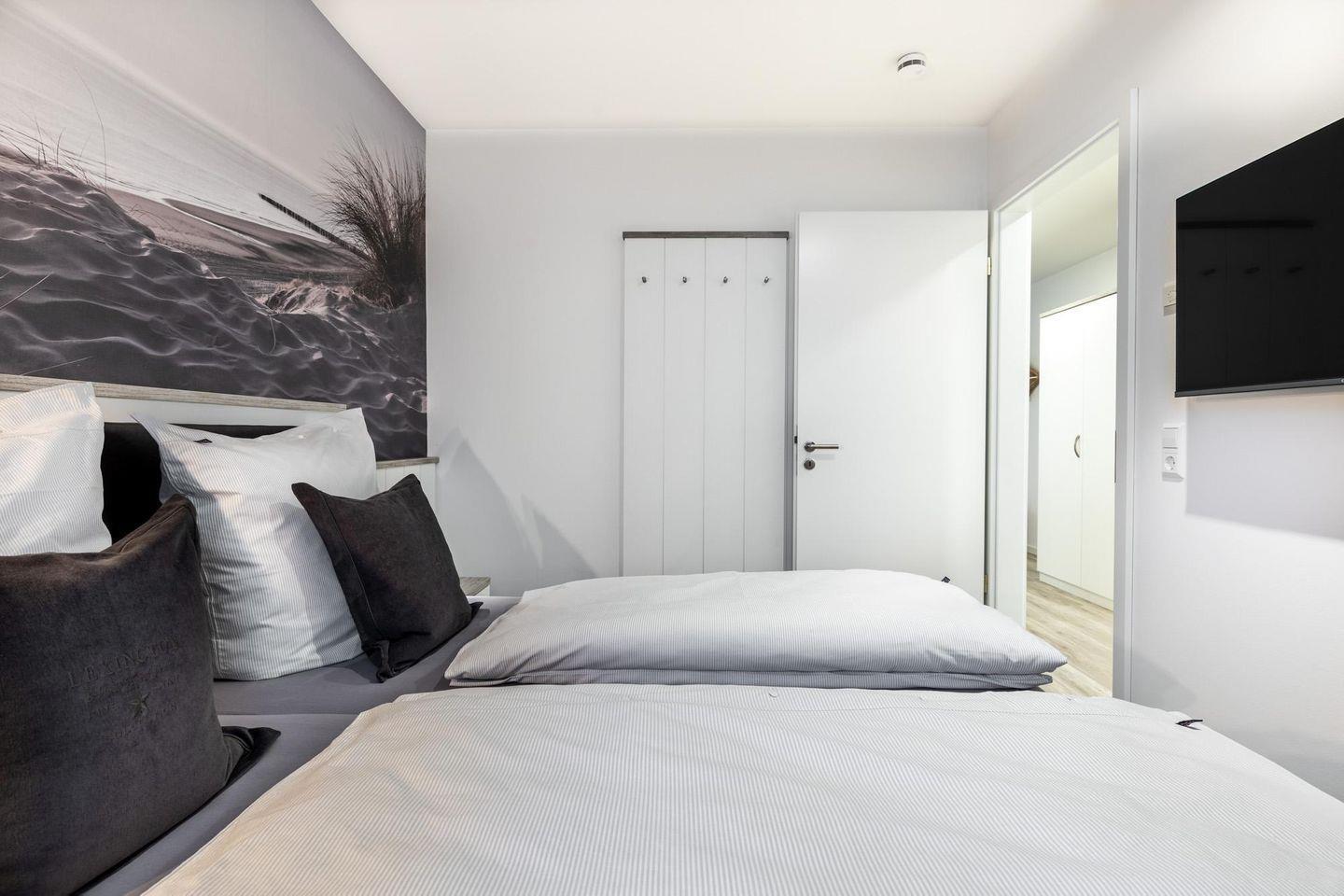 Im modern-behaglichen Wohn-Essbereich befinden sich eine Doppelschlafcouch (1,60 x 1,95 m) und ein großer Flatscreen-TV (43 Zoll) sowie ein DAB-Radio mit CD-Player und Bluetooth. Das separate, nach Nordwesten gelegene Schlafzimmer bietet hohen Schlafkomfort durch zwei moderne Boxspringbetten (0,90 x 2,00 m) und ist mit einem weiteren Flatscreen-TV (40 Zoll) ausgestattet. Im Flur befinden sich Kleiderschrank und Sitz-/Kofferbank. Das stilvolle Badezimmer verfügt über eine ebenerdige Regendusche, WC, Waschtisch mit Föhn, Handtuchheizkörper und Fußbodenheizung.