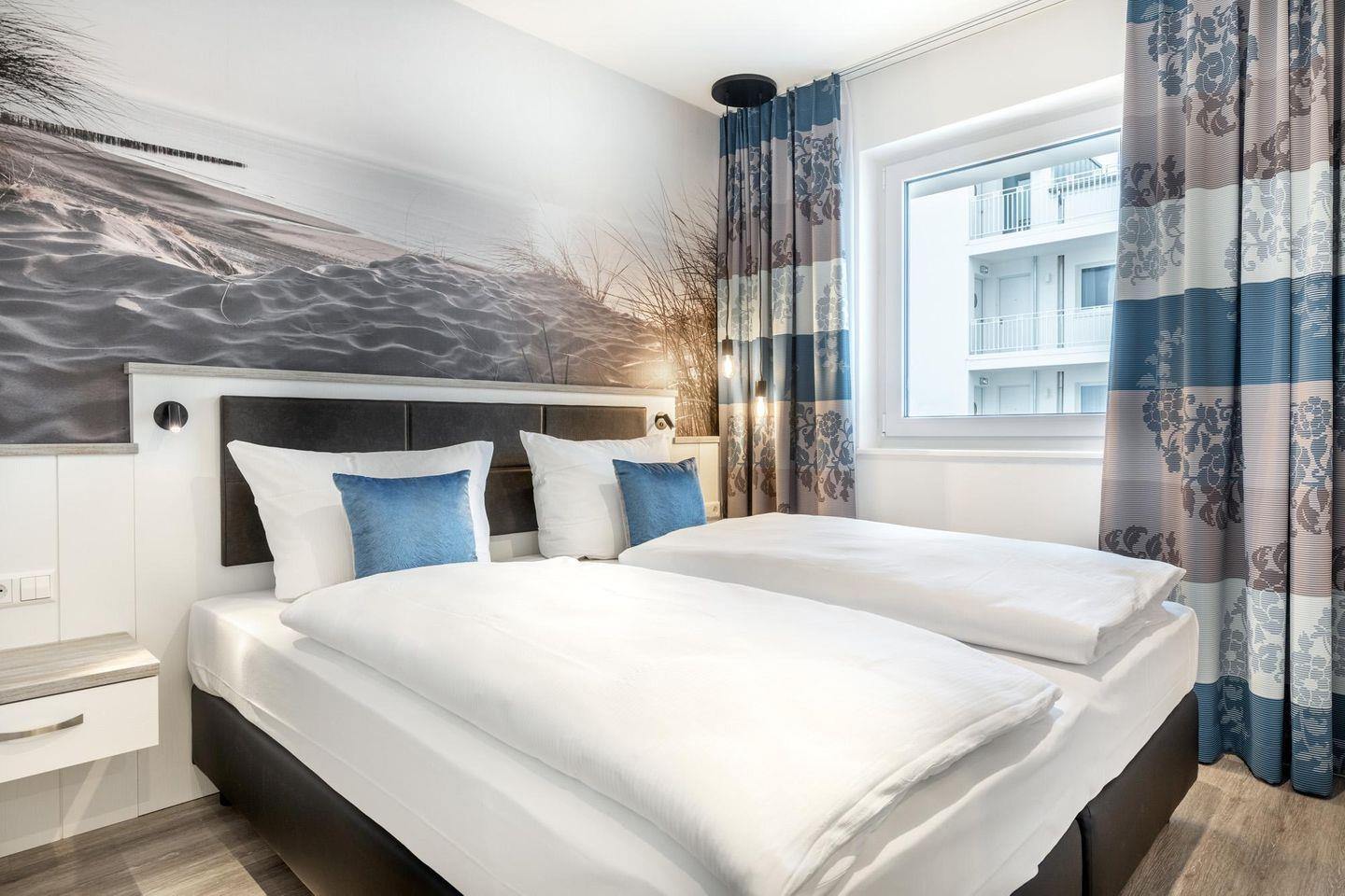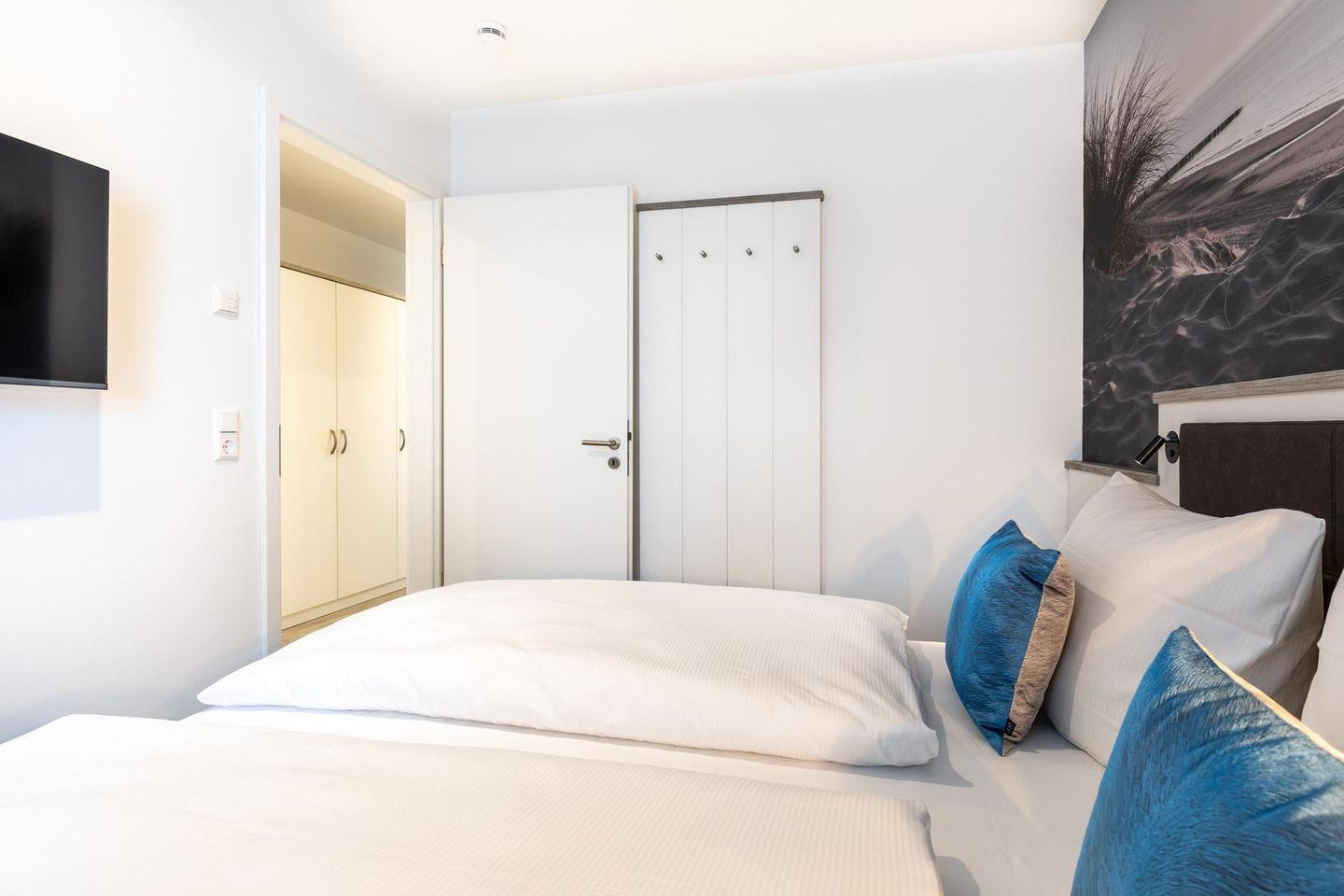 Im modern-behaglichen Wohn-Essbereich befindet sich eine Doppelschlafcouch (1,60 x 1,95 m) und ein großer Flatscreen-TV (43 Zoll). Das separate Schlafzimmer bietet hohen Schlafkomfort durch zwei moderne Boxspringbetten (0,90 x 2,00 m) und ist mit einem weiteren Flatscreen-TV (40 Zoll) ausgestattet. Im Flur befinden sich Kleiderschrank und Sitz-/Kofferbank. Das stilvolle Badezimmer verfügt über eine ebenerdige Regendusche, WC, Waschtisch mit Föhn, Handtuchheizkörper und Fußbodenheizung.