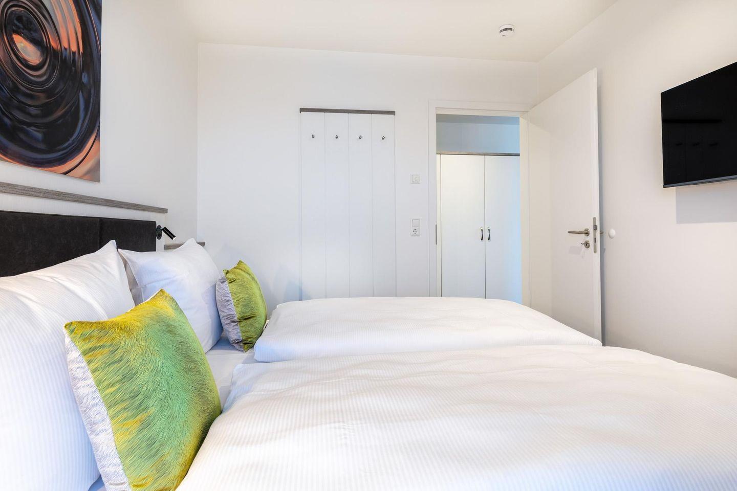 Im modern-behaglichen Wohn-Essbereich befindet sich eine Doppelschlafcouch (1,60 x 1,95 m) und ein großer Flatscreen-TV (43 Zoll). Das separate Schlafzimmer bietet hohen Schlafkomfort durch zwei moderne Boxspringbetten (0,90 x 2,00 m) und ist mit einem weiteren Flatscreen-TV (40 Zoll) sowie Kleiderschrank und Sitz-/Kofferbank ausgestattet. Das stilvolle Badezimmer verfügt über eine ebenerdige Regendusche, WC, Waschtisch mit Föhn, Handtuchheizkörper und Fußbodenheizung.