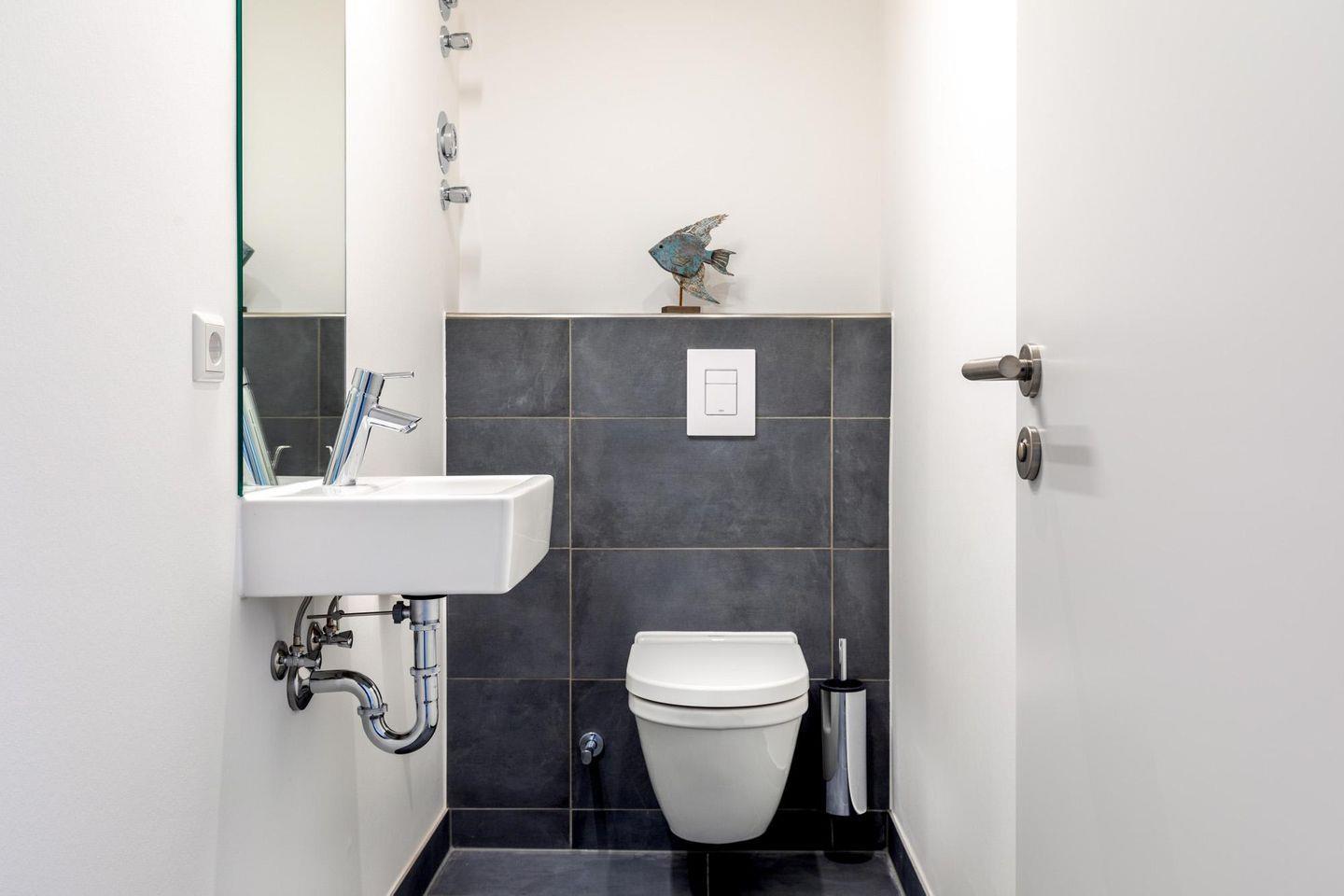 Das stilvolle Badezimmer bietet eine ebenerdige Regendusche, WC, Waschtisch mit Föhn, Handtuchheizkörper und Fußbodenheizung. Des Weiteren beinhaltet die Ferienwohnung ein zweites WC mit Waschbecken.