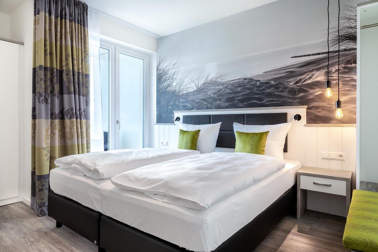 Im modern-behaglichen Wohn-Essbereich befindet sich eine Doppelschlafcouch (1,60 x 1,95 m) und ein großer Flatscreen-TV (43 Zoll). Zwei separate Schlafzimmer bieten hohen Schlafkomfort durch moderne Boxspringbetten mit einem Doppelbett (1,80 x 2,00 m) und sind mit jeweils einem Flatscreen-TV (40 Zoll) und Kleiderschrank ausgestattet. Eines der Schlafzimmer verfügt über einen eigenen, kleinen Balkon mit Meerblick. Bitte beachtet, dass sich im zweiten Schlafzimmer ein Brandschutzfenster befindet, dass sich nicht öffnen lässt. Es gibt jedoch eine spezielle Lüftungsanlage, über die stufenweise regulierbar Frischluft zugeführt werden kann.