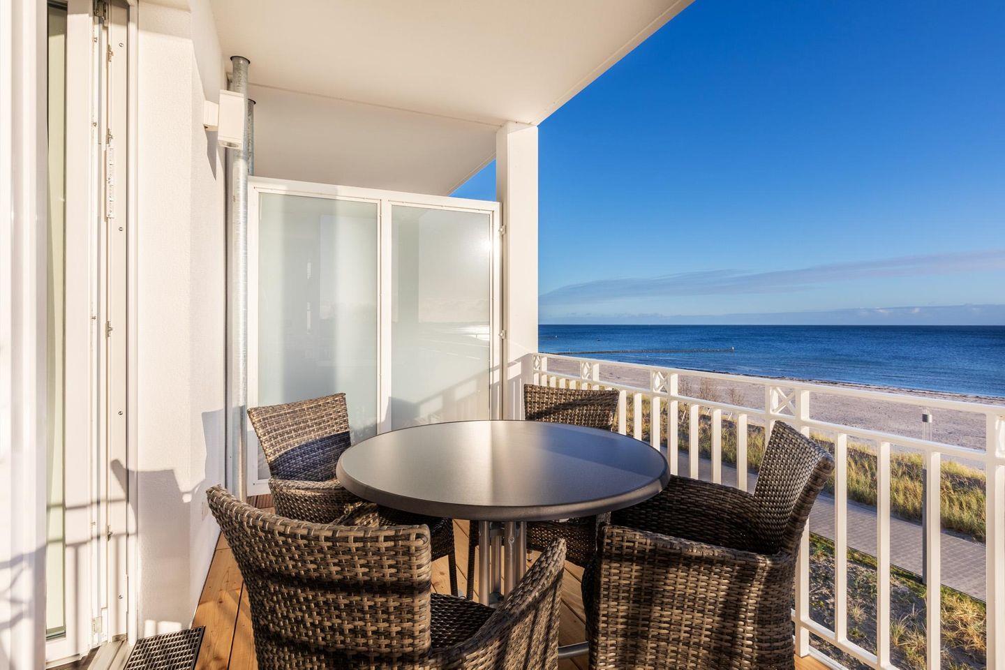 Entspannte und sonnige Stunden mit Panoramablick auf die See verbringt ihr auf dem mit Gartenmöbeln ausgestatteten Balkon in Süd-Ost-Lage. Der Balkon ist vom Wohnbereich aus begehbar.