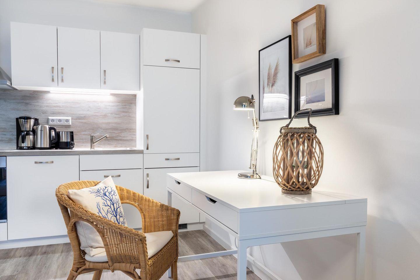 Das lichtdurchflutete und moderne Nichtraucher-Apartment ist barrierearm und verfügt über Fußbodenheizung, sonnenschutzverglaste und bodentiefe Fensterflächen, kostenfreies WLAN und eine voll ausgestattete offene Küche mit Geschirrspüler, Kühlschrank und Gefrierfach, Kaffeemaschine, Toaster, Wasserkocher, Herd mit Glaskeramikkochfeld und Backofen.
