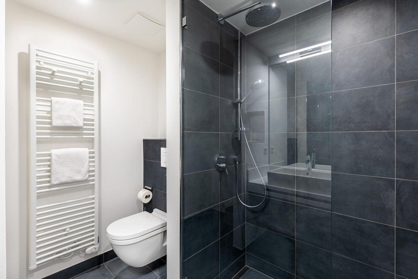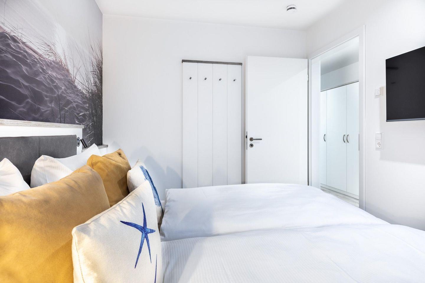Im modern-behaglichen Wohn-Essbereich befinden sich ein großer Flatscreen-TV (43 Zoll) und eine Doppelschlafcouch (1,60 x 1,95 m). Das separate, nach Nordwesten gelegene Schlafzimmer bietet hohen Schlafkomfort durch zwei moderne Boxspringbetten (0,90 x 2,00 m) und ist mit einem weiteren Flatscreen-TV (40 Zoll) sowie Kleiderschrank und Sitz-/Kofferbank ausgestattet. Das stilvolle Badezimmer verfügt über eine ebenerdige Regendusche, WC, Waschtisch mit Föhn, Handtuchheizkörper und Fußbodenheizung.