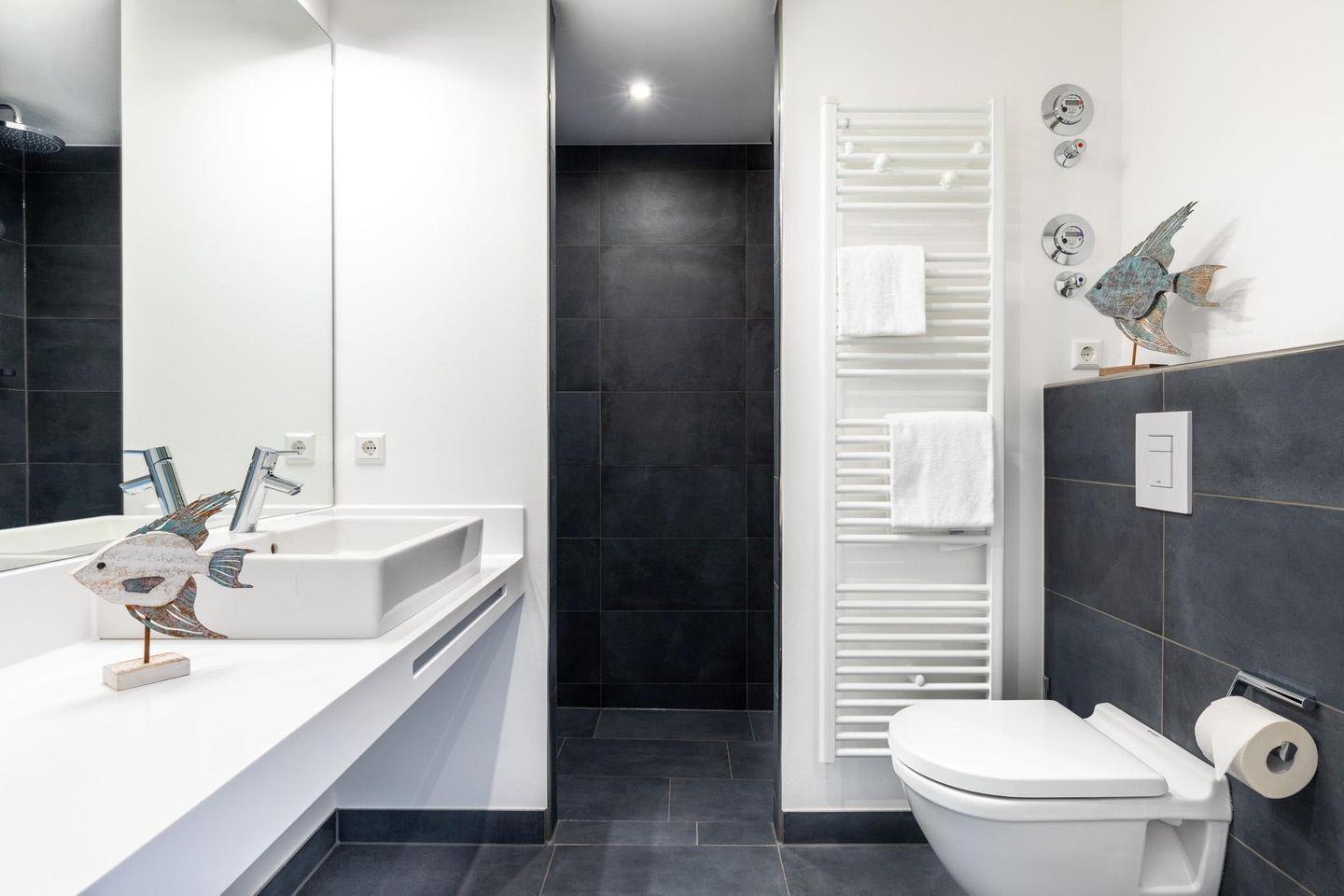 Im modern-behaglichen Wohn-Essbereich befindet sich eine Doppelschlafcouch (1,60 x 1,95 m) und ein großer Flatscreen-TV (43 Zoll). Das separate, nach Nordwesten gelegene Schlafzimmer bietet hohen Schlafkomfort durch zwei moderne Boxspringbetten (0,90 x 2,00 m) und ist mit einem weiteren Flatscreen-TV (40 Zoll) ausgestattet. Im Flur befinden sich Kleiderschrank und Sitz-/Kofferbank. Das stilvolle Badezimmer verfügt über eine ebenerdige Regendusche, WC, Waschtisch mit Föhn, Handtuchheizkörper und Fußbodenheizung.