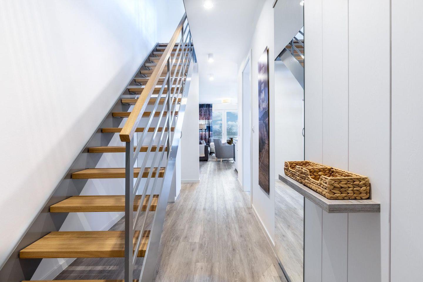 Das moderne und familienfreundliche Nichtraucher-Penthaus verfügt über Fußbodenheizung, sonnenschutzverglaste und bodentiefe Fensterflächen und kostenfreies WLAN. Im dritten Obergeschoss befindet sich die voll ausgestattete offene Küche mit Geschirrspüler, Kühlschrank und Gefrierfach, Kaffeemaschine, Toaster, Wasserkocher, Herd mit Glaskeramikkochfeld und Backofen. Auf dieser Ebene befindet sich auch der modern-behagliche Wohn-Essbereich mit Doppelschlafcouch (1,60 x 1,95 m) und großem Flatscreen-TV (43 Zoll) sowie das separate, nach Nordosten gelegene Schlafzimmer mit zwei modernen Boxspringbetten (0,90 x 2,00 m), einem weiteren Flatscreen-TV (40 Zoll), Kleiderschrank und Sitz-/Kofferbank. Das stilvolle Badezimmer auf dieser Wohnebene verfügt über eine ebenerdige Regendusche, WC, Waschtisch mit Föhn, Handtuchheizkörper und Fußbodenheizung und ist mit dem benachbarten Schlafzimmer direkt verbunden.