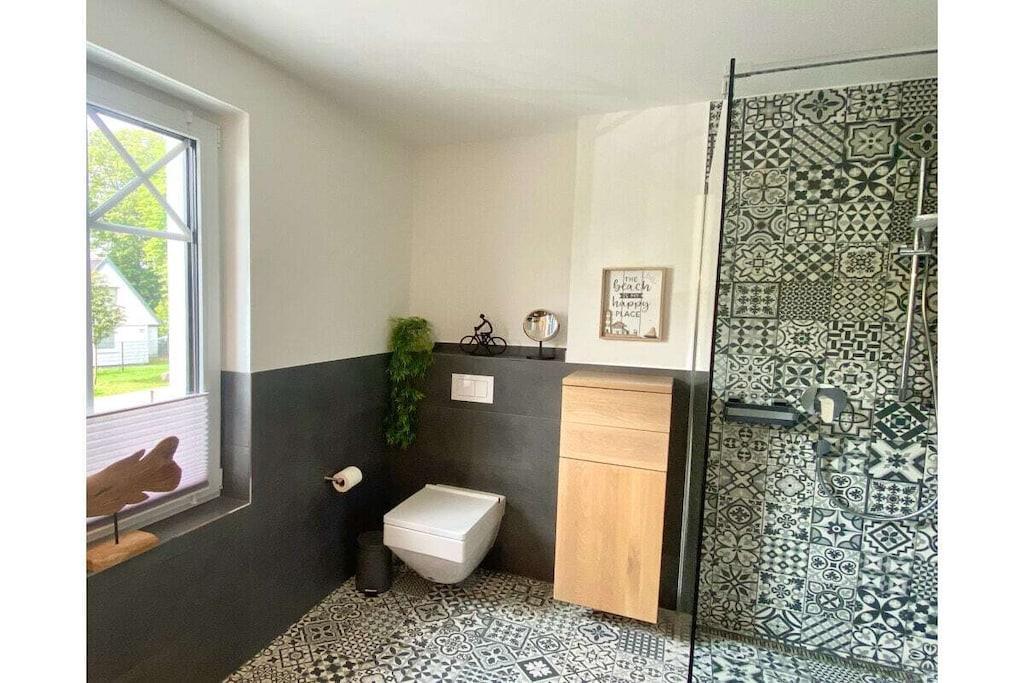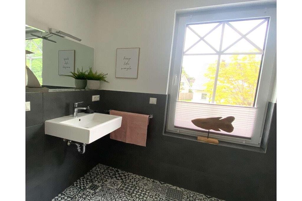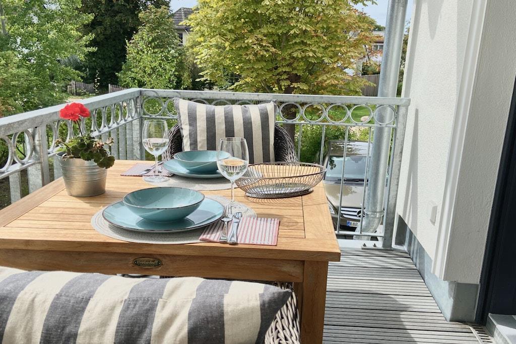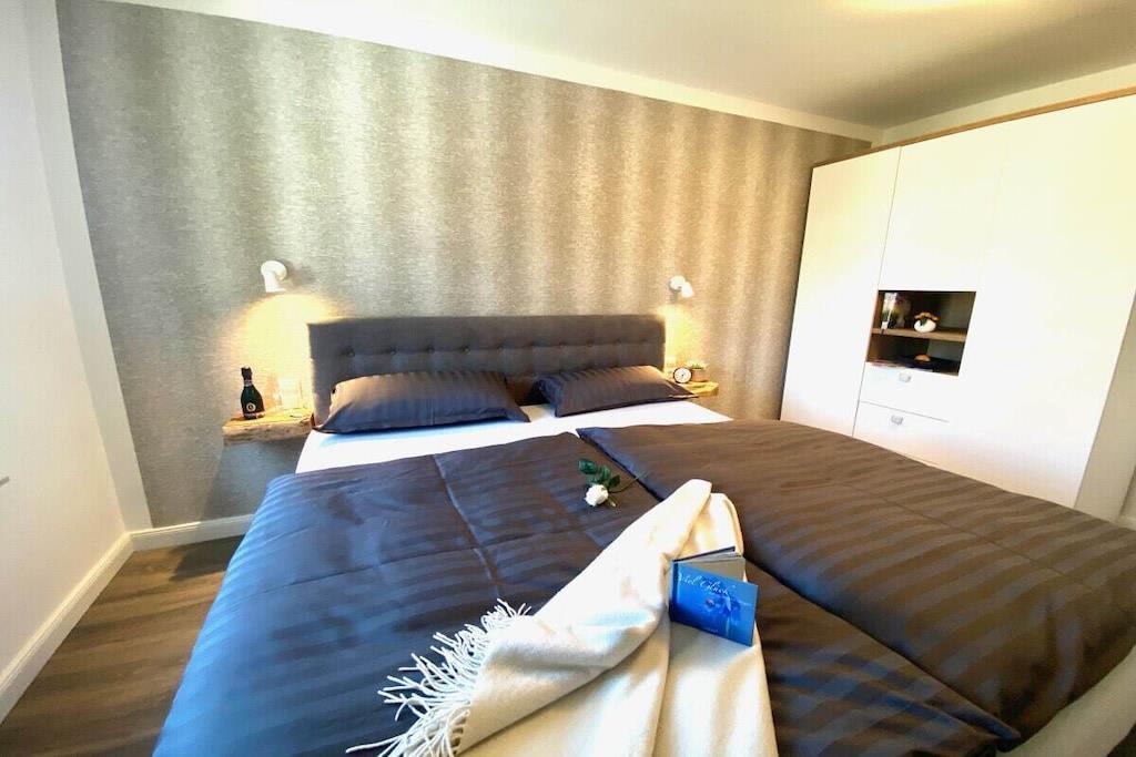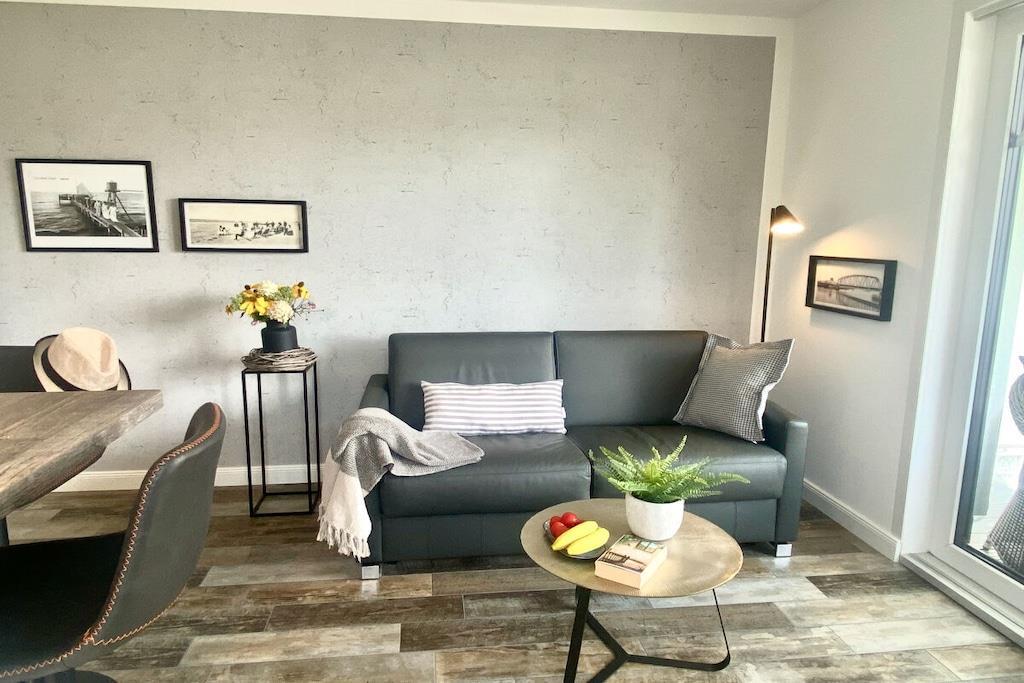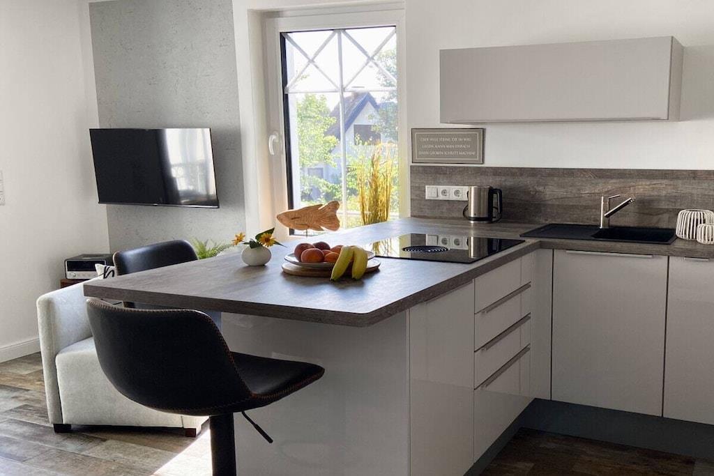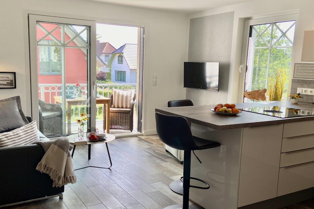 Stop! - You have found your temporary home - just 2 minutes from the beautiful Baltic Sea beach. The striking "Villa Rosenberg 43" with its 8 units was completed in mid-2024. Our apartment no. 4 (hallway, living area with open kitchen, bedroom, bathroom and storage room) on the mezzanine floor offers you all the amenities for a relaxing holiday for two. From the bright, fully equipped living-cooking-dining area with leather sofa, armchair, smart TV and lowboard as well as internet radio (including cell phone charging station) you have a direct view as well as access via the sliding door to the south-west facing sunny balcony and that makes this apartment an individual gem. We are happy to provide you with free WiFi for surfing with your iPad or smartphone. The balcony invites you to enjoy sunny moments for a hearty breakfast, a glass of wine in the evening or simply to end the day in a relaxed manner. The comfortable box spring bed (1.80 x 2.00 m) ensures restful sleep (preferably accompanied by the sound of the sea) and a relaxed start to the new day. Our spacious and modern bathroom with a window and walk-in shower complements the comfort and underlines the contemporary ambience of the apartment. The underfloor heating ensures cozy warmth in cool weather, with the hallway and living area equipped with tiled flooring and the bedroom with designer vinyl flooring. In addition to the versatile external blinds, the insect blinds on the windows protect against annoying animals. The additional storage room no. 4 in the adjacent building offers you space for bicycles and has an electrical connection. You can park your car on the property / parking space no. 4. You can get further insights by looking at our small photo gallery. - If we have aroused your interest, see for yourself the advantages of our apartment and contact us, also by phone. We look forward to hearing from you!