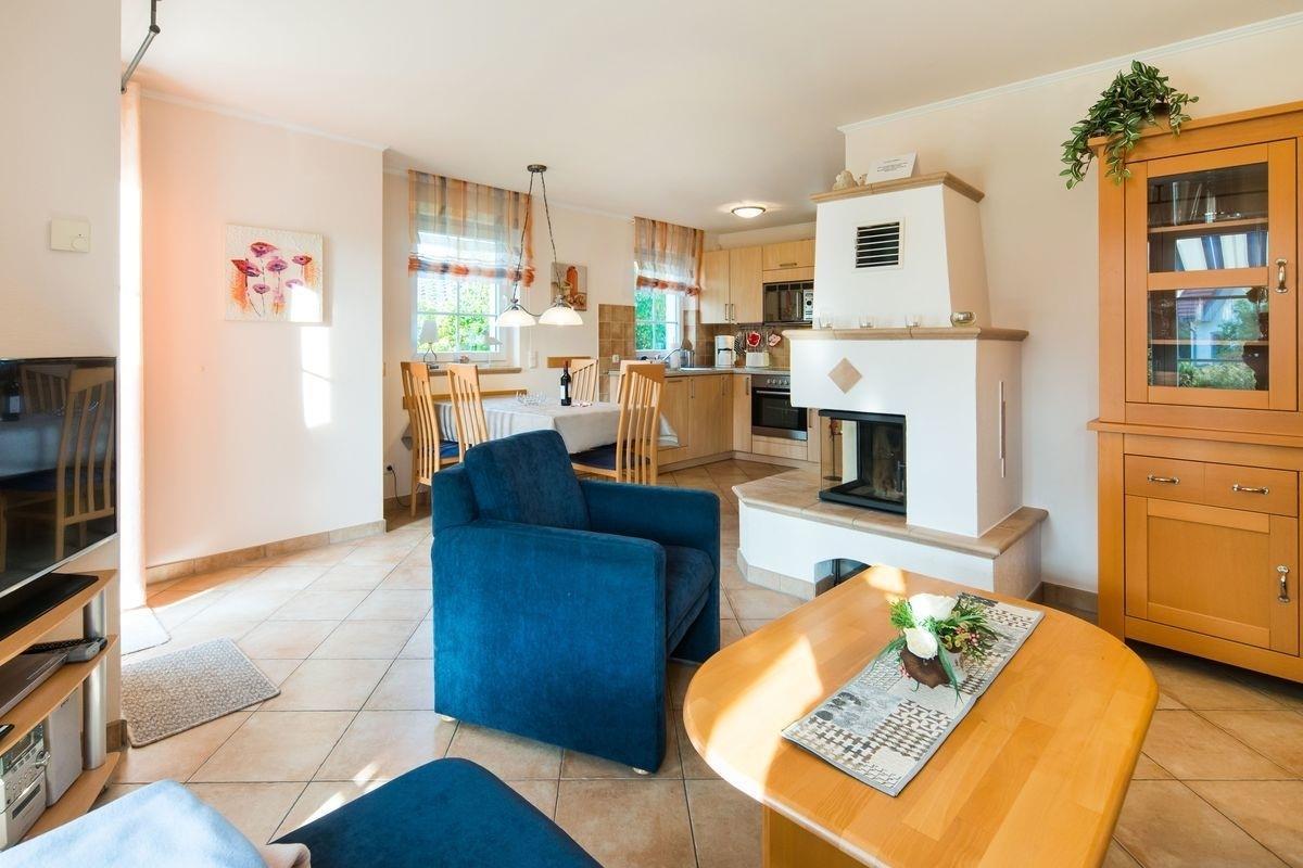 Insgesamt verfügt das Ferienhaus über ein äußerst gemütliches Wohnzimmer mit Kamin, eine voll ausgestattete Küche, die zum gemeinsamen Kochen einlädt, 3 Schlafzimmer (1x Doppelbett, 2x Einzelbetten) und 2 Badezimmer sowie über einen Abstell- und einen Waschraum.