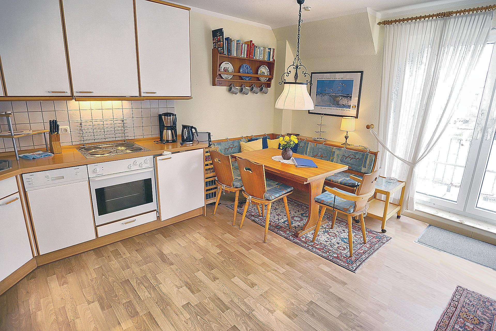 Die gut ausgestattete Küche besitzt unter anderem einen Kühlschrank, einen Herd zum Kochen und sogar eine Spülmaschine.