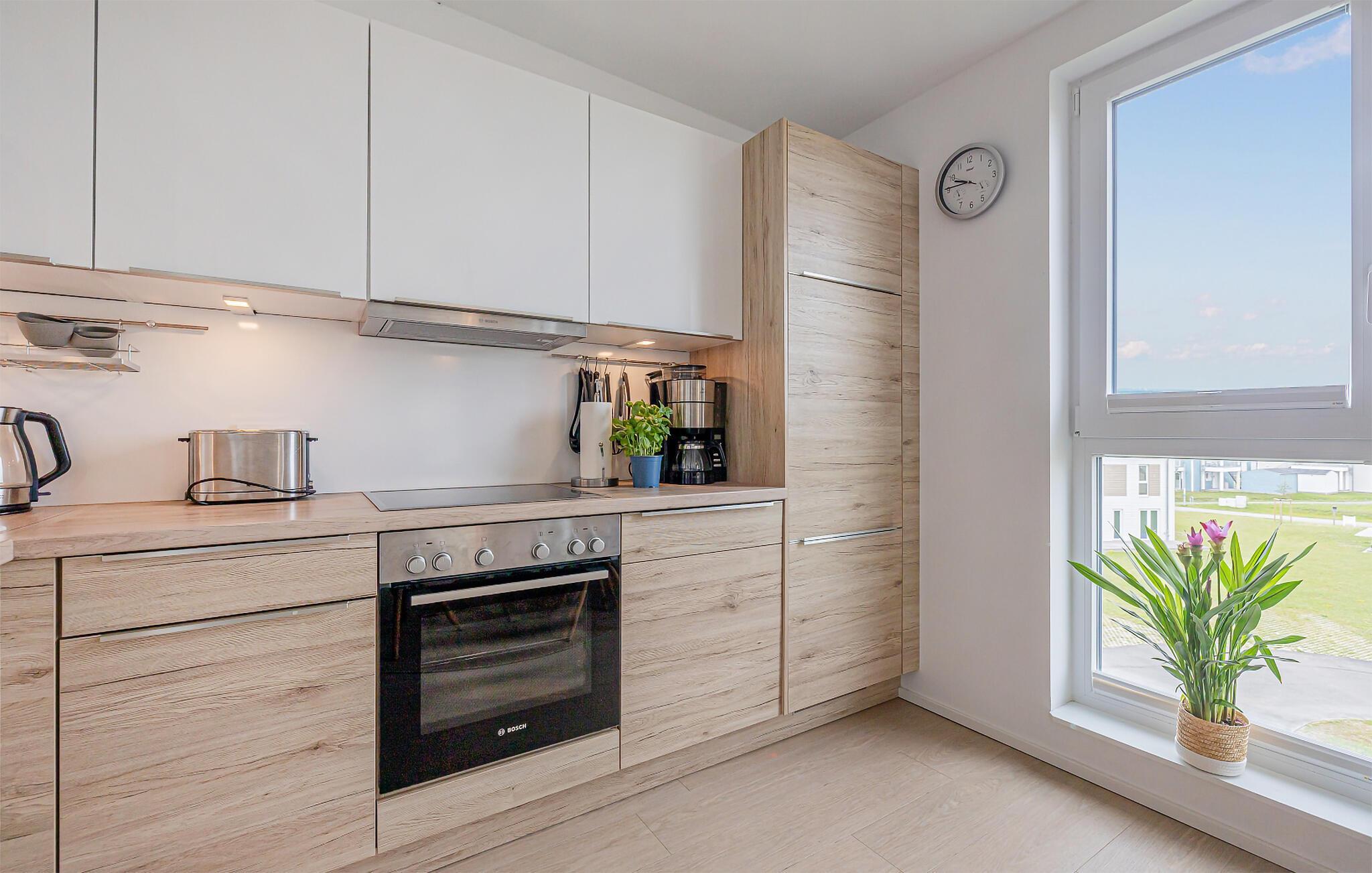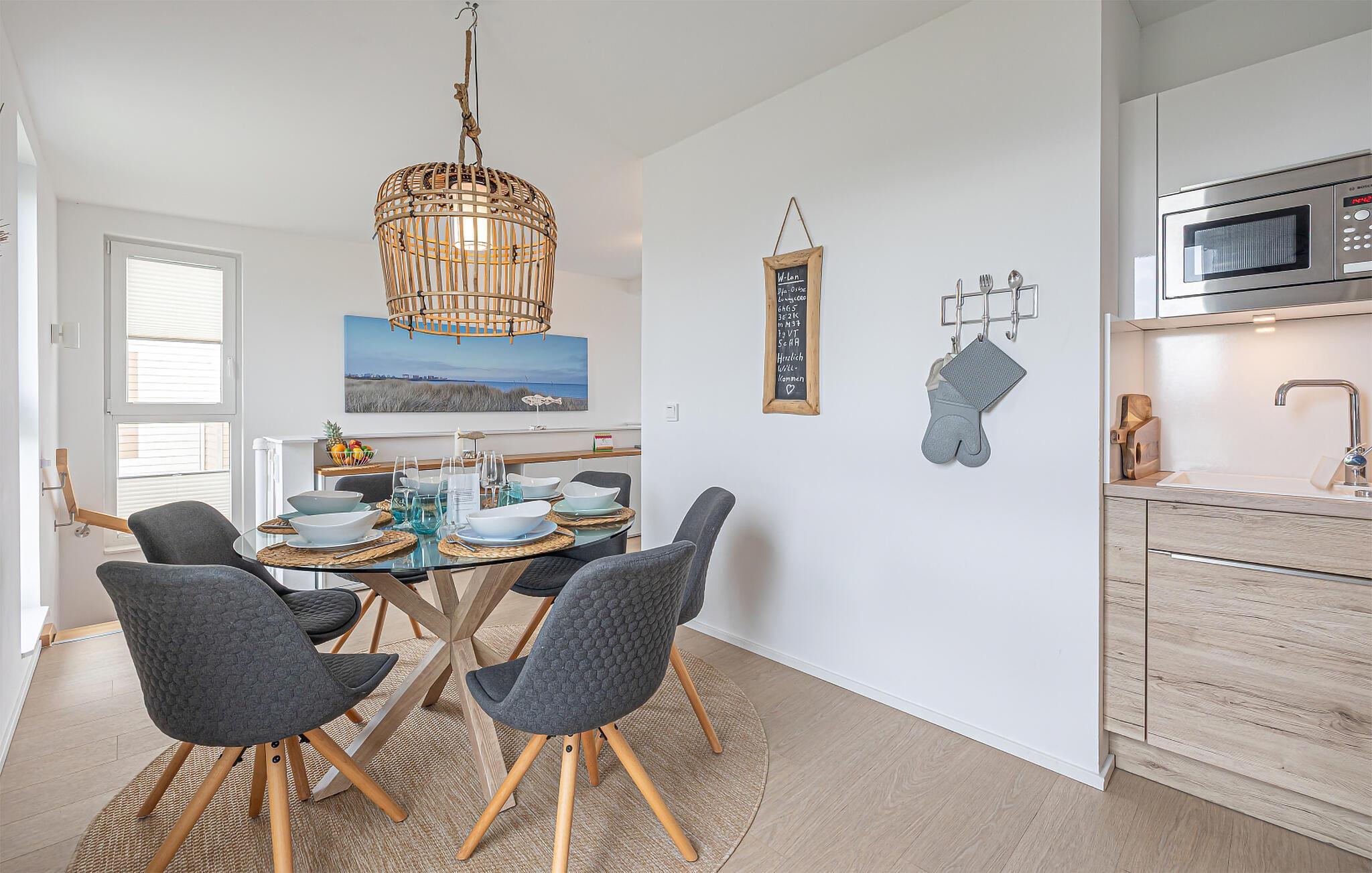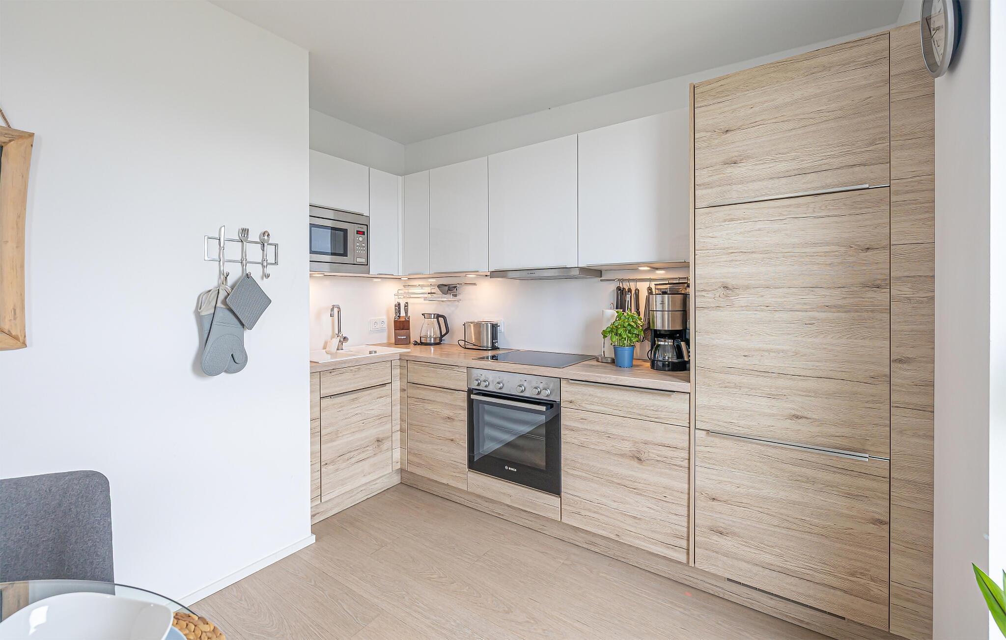 Det integrerede køkken med spiseplads til 6 personer er perfekt udstyret. På den store terrasse med dens sydvestlige orientering og drømmeudsigt kan I arrangere hyggelige grillaftener, slappe af i strandstolen eller nyde solen på liggestolen. Et andet badeværelse med ekstra toilet, håndvask og badekar byder på plads nok og alternative muligheder til flere personer og afrunder udstyret i denne velværeoase, som sikrer afslapning på ethvert tidspunkt af året. I finder jeres egen parkeringsplads foran ferielejligheden.