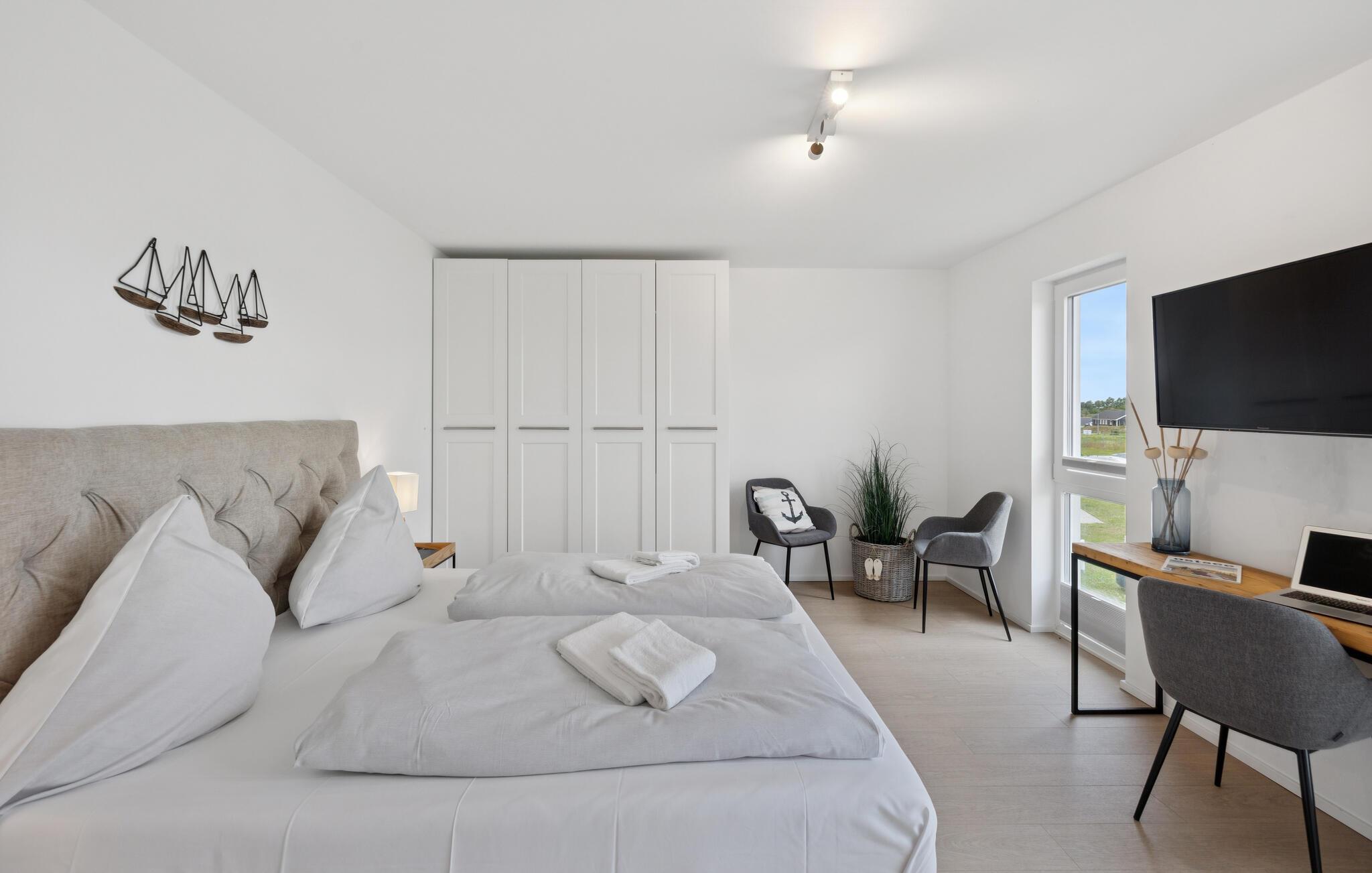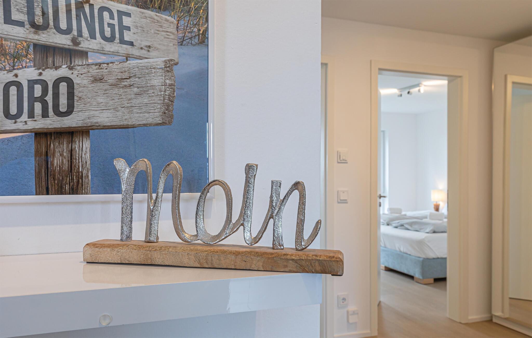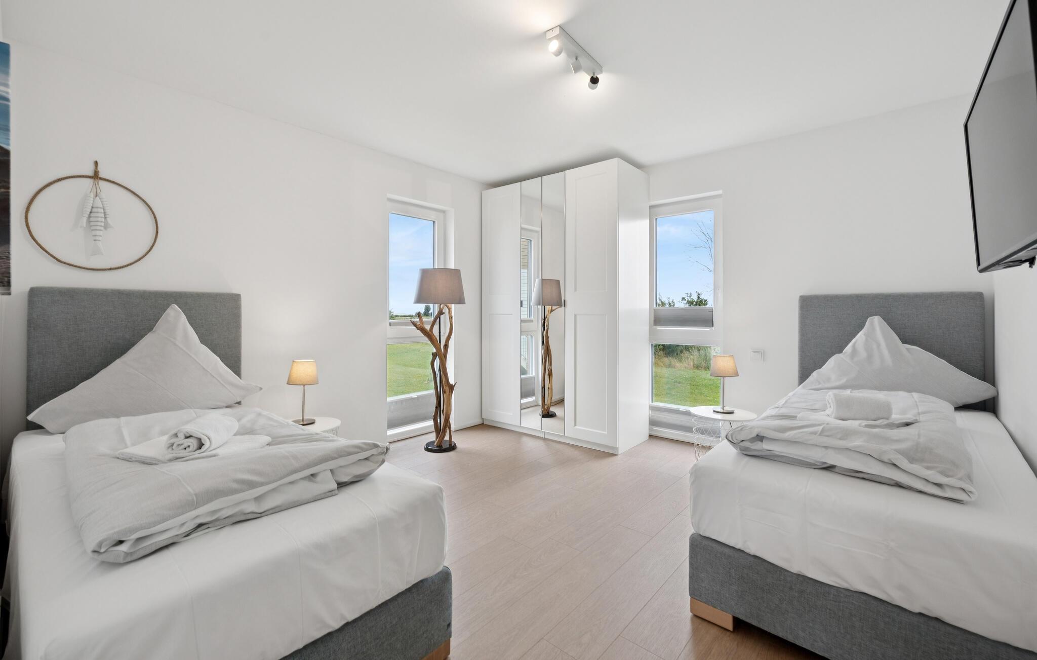Når I træder ind i ferielejligheden på første sal, begynder nedbremsningen fra allerførste øjeblik. Det åbner direkte ind i lejlighedens afslapningsområde. De tre soveværelser er placeret på denne etage, lige meget hvilket I vælger, kan I være sikker på en afslappende søvn. To soveværelser er udstyret med boxspring-dobbeltsenge og et fjernsyn. Det tredje soveværelse byder på to ekstra sovemuligheder på to adskilte boxspringsenge. OSTSEELOUNGE ORO muliggør ikke kun afslappende feriedage, men også muligheden for at arbejde hjemmefra. Uden at ofre komforten blev to arbejdsstationer indlejret i ferielejlighedens overordnede koncept. Der er også et veludstyret badeværelse på denne etage med bruser i gulvniveau og infrarød sauna.