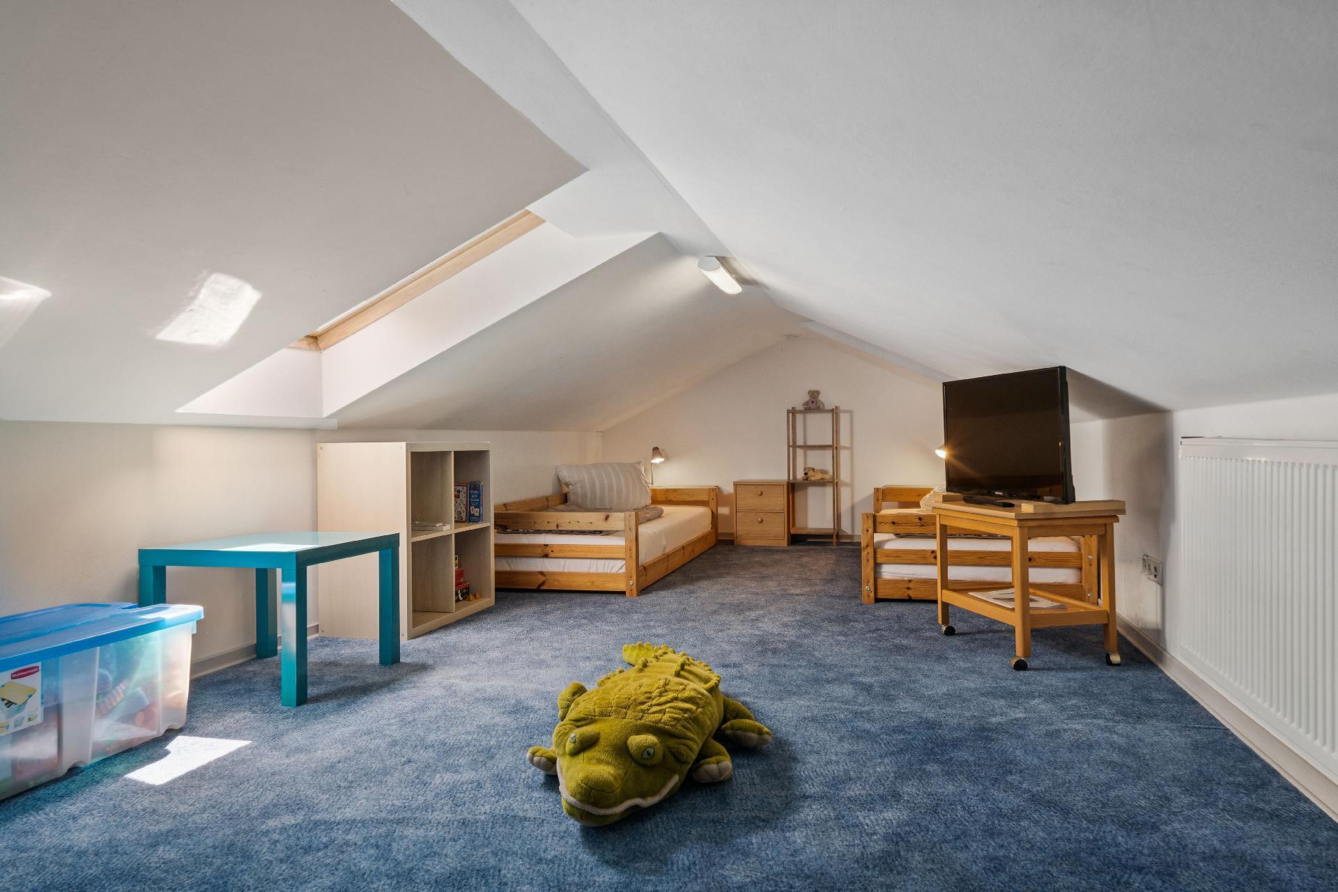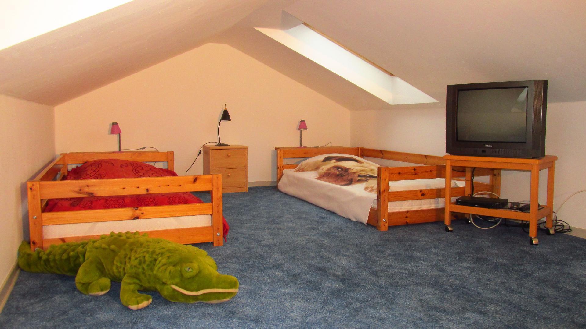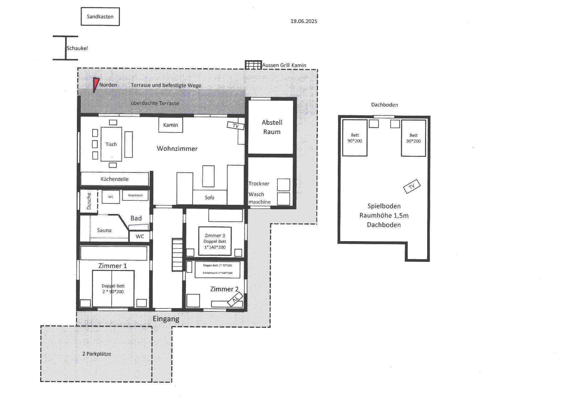 Inside, you will find a large living area with a cosy wood-burning stove, a real leather couch and a 42-inch LED TV, ideal for relaxing evenings. The centrepiece of the house is the wellness bathroom with a sauna that can accommodate up to four people, complemented by a guest WC. Three tastefully furnished bedrooms and a play loft provide ample space for peace and privacy. Underfloor heating, a comprehensive selection of games and a fibre-optic WLAN connection add to the sense of well-being. The kitchen is fully equipped, and a storage room with washing machine and tumble dryer round off the offer.