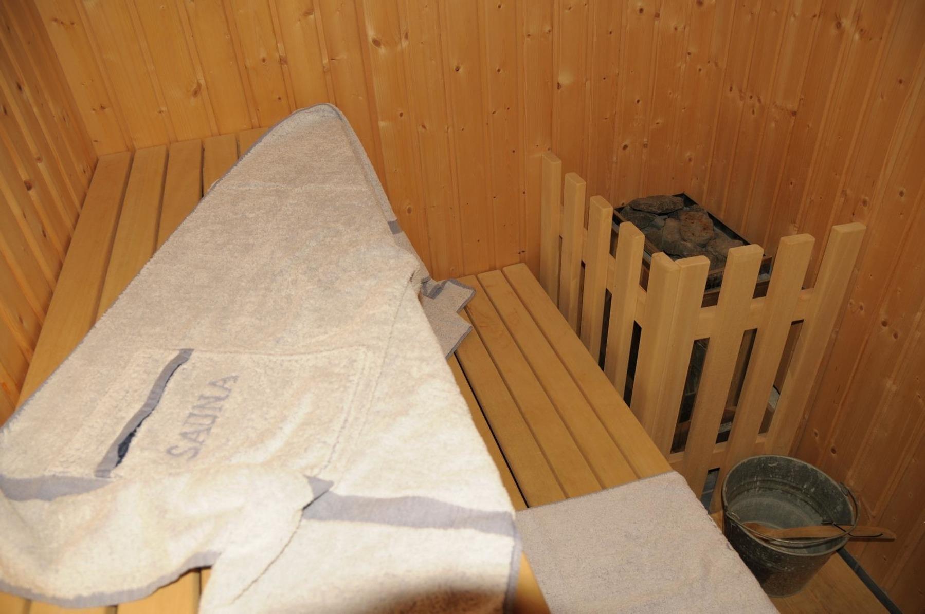 Das Badezimmer bietet Ihnen Dusche, Eckbadewanne und Sauna.