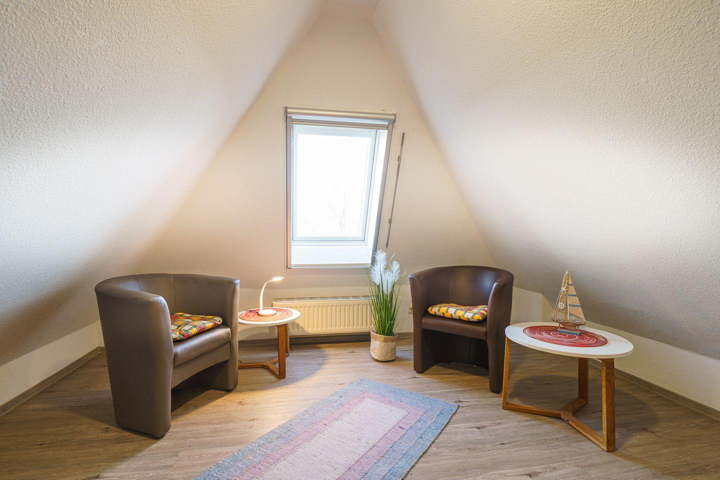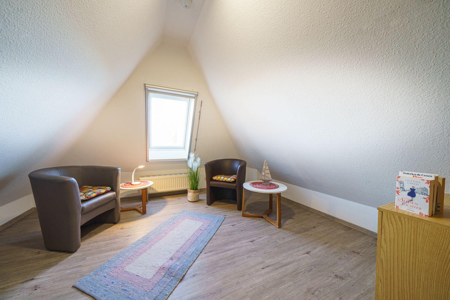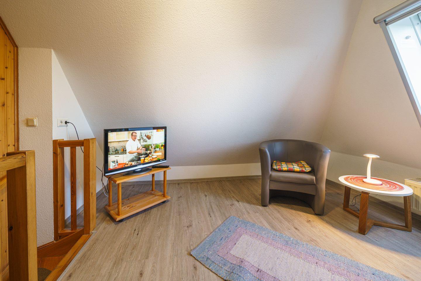 Für gesellige Abende bietet das helle Wohnzimmer eine einladende Sofaecke, ideal für entspannte Filmabende mit dem vorhandenen TV und DVD-Spieler. Zwei Fernseher sorgen dafür, dass jeder seinen Lieblingsfilm genießen kann. WLAN ist selbstverständlich vorhanden, sodass Sie auch während Ihres Urlaubs im Internet surfen können.