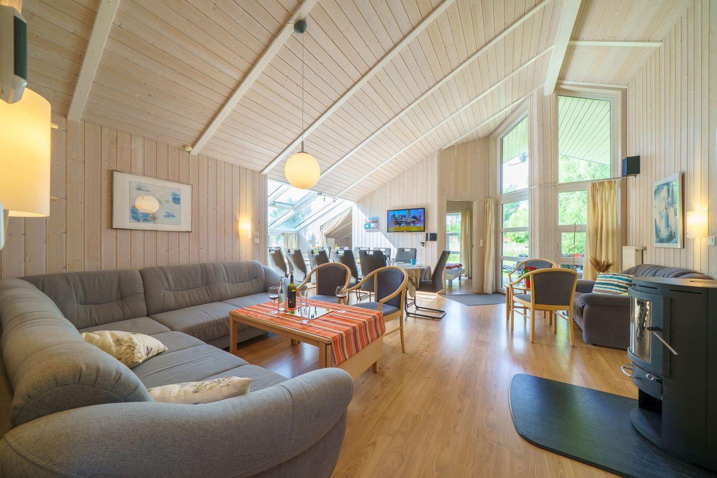 Dieses ansprechende Ferienhaus „Kum Weer“ wurde im dänischen Stil erbaut und befindet sich auf einem ufernahen Grundstück in zweiter Reihe im Wasser- und Landschaftspark in Otterndorf. In gemütlicher Atmosphäre können Sie hier so richtig entspannen und Ihren Urlaub genießen. Nach einem langen Spaziergang im Park oder einer Fahrradtour entlang des Elbufers können Sie sich im Whirlpool mit Therapiedüsen für Unterwassermassage aufwärmen und herrlich entspannen. Die skandinavische Sauna kurbelt Ihren Kreislauf an. Der mit Wintergarten und Atelierfenster versehene, große Wohnraum ist mit einem gemütlichen Kaminofen, 2 kompletten Sitzgruppen und einem Esstisch für 12 Personen ausgestattet. Hier ist der harmonische Treffpunkt während Ihres Aufenthaltes, wo ausreichend Platz für eine Großfamilie oder mehrere Familien vorhanden ist. Angrenzend die offene, mit modernen Geräten ausgestattete Küche. Die "Morgenterrasse" ist 12 m² und vom Wohnraum aus gelangt man auf die 21 m² große, südseitig gelegene, teils überdachte Sonnenterrasse.