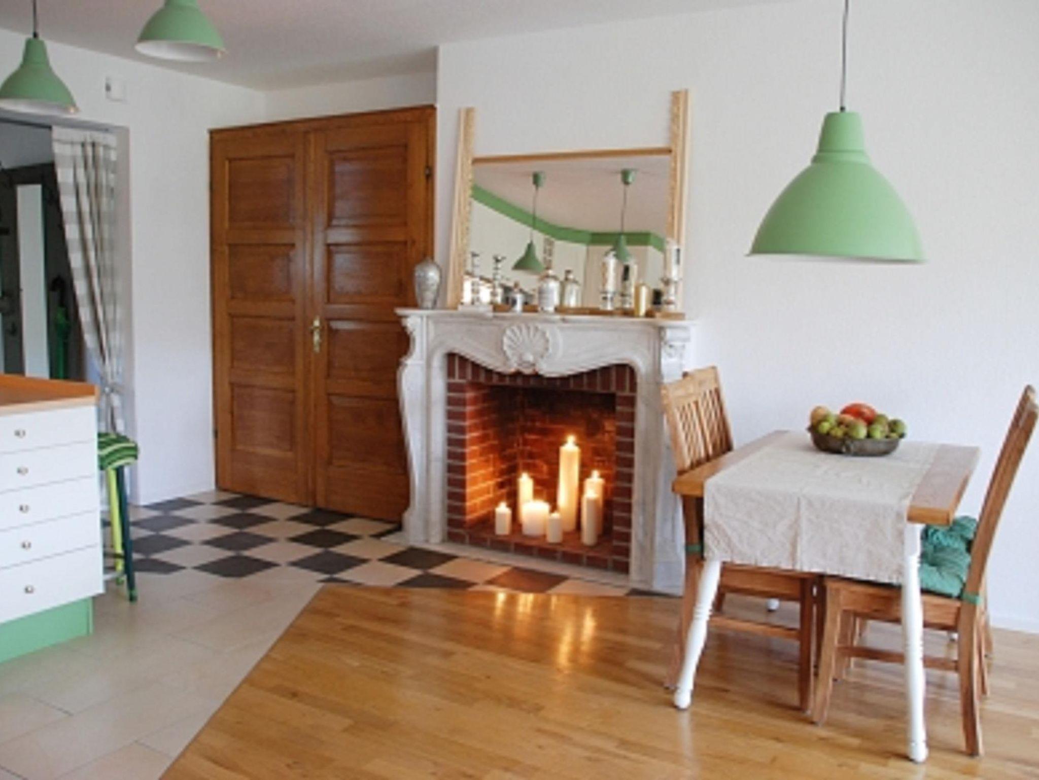 Das Ambiente im gesamten Raum wird beeinflusst durch den offenen Kamin, der Abends im Kerzenschein erstrahlt.