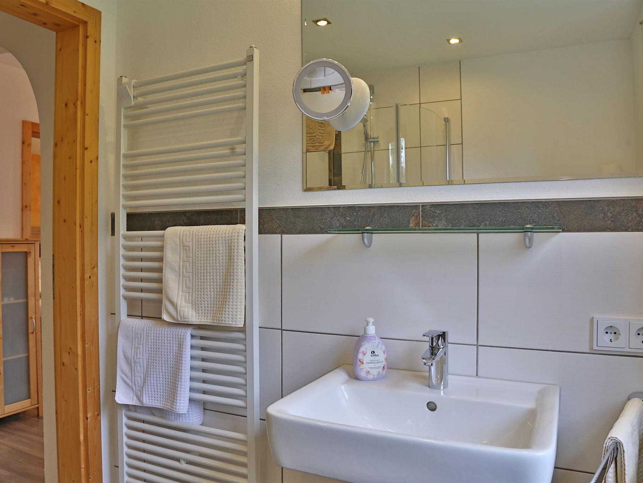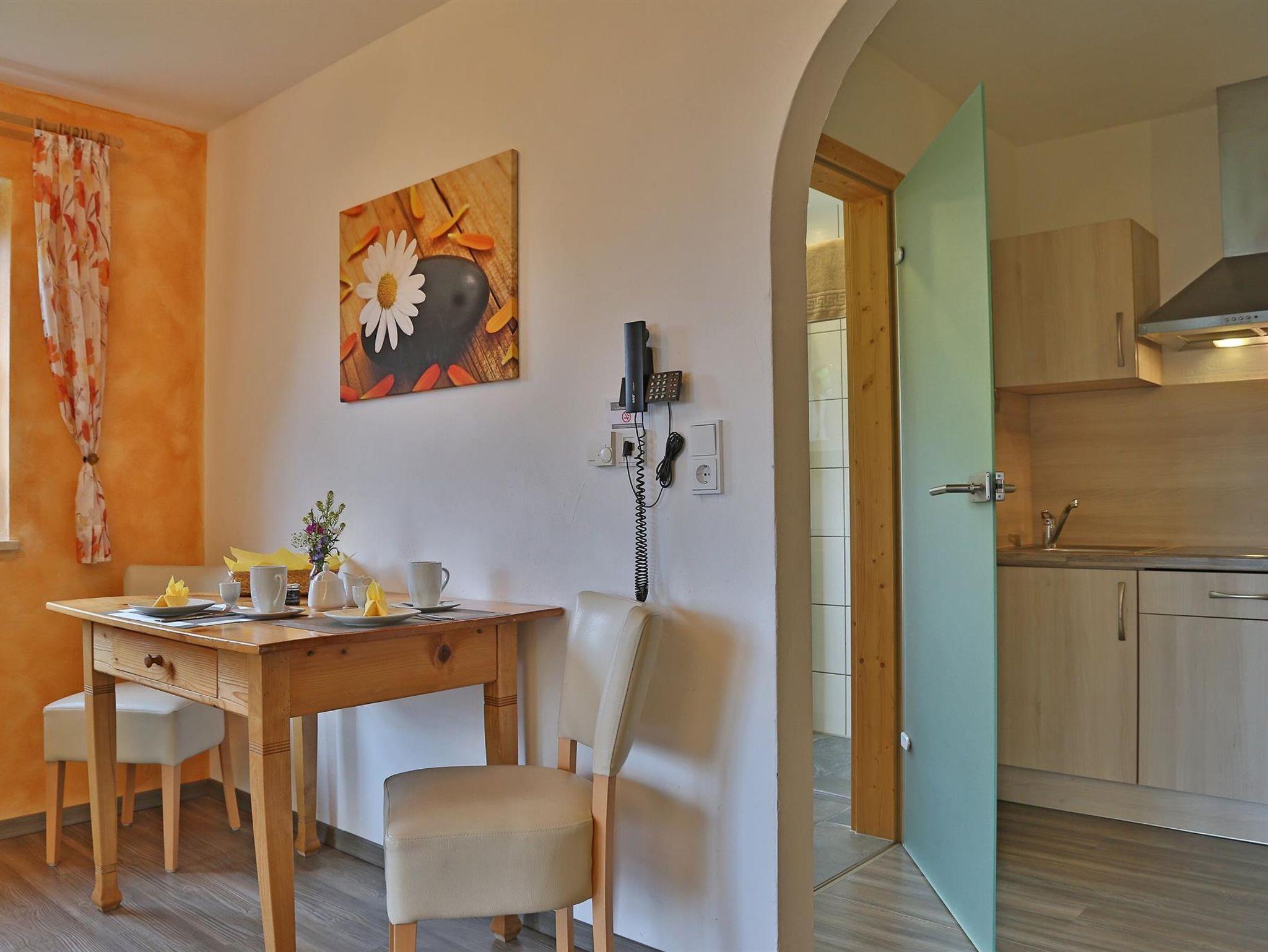 Die 4-Sterne-Ferienwohnung (Nichtraucher) befindet sich im 1.OG und bietet auf 50 Quadratmetern Platz für 2 Erwachsene und 1-2 Kind(er). Sie verfügt über einen Südbalkon mit Balkonmöbeln. Küche mit Geschirrspülmaschine, Cerankochfeld, Umluftofen mit Grill und Mikrowelle. Das Schlafzimmer ist mit Massivholzmöbeln, erhöhtem Doppelbett und einem Kleiderschrank ausgestattet. Der zweite kleine Schlafbereich verfügt über ein Einzelbett. Das Wohnzimmer ist mit neuen Polstermöbeln (Schlafsofa), einem Massivholzschrank und einem Essbereich eingerichtet. HD-TV (Kabel Digital), DVD, Radio. Neuwertiges Badezimmer/WC mit Handtuchwärmer, Haartrockner und kostenlosen Pflegeprodukten. Freie Nutzung von WLAN, Telefon, Bettwäsche und Handtücher. Garagennutzung auf Anfrage für 5,-€ pro Tag. Saunahandtücher für 7,-€ pro Stück erhältlich.