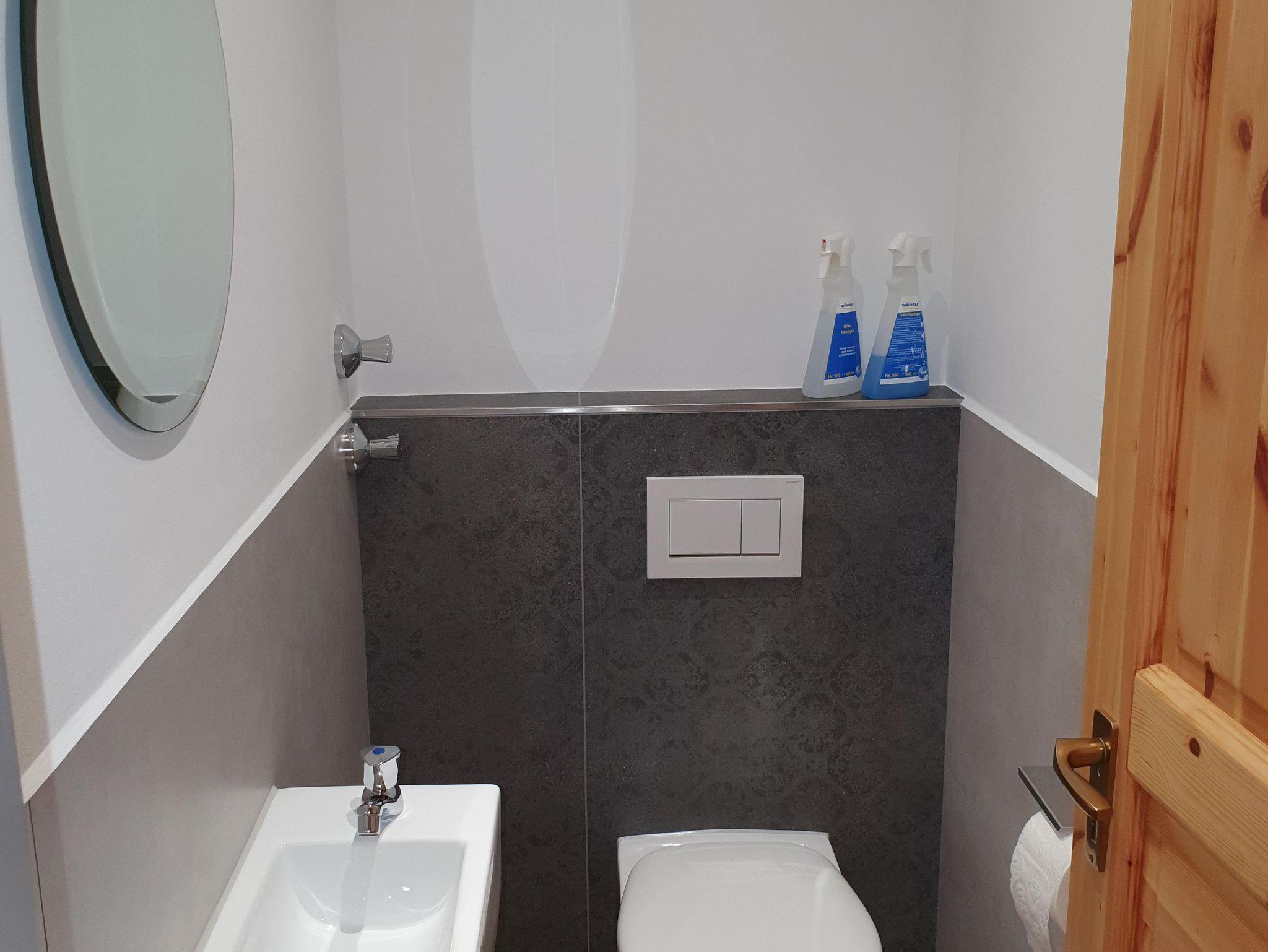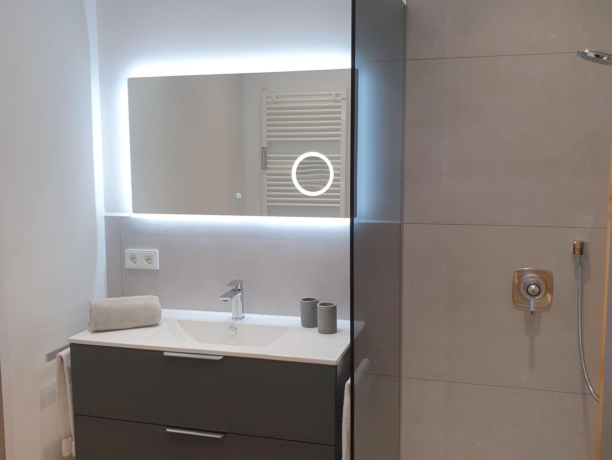 Das Badezimmer hat eine Dusche, Waschbecken, Kosmetikspiegel und Haartrockner. Separates WC.Im Schlafzimmer stehen die Betten hinereinander. Der 2. Schlafbereich ist vom Wohnbereich abgetrennt. Es gibt ein Boxspringbett das man einzeln oder zusammen stellen kann.