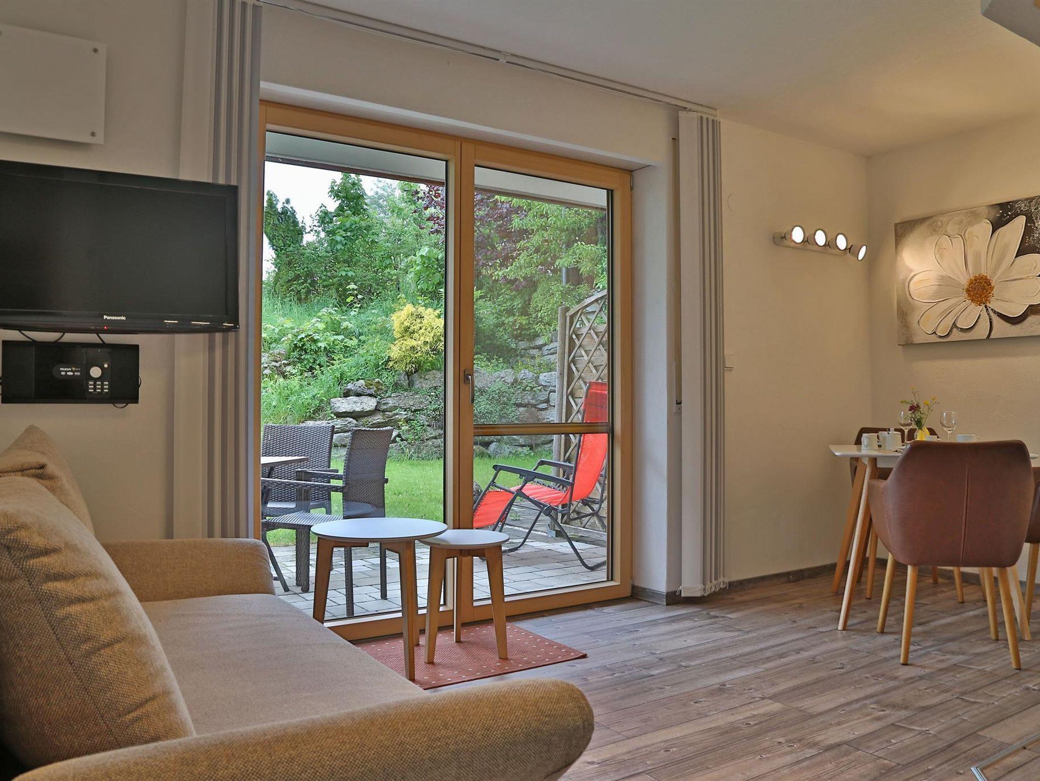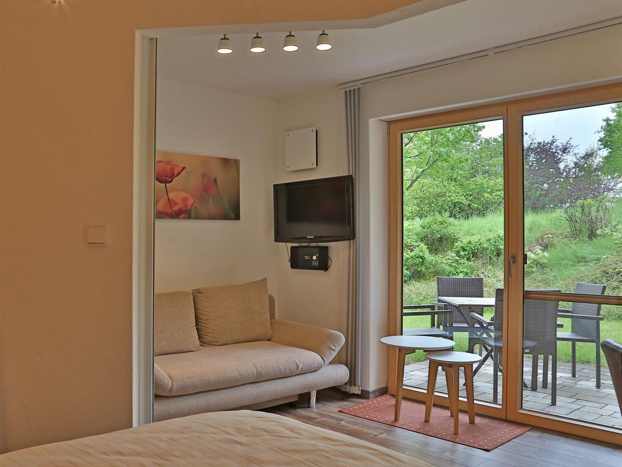 Die 4-Sterne-Ferienwohnung (Nichtraucher) befindet sich im EG und bietet auf 35 Quadratmetern Platz für 2 Erwachsene und ein Kind. Sie verfügt über eine Terrasse mit Gartenmöbeln. Küche mit Geschirrspülmaschine, Cerankochfeld, Umluftofen mit Grill und Mikrowelle. Das Schlafzimmer ist mit Massivholzmöbeln, kombinierbarem Doppelbett und einem Kleiderschrank ausgestattet. Das Wohnzimmer ist mit neuen Polstermöbeln (Schlafsofa) und einem Essbereich mit Zugang zur Terrasse eingerichtet. HD-TV (Kabel Digital), DVD, Radio. Neuwertiges barrierefreies Badezimmer/WC mit Handtuchwärmer, Haartrockner und kostenlosen Pflegeprodukten. Freie Nutzung von WLAN, Telefon, Bettwäsche und Handtücher. Garagennutzung auf Anfrage für 5,-€ pro Tag. Saunahandtücher für 7,-€ pro Stück erhältlich.