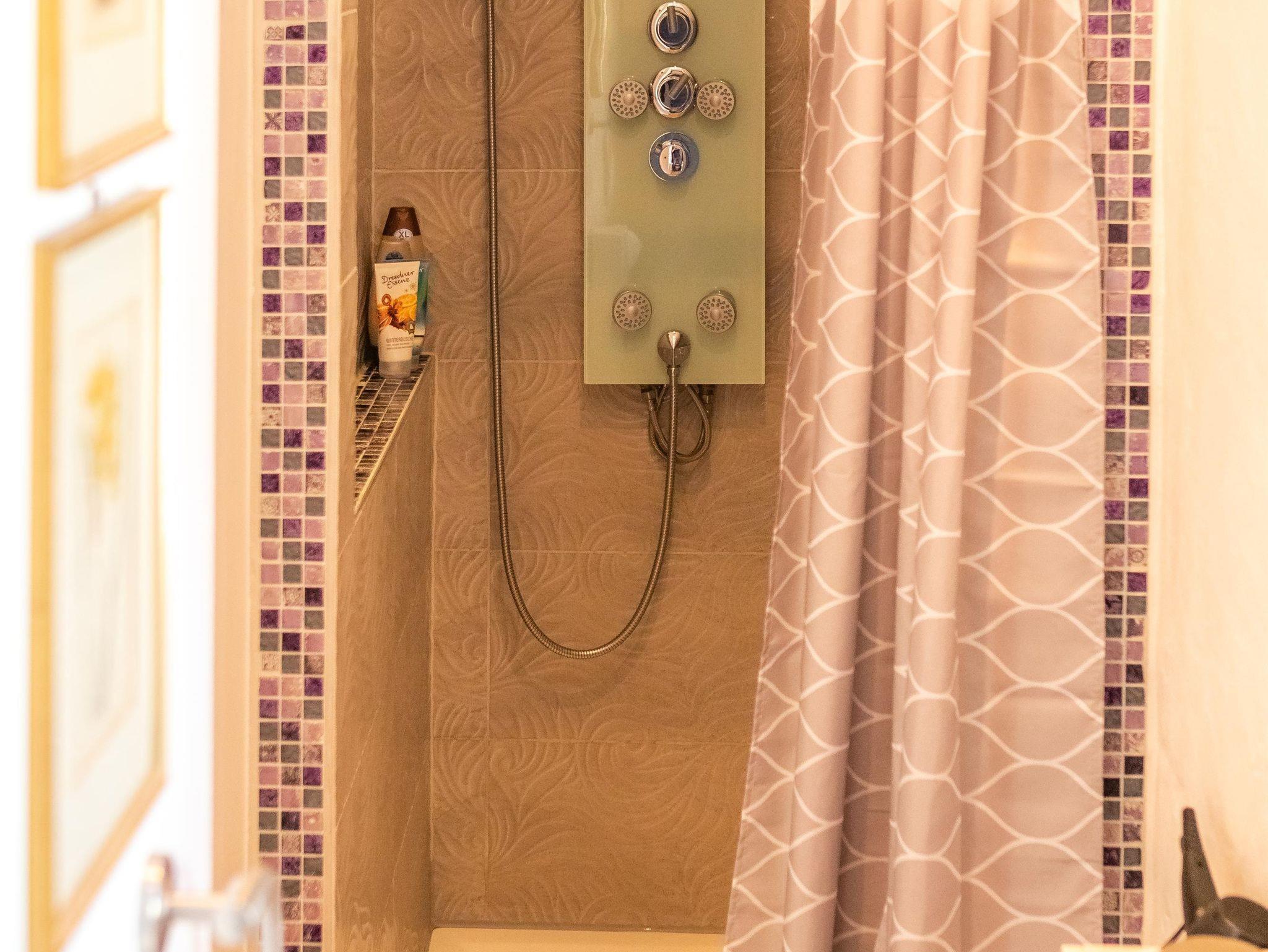 • modernes Bad mit Fenster und ebenerdiger Dusche, WC