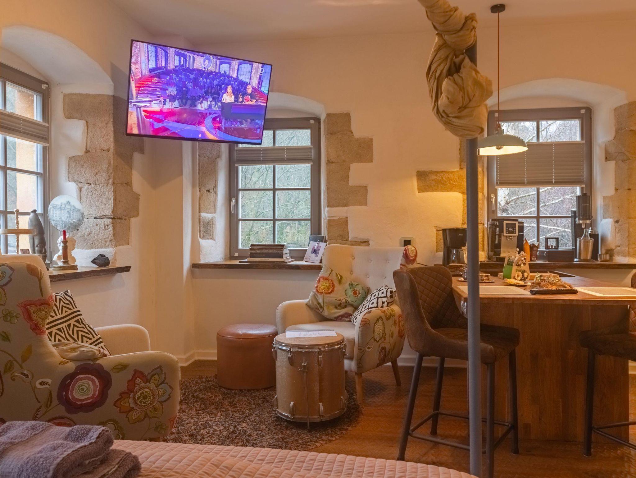 Unsere Ferienanlage liegt direkt an der Schmalspurbahn und am Berg Oybin mit einem 1 ha großen Garten und 400 m vom Kopfbahnhof Oybin entfernt. In unserem Holzwerk Oybin haben wir 6 individuelle Appartements im Landhausstil eingerichtet. Appartment Römerlager, Königszimmer, Himmelreich, Storchennest und Schorn sind über eine Treppe erreichbar. Das Haus selbst ist 250 Jahre alt und war eine Brettmühle, daher der Name Holzwerk. Das Gebäude wurde von uns nachhaltig und ökölogisch saniert. Appartment Römerlager, Königszimmer, Himmelreich, Schorn und Storchennest verfügen über einen Kamin und moderne Bäder. 2 Appartments (Storchennest und Himmelreich) haben einen Wirlpool, der für Gäste zur Verfügung steht. Im Sommer vom 01.06 bis 30.09 kann der Jakusy im Garten benutzt werden. Der Garten kann jederzeit zum chillen, toben, grillen etc. von unseren Gästen genutzt werden. Für Groß und Klein gibt es ein Trampolin, Federballnetz einen Buhlplatz, Sandsonnenplatz sowie einen Kräuter- und Gemüsegarten. Frühstück und Abendessen bieten wir nach Absprache an.