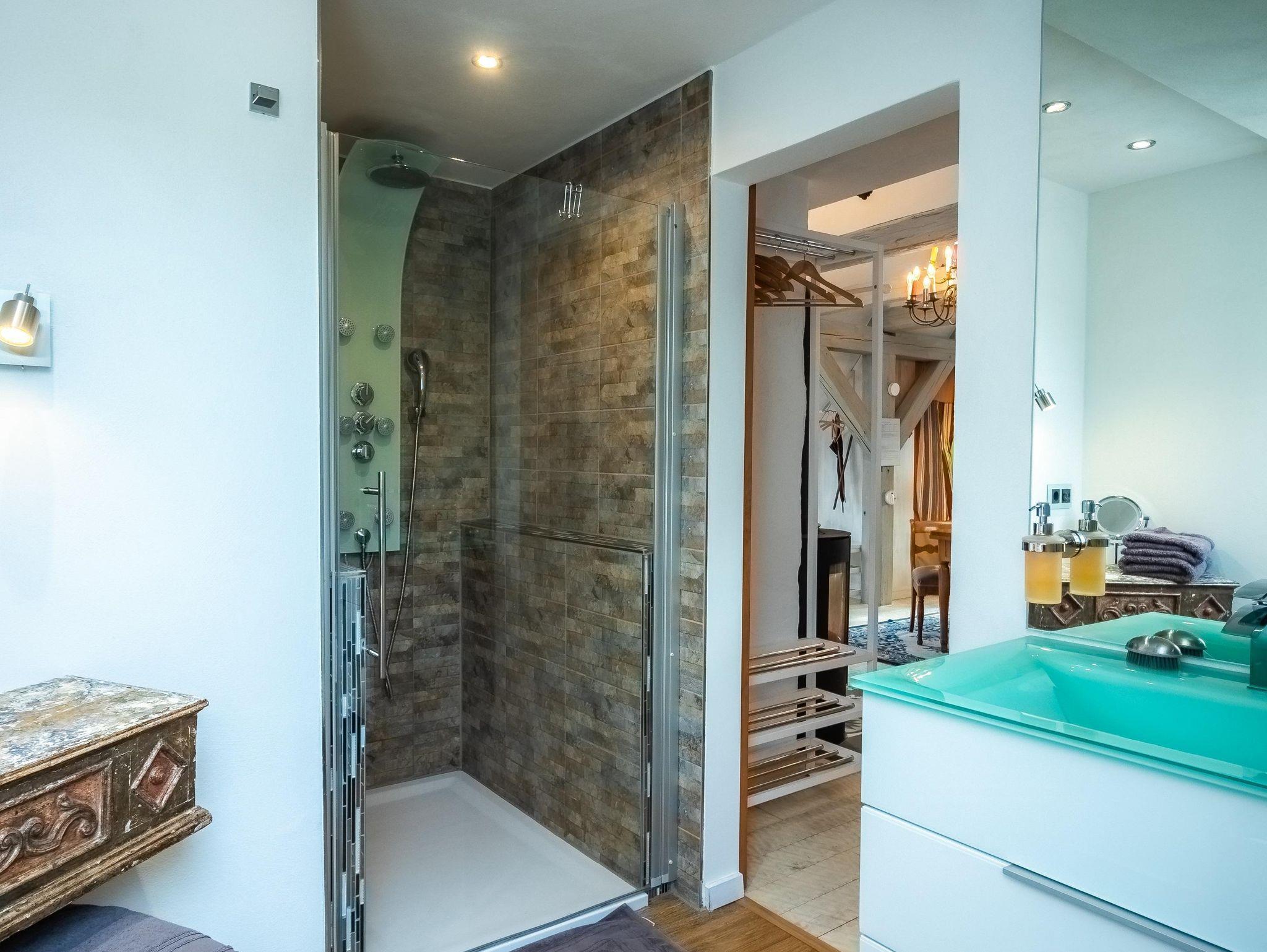 • modernes Bad mit Fenster und ebenerdiger Dusche, WC